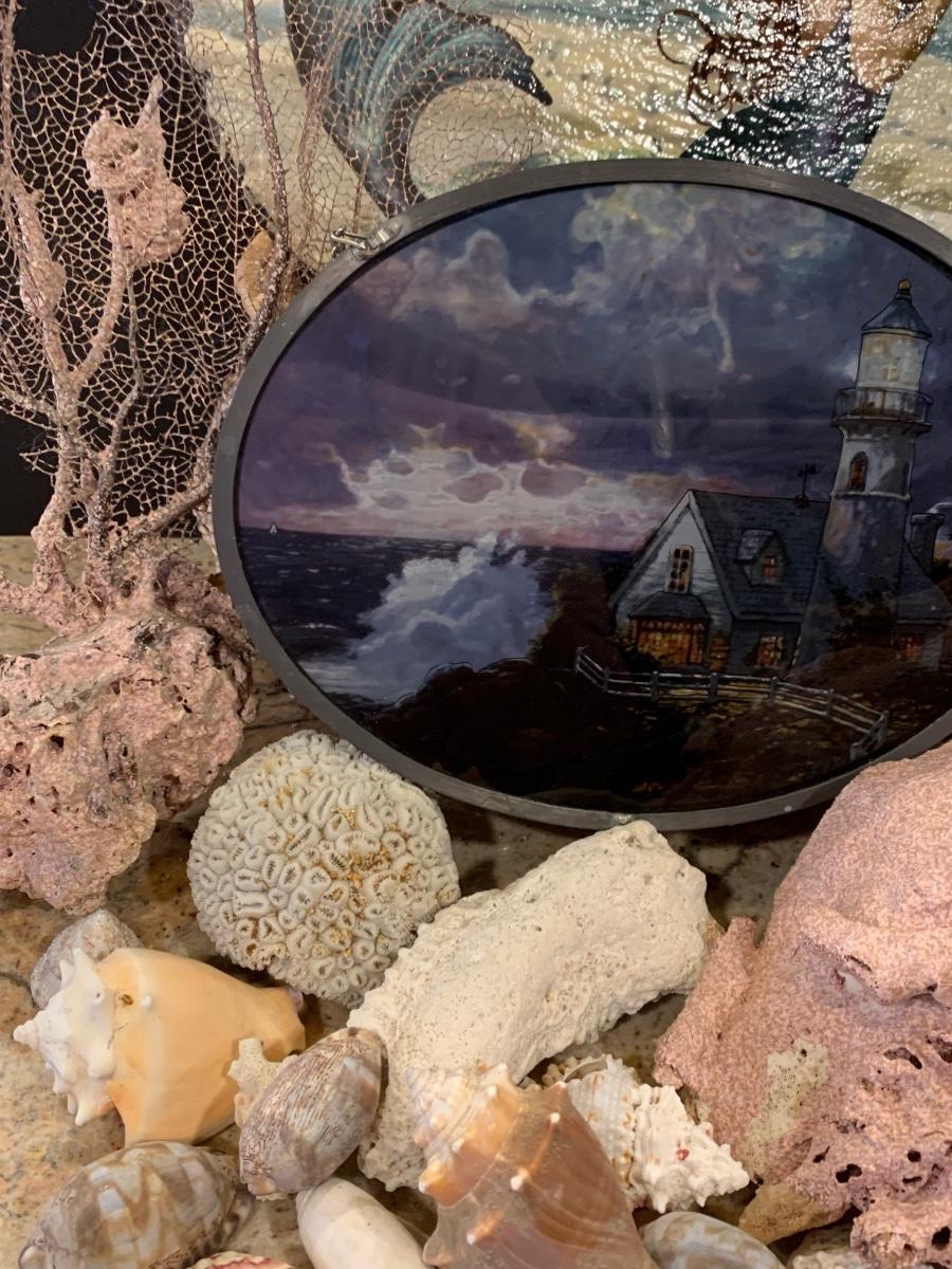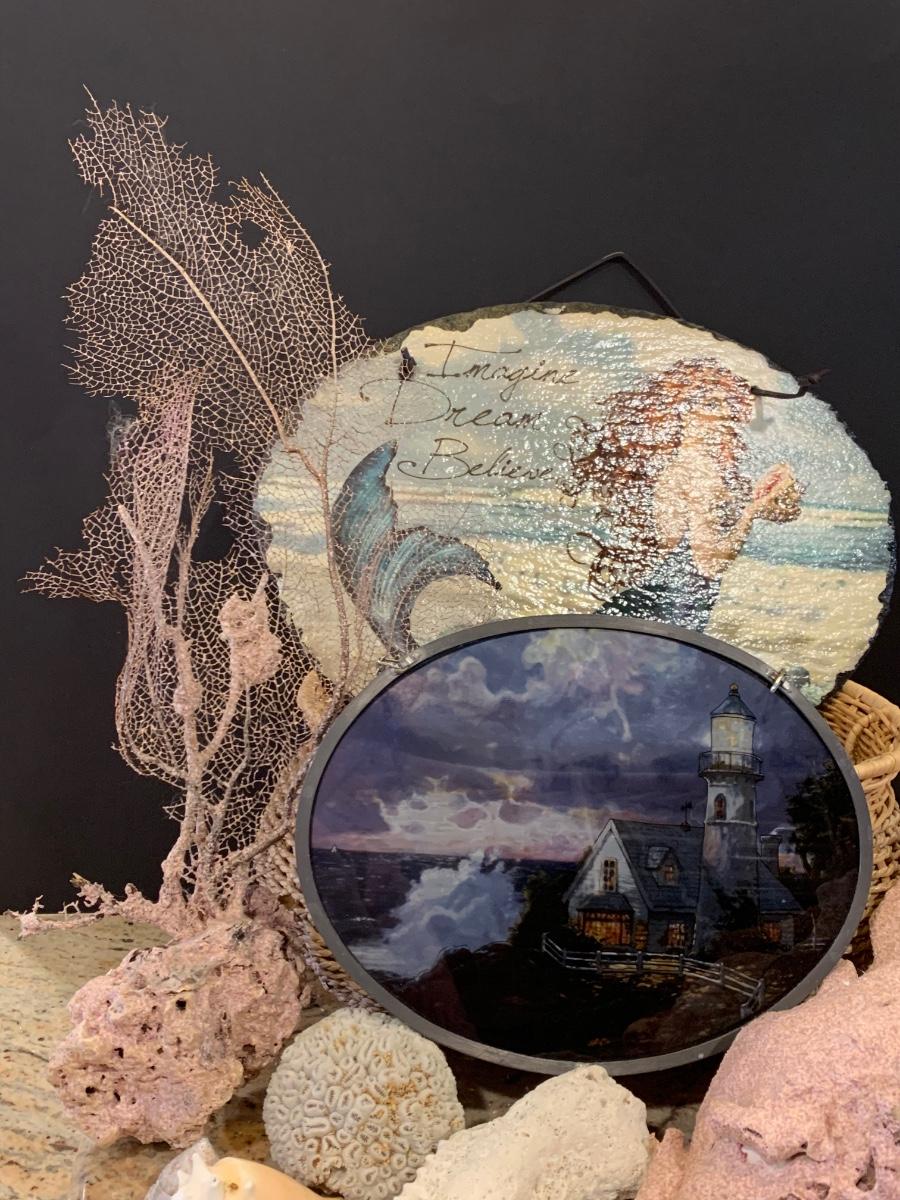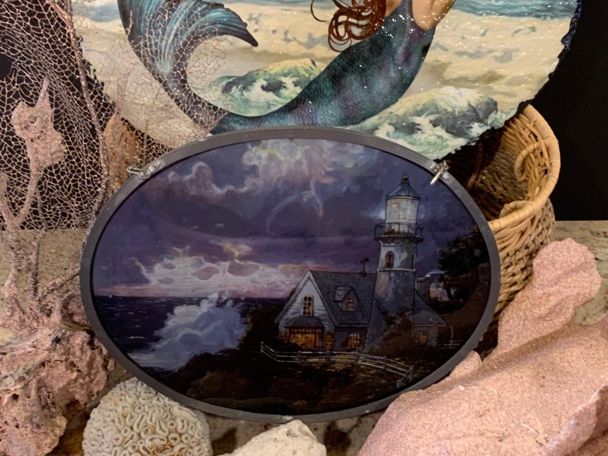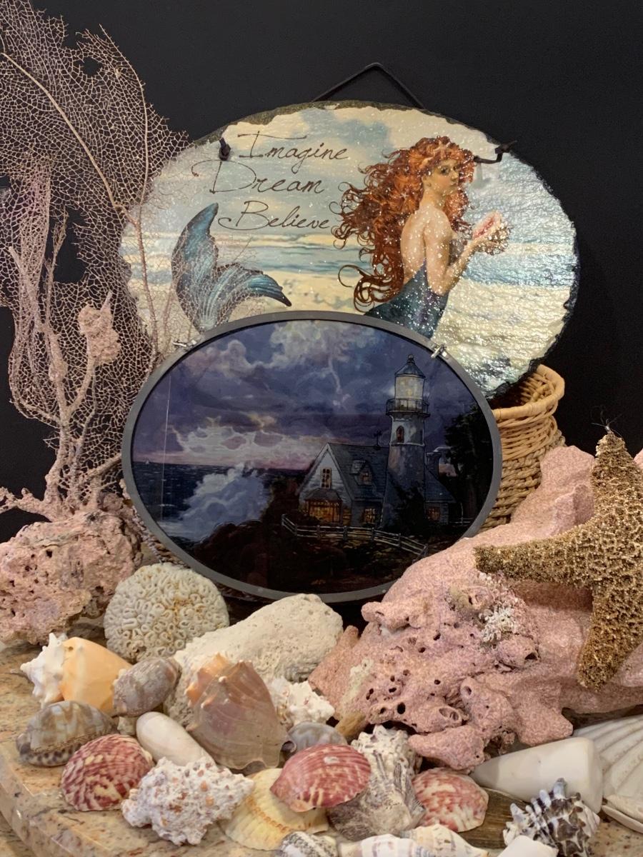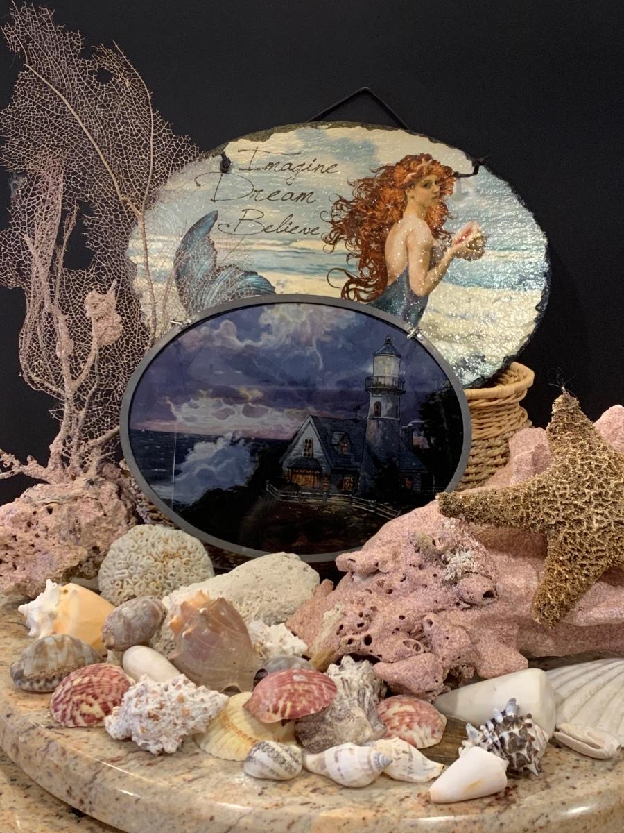 LOT 17R: Nautical Decor: Mermaid Painted on Slate, Lighthouse SunCatcher,, Sea Shells & More w/Basket