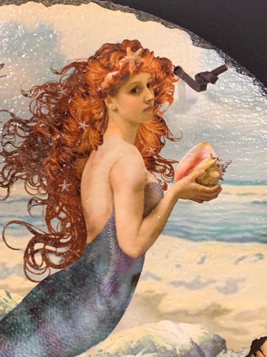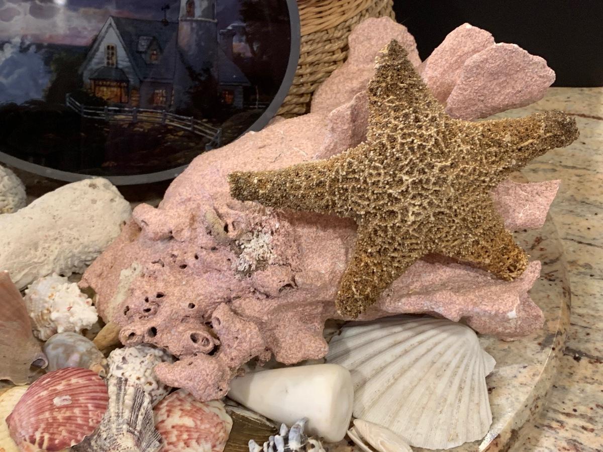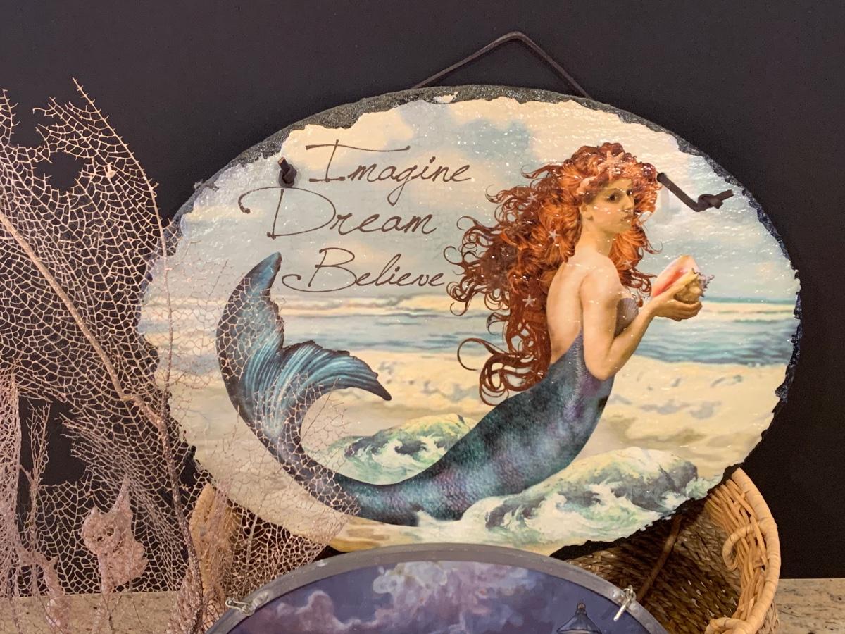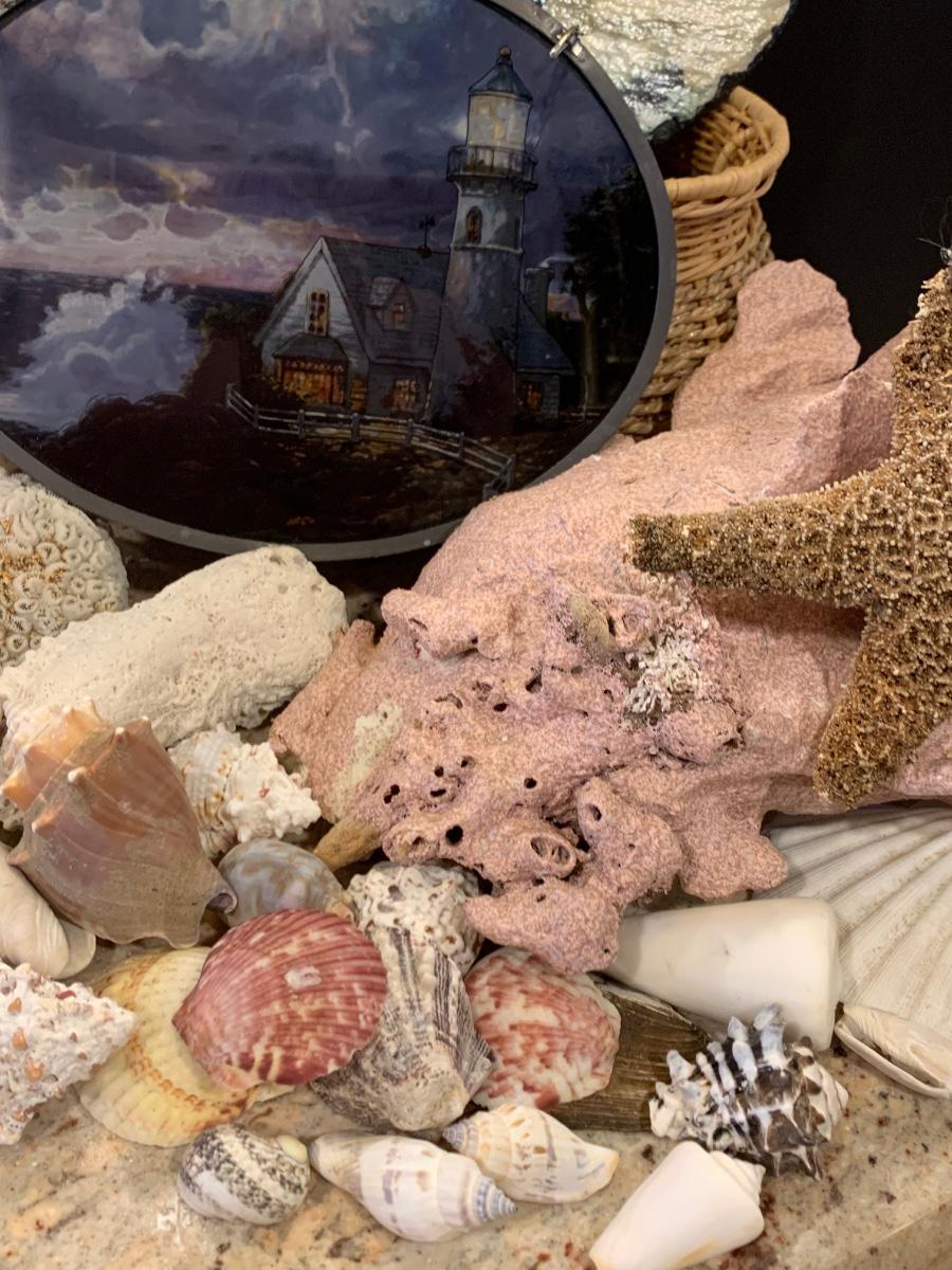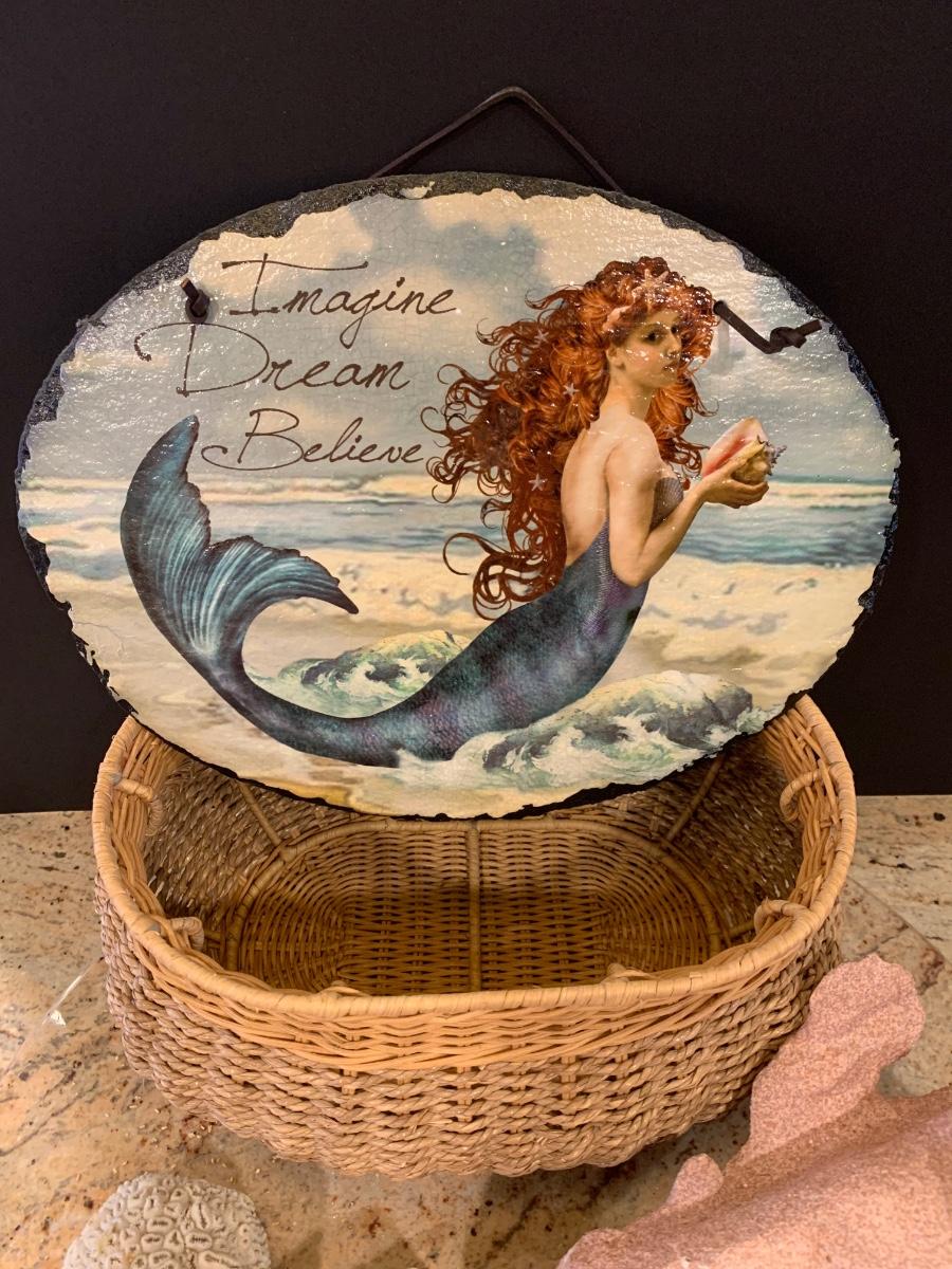 LOT 17R: Nautical Decor: Mermaid Painted on Slate, Lighthouse SunCatcher,, Sea Shells & More w/Basket
