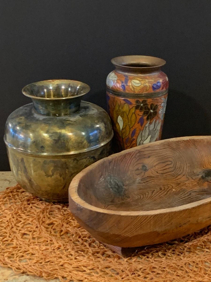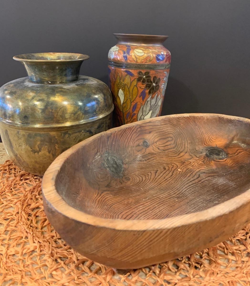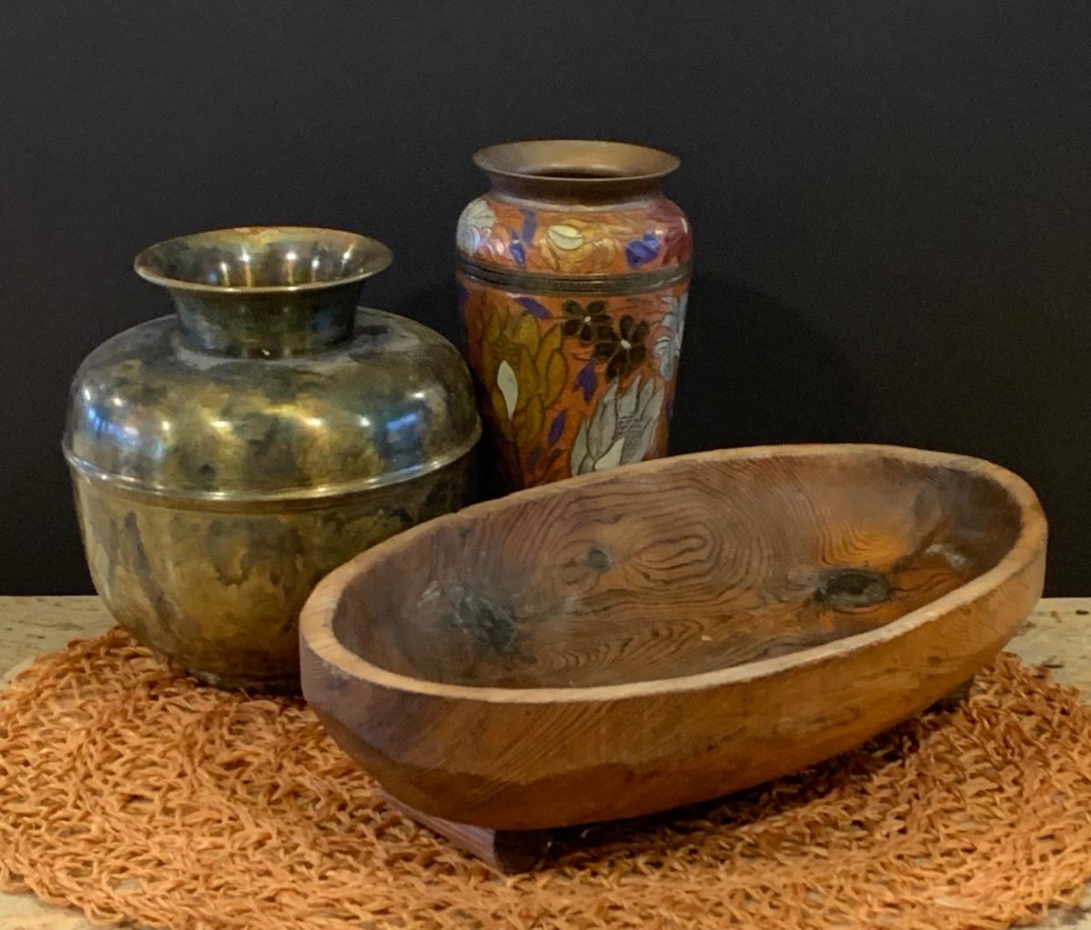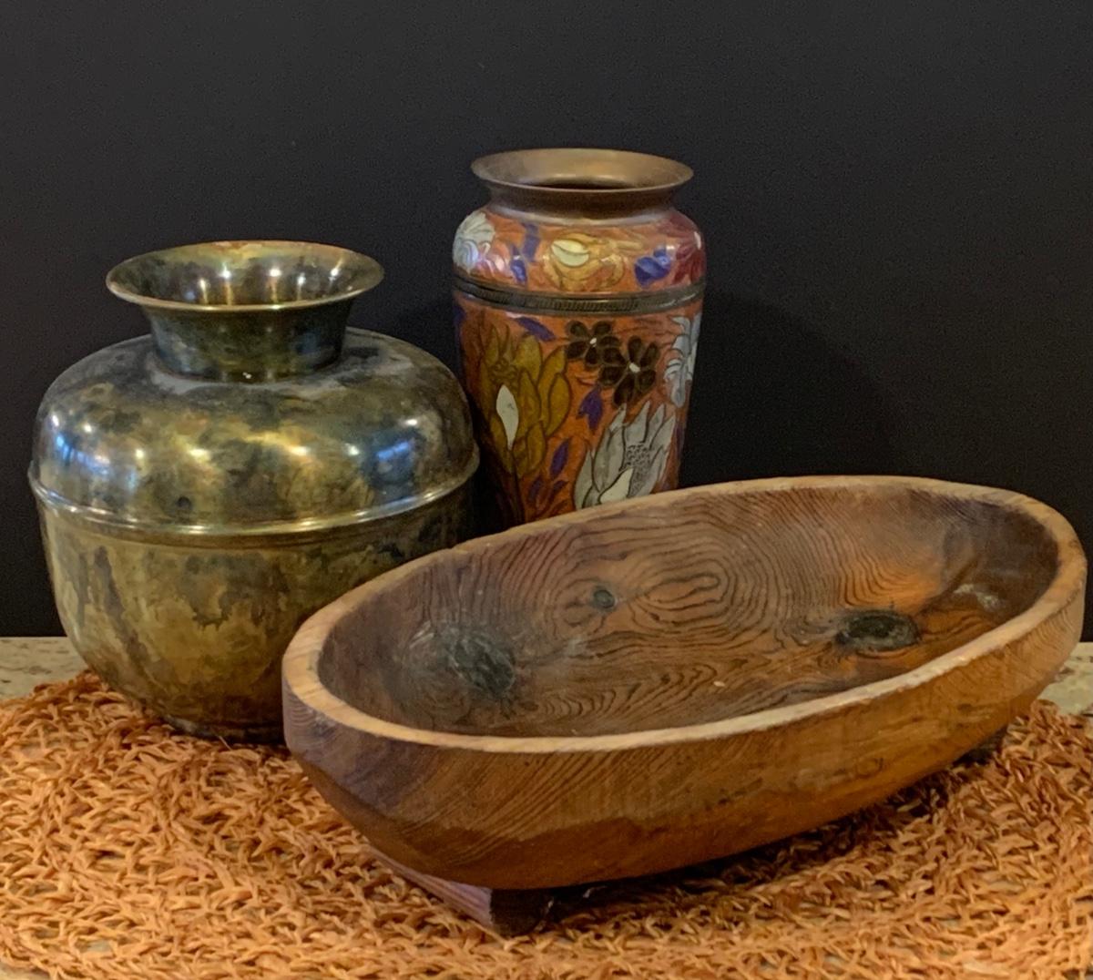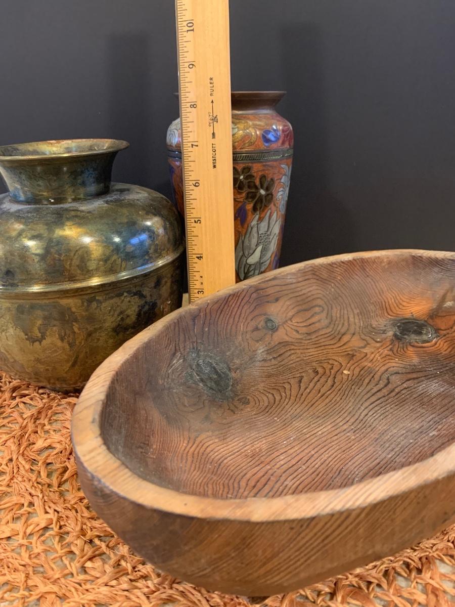 LOT 18R: Made in Spain Wooden Bowl, Enamel Ware Brass Vase & More
