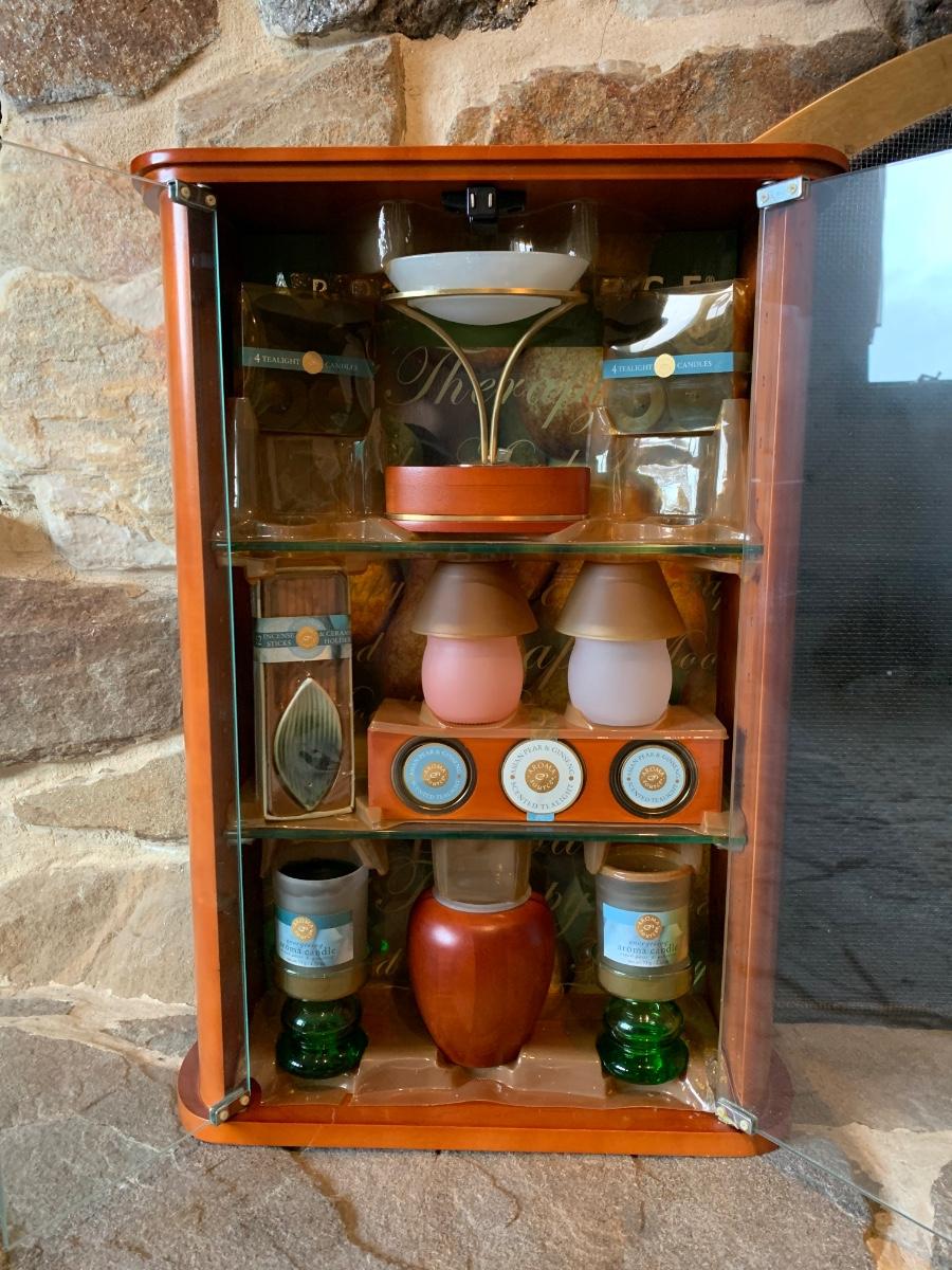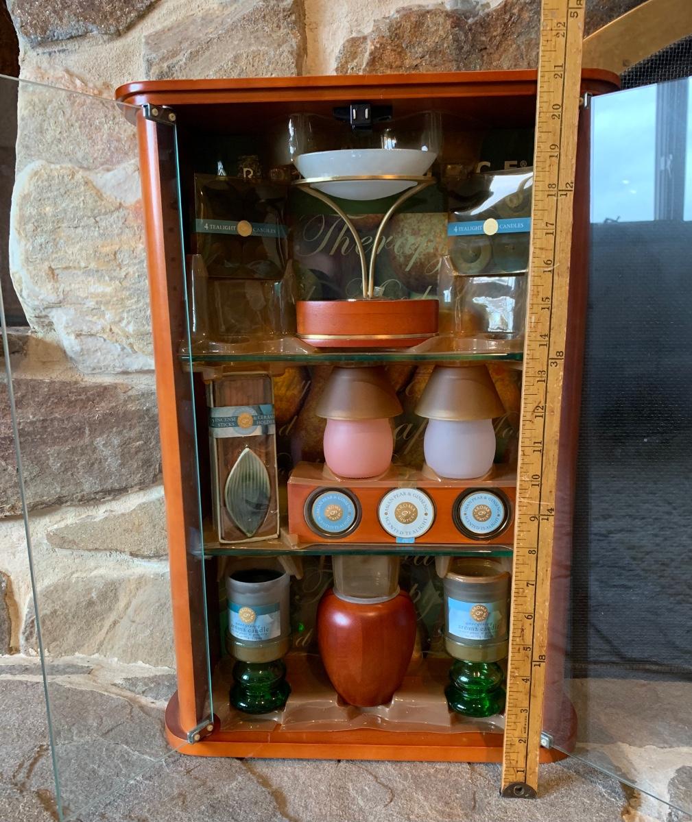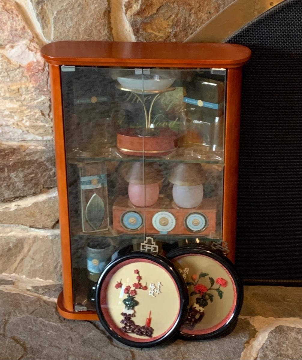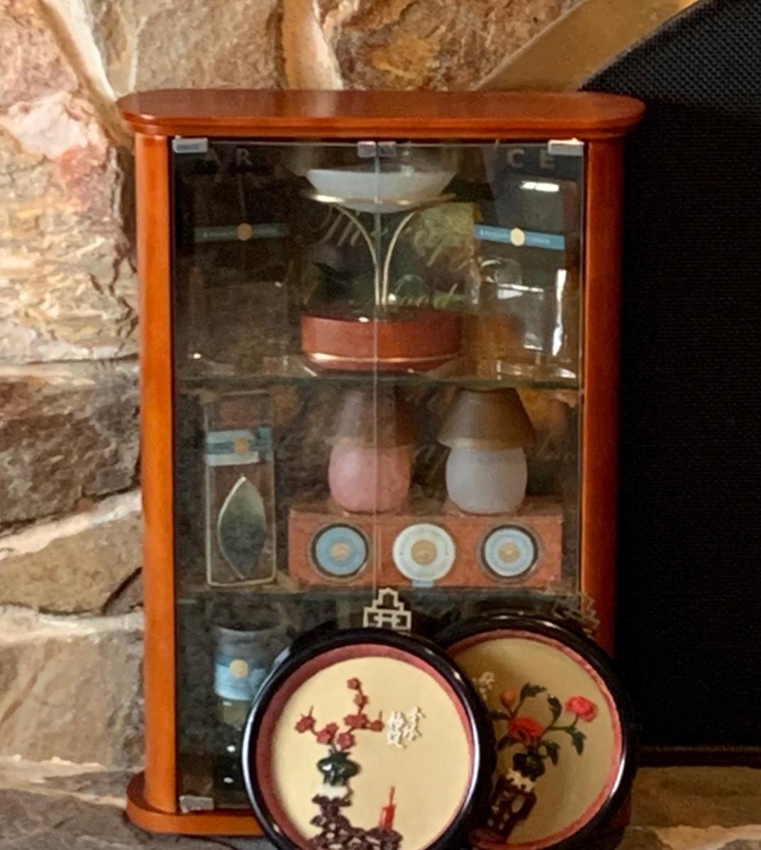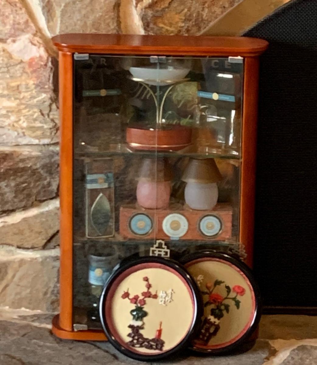 LOT 25R: Vintage Imitation Jade Wall Plaques & Accent Curio Cabinet w/Aroma Source Tealight Candles & Incense