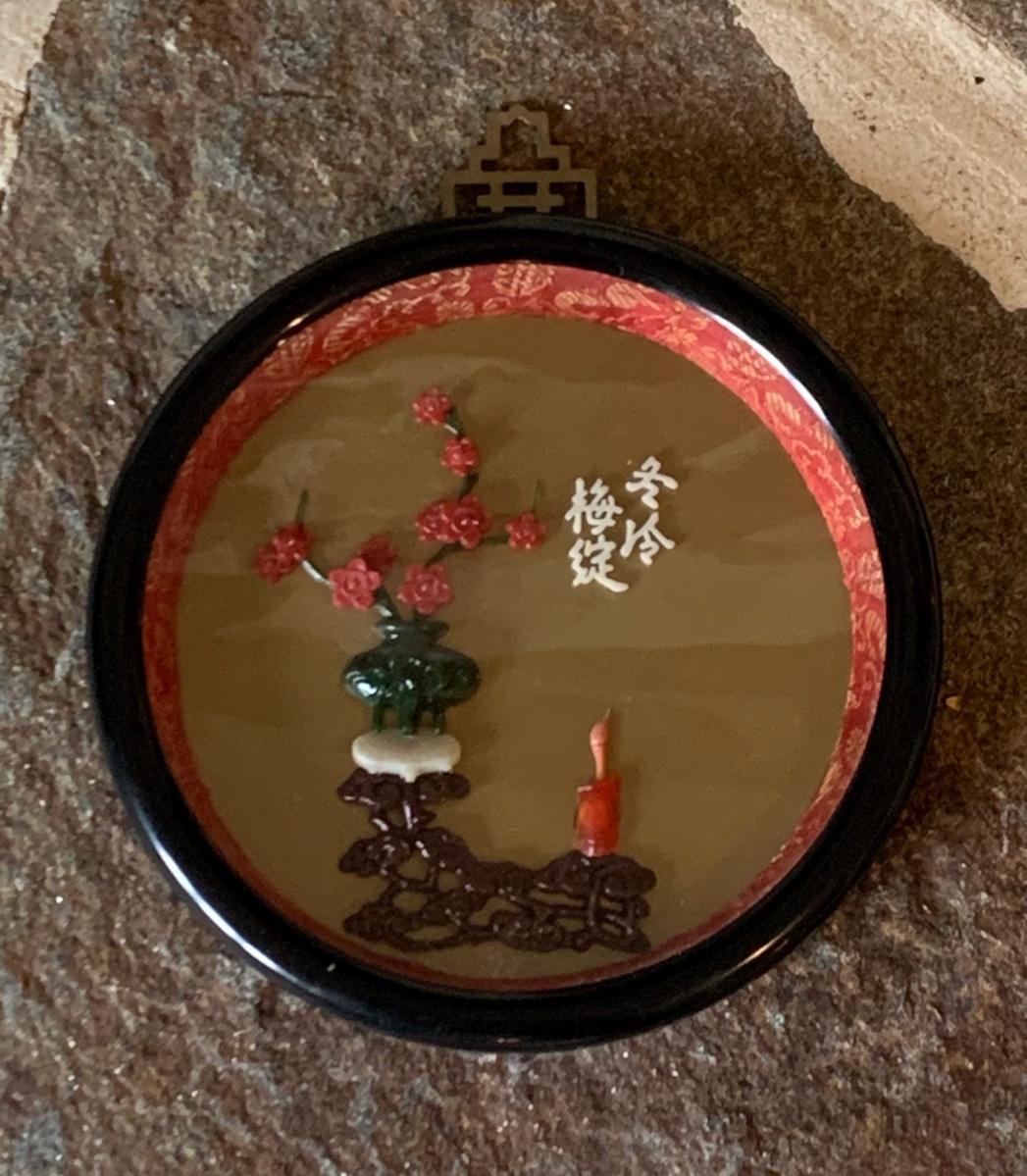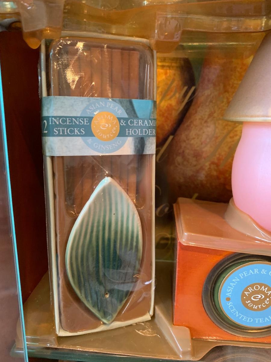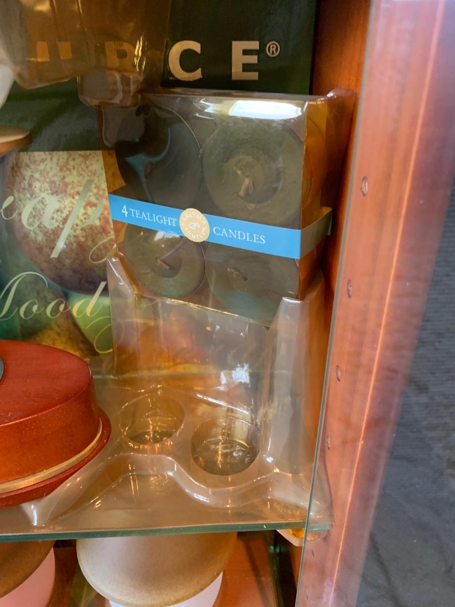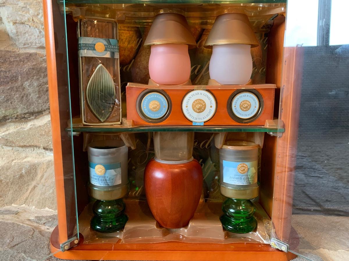 LOT 25R: Vintage Imitation Jade Wall Plaques & Accent Curio Cabinet w/Aroma Source Tealight Candles & Incense