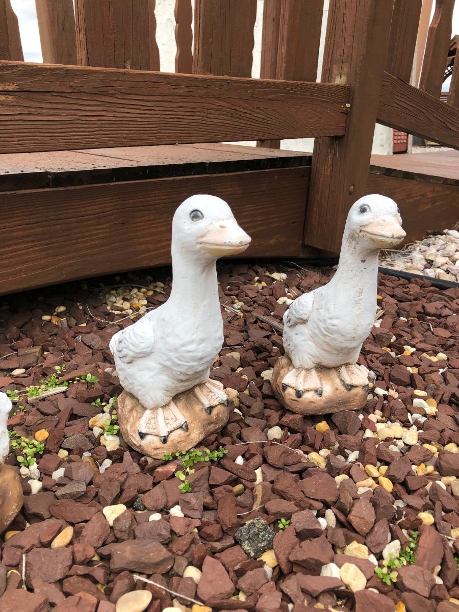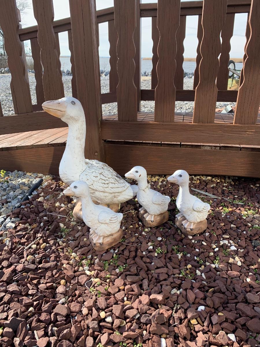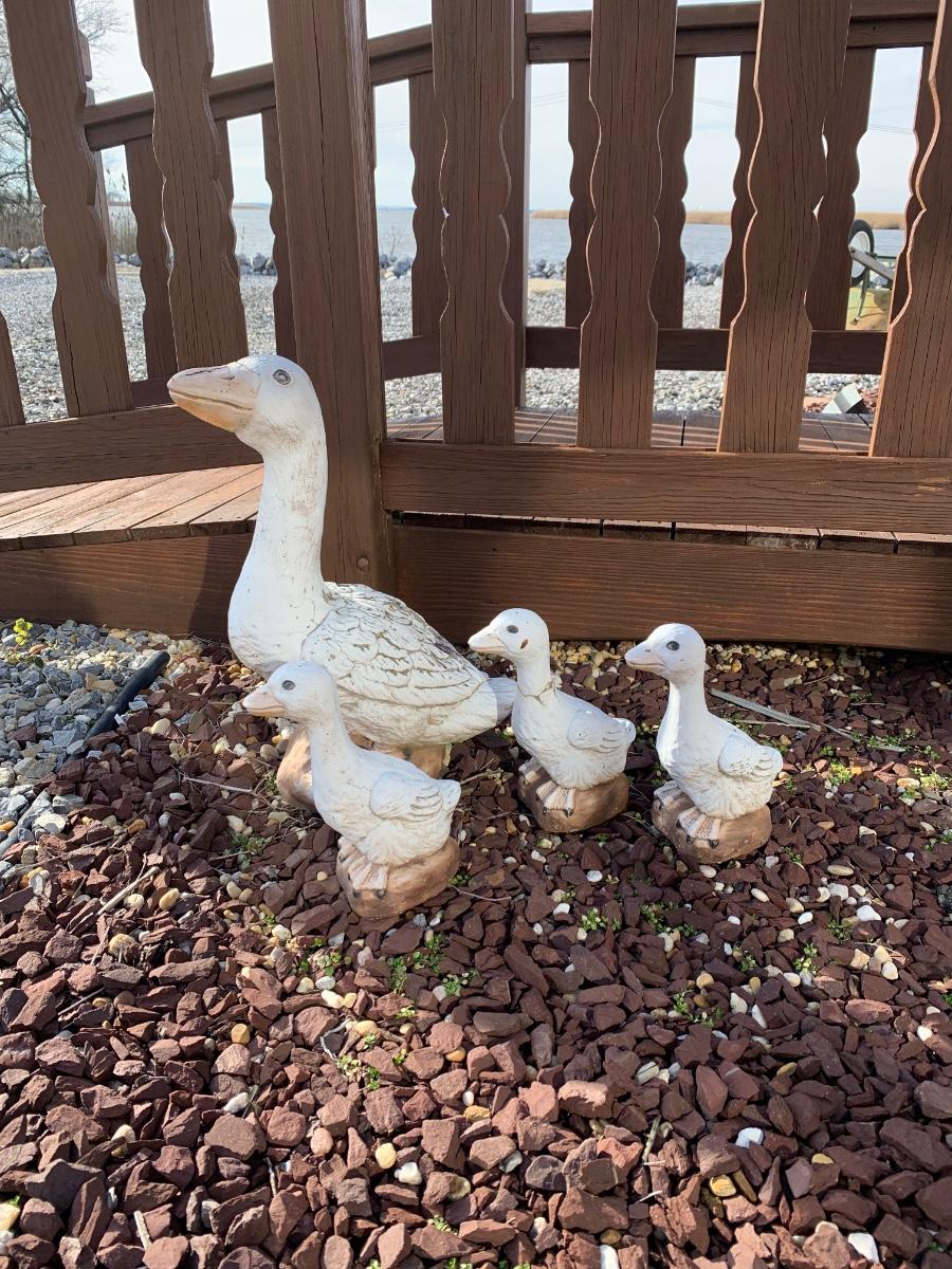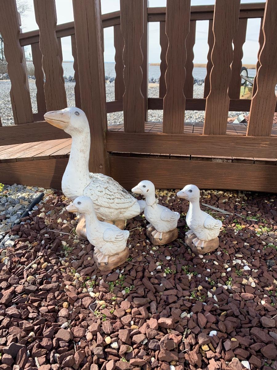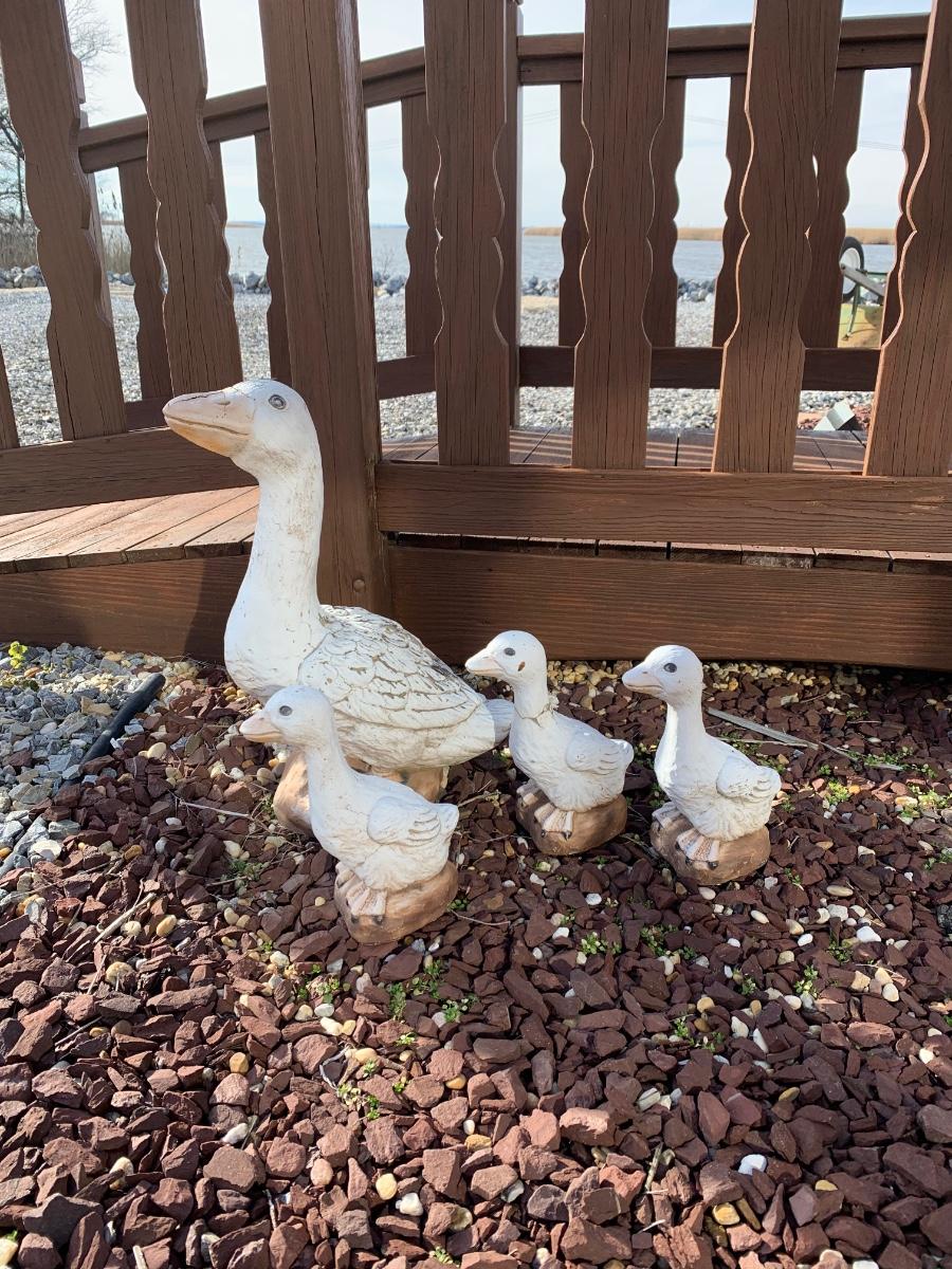 Four outdoor statues of a goose with her three goslings. Statues are worn and weathered.