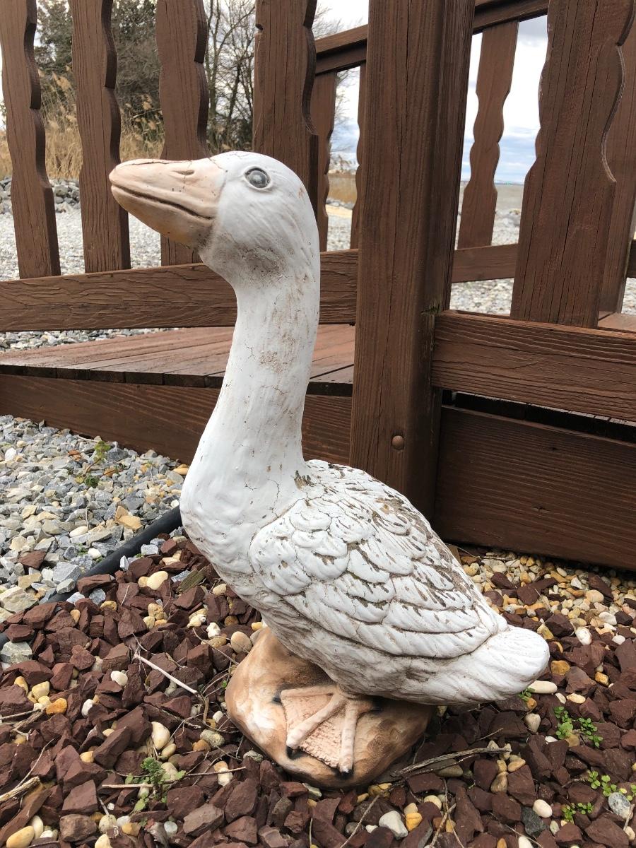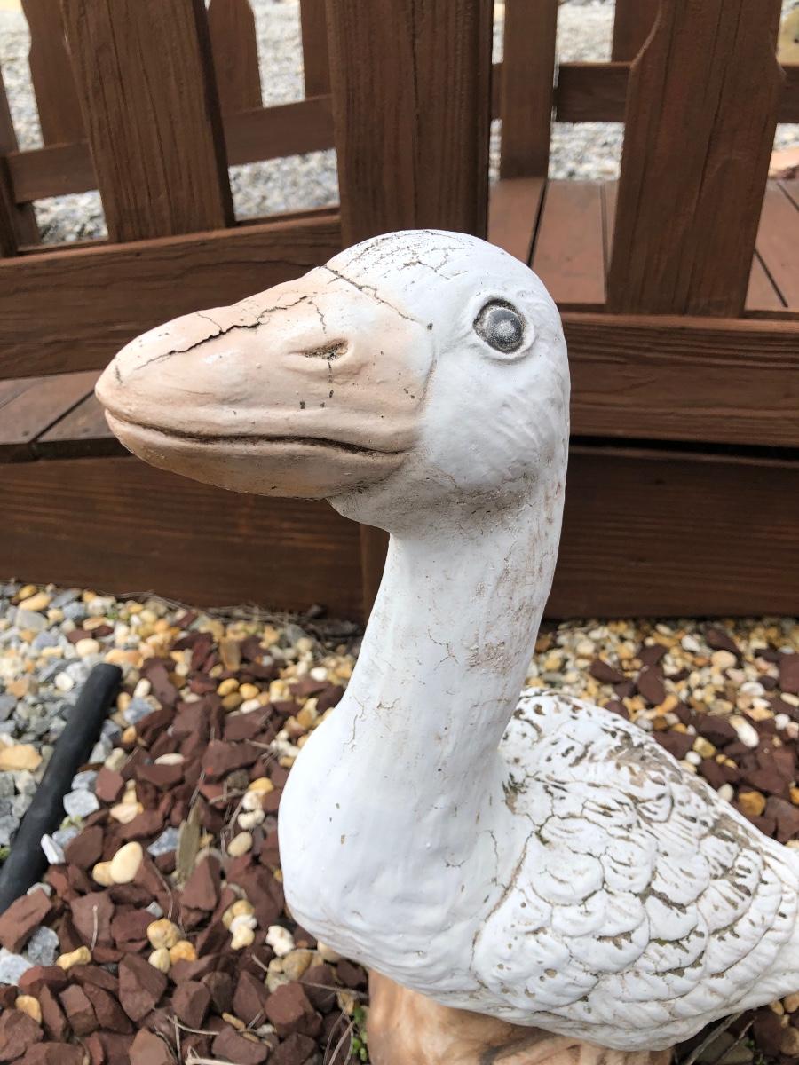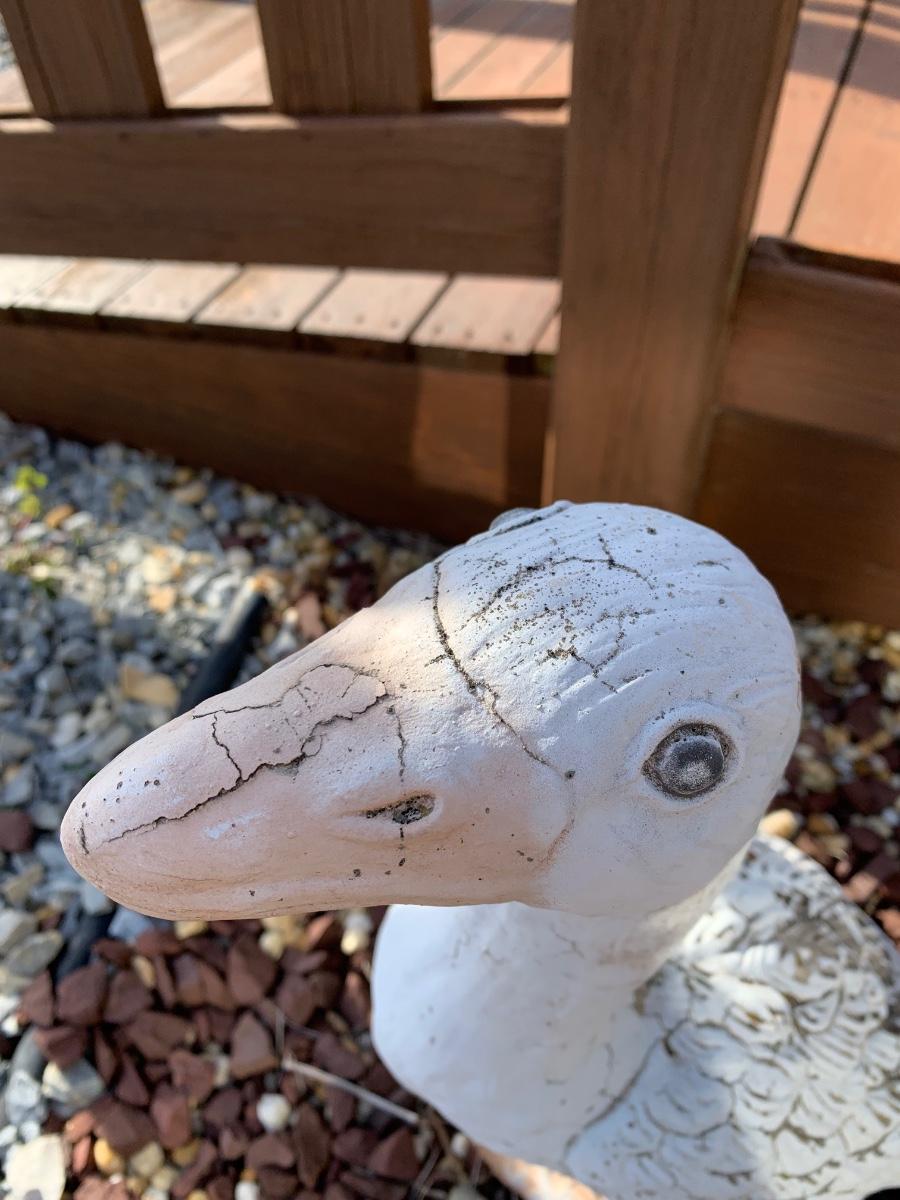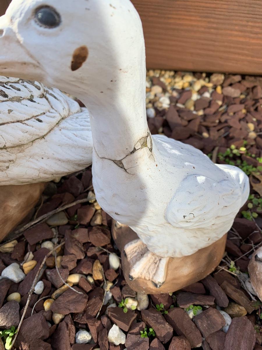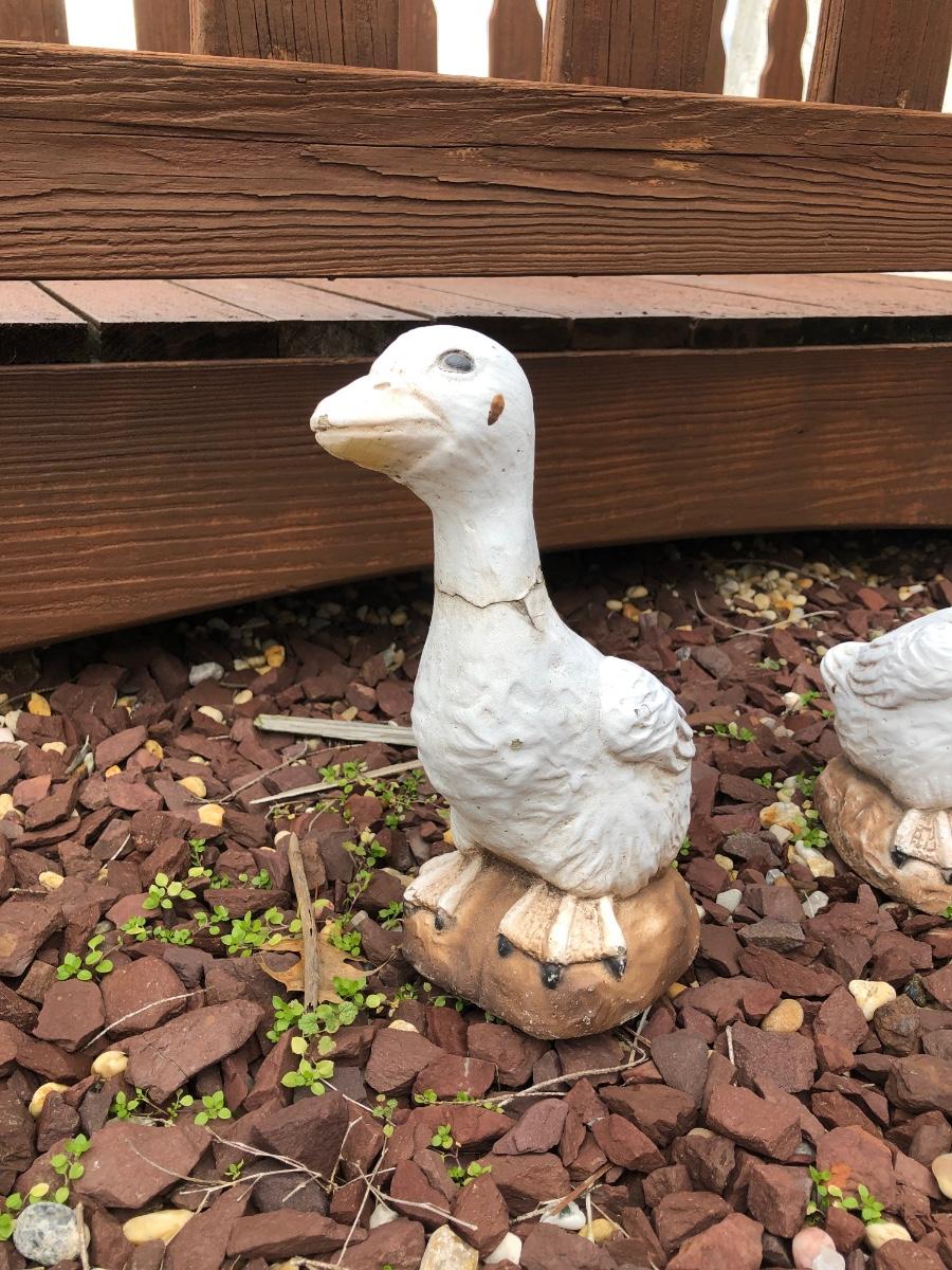Four outdoor statues of a goose with her three goslings. Statues are worn and weathered.