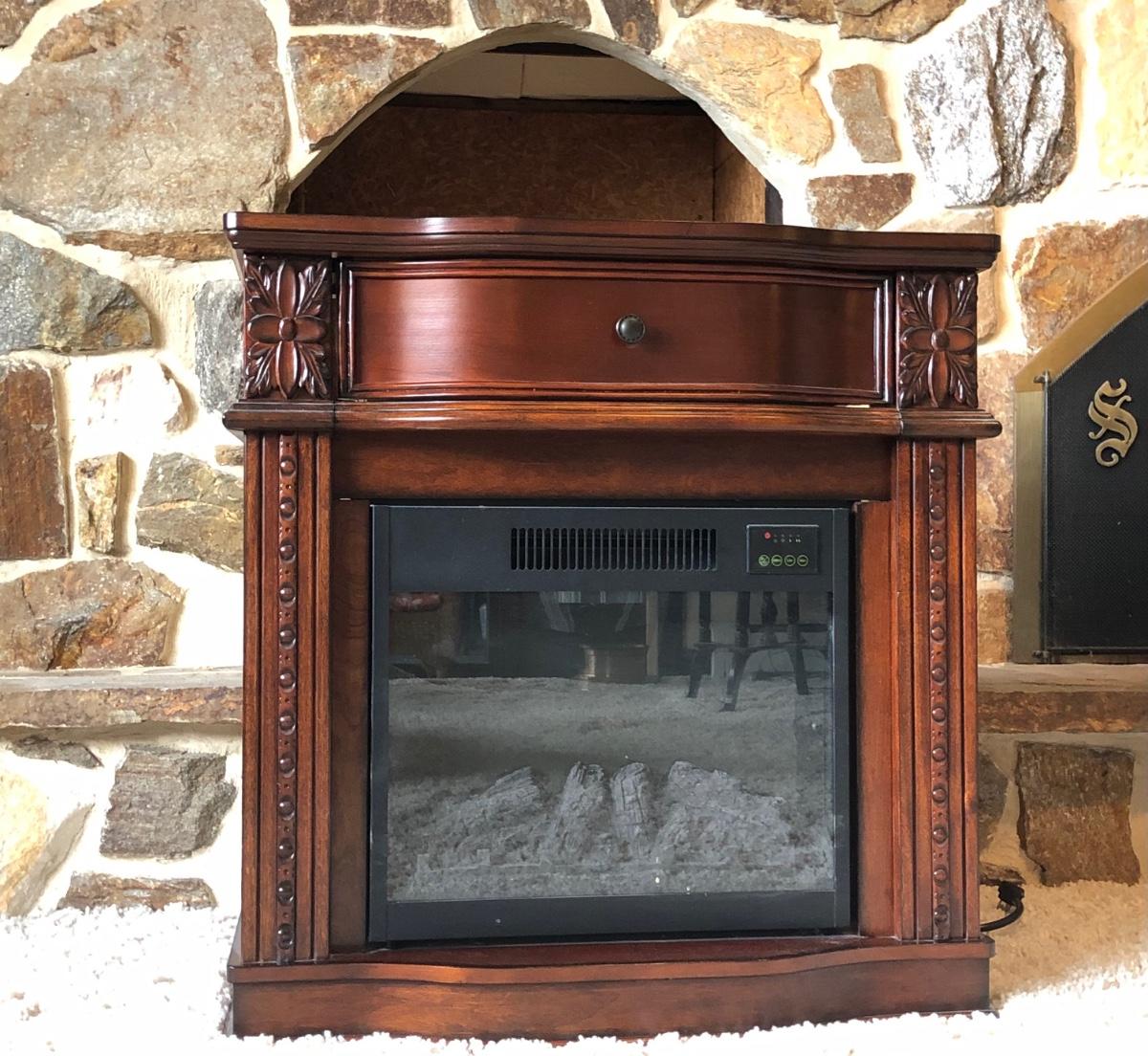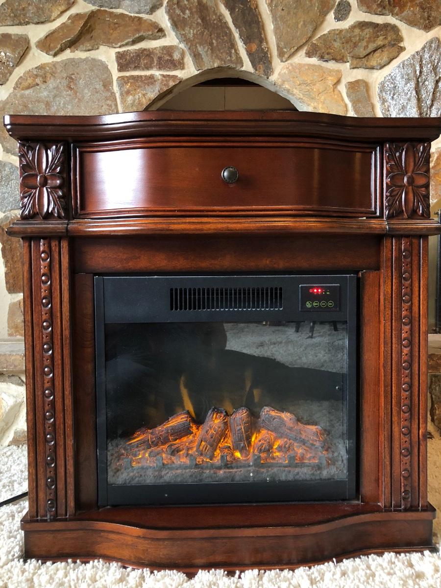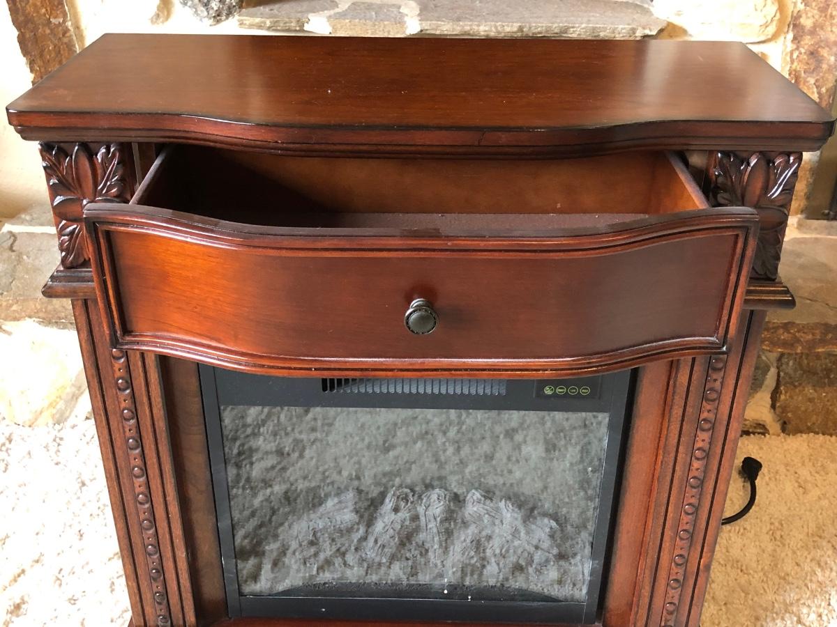 Electric fireplace console in working condition. Has low and high settings, as well as a dimmer. Includes a storage drawer above the electric fireplace. Measures 29W x 13D x 29H.
