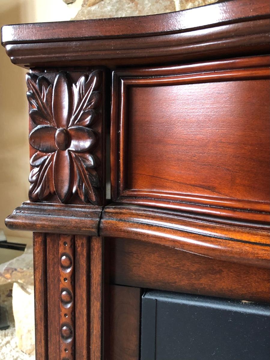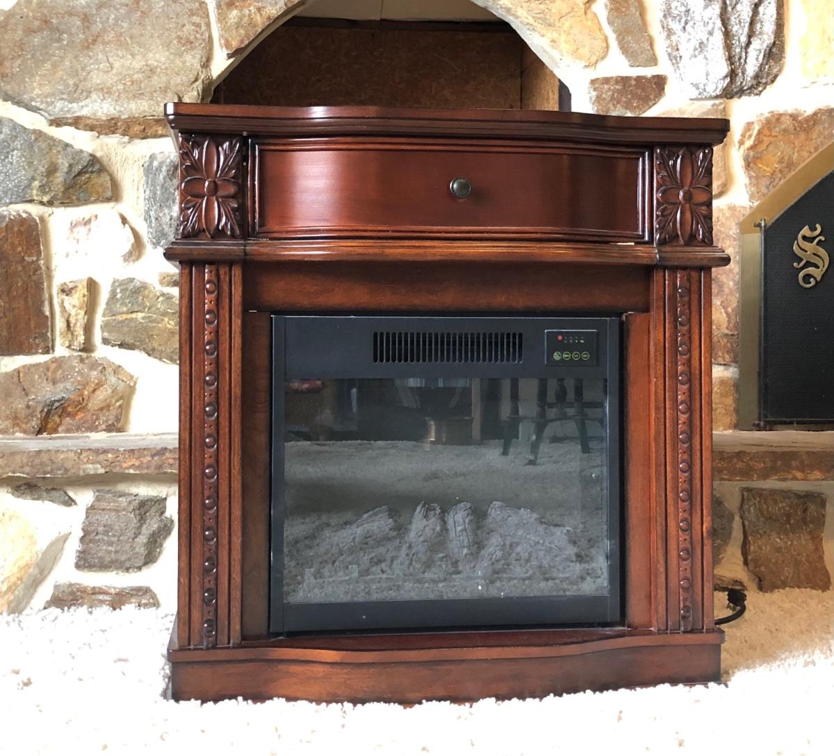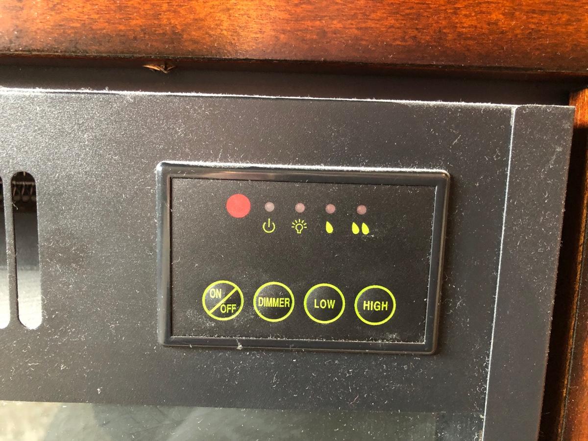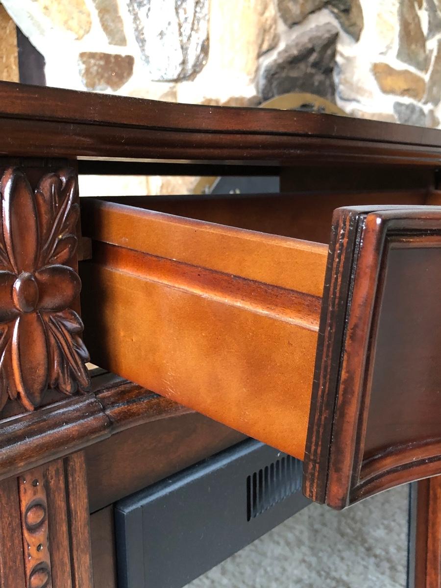 Electric fireplace console in working condition. Has low and high settings, as well as a dimmer. Includes a storage drawer above the electric fireplace. Measures 29W x 13D x 29H.
