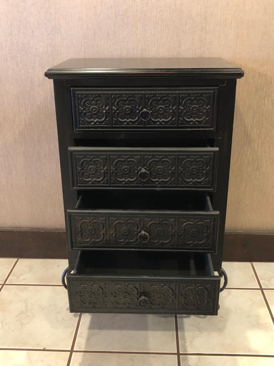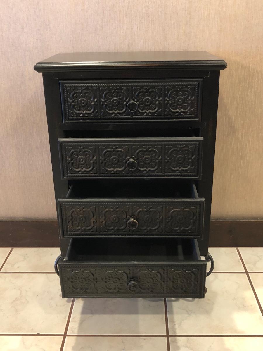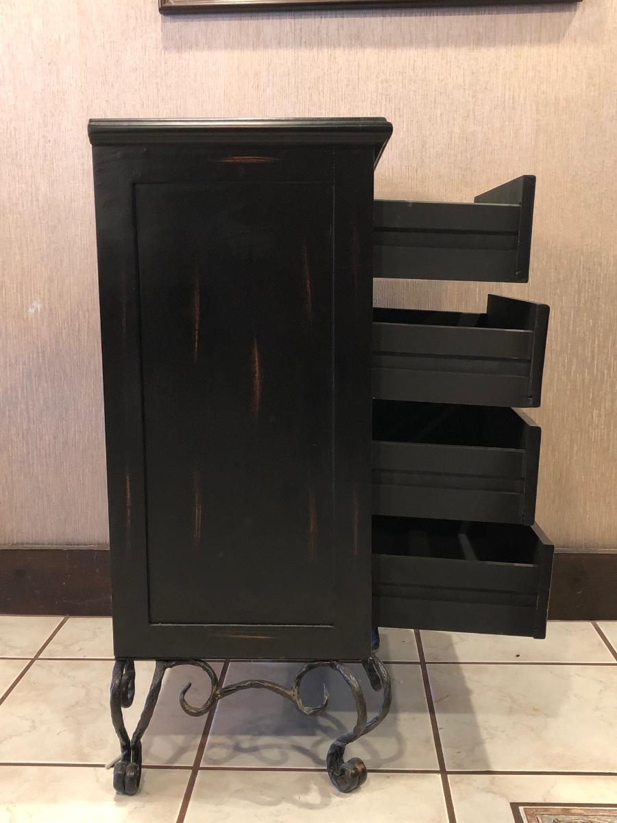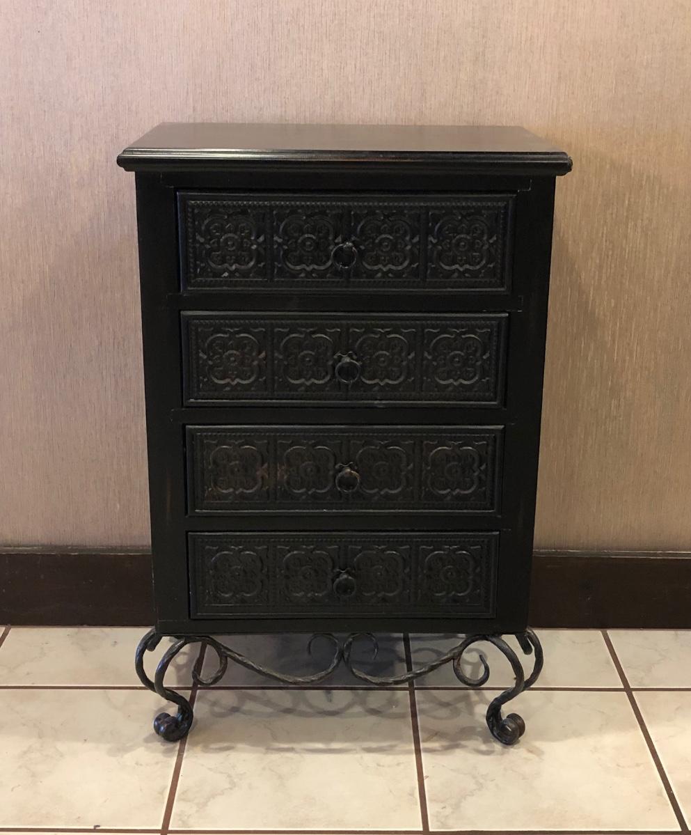 Lightweight wooden cabinet with metal legs and four drawers. Measures 21W x 13D x 32H.