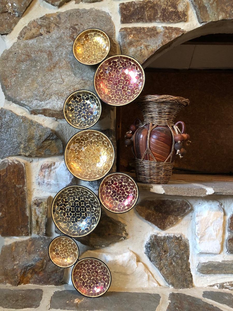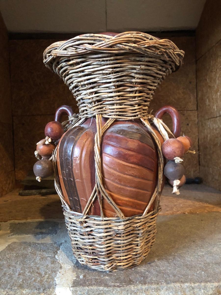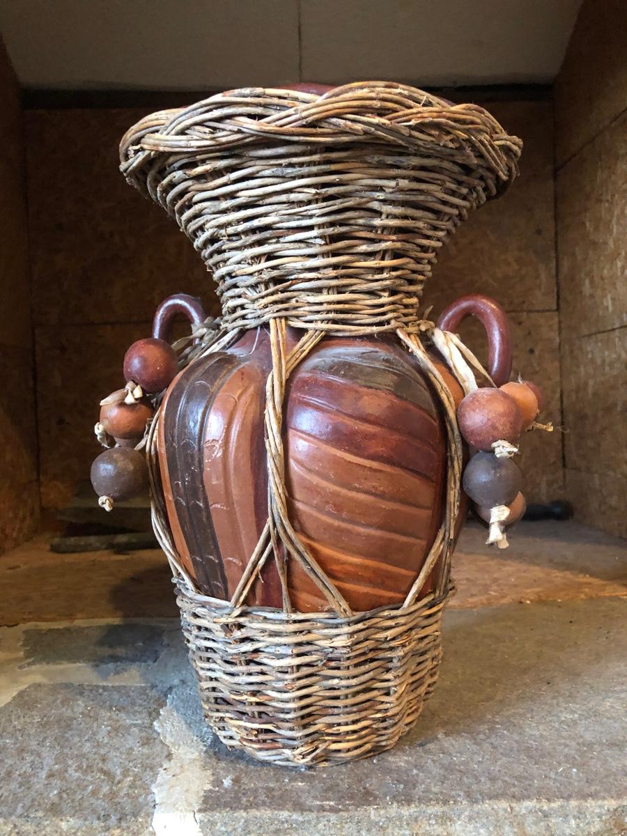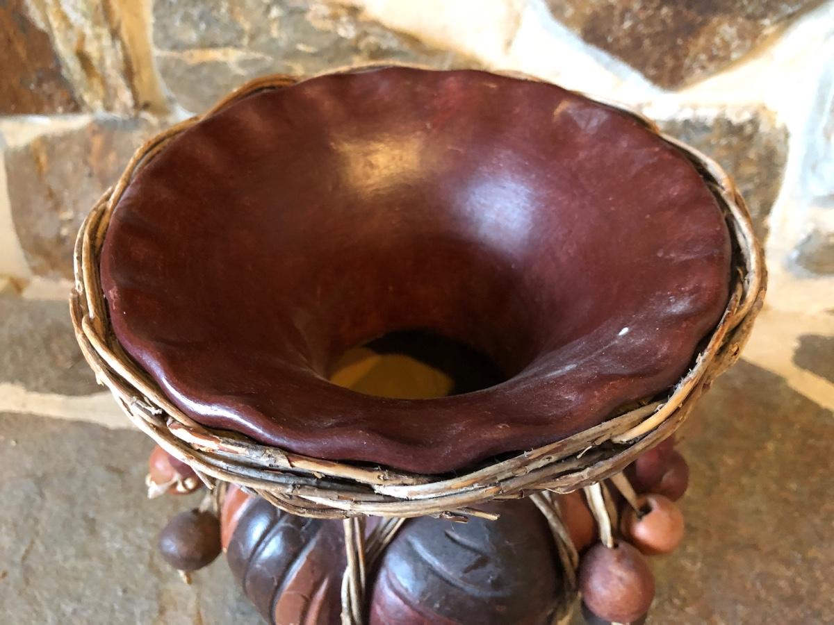 The wall hanging features circles with pieces mosaiced together in different colors. The vase is carved wood wrapped with wicker. Wall hanging measures 34” long.