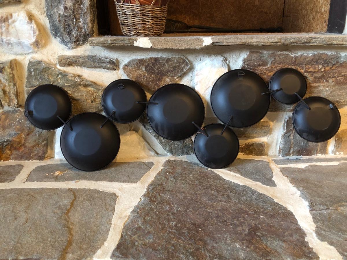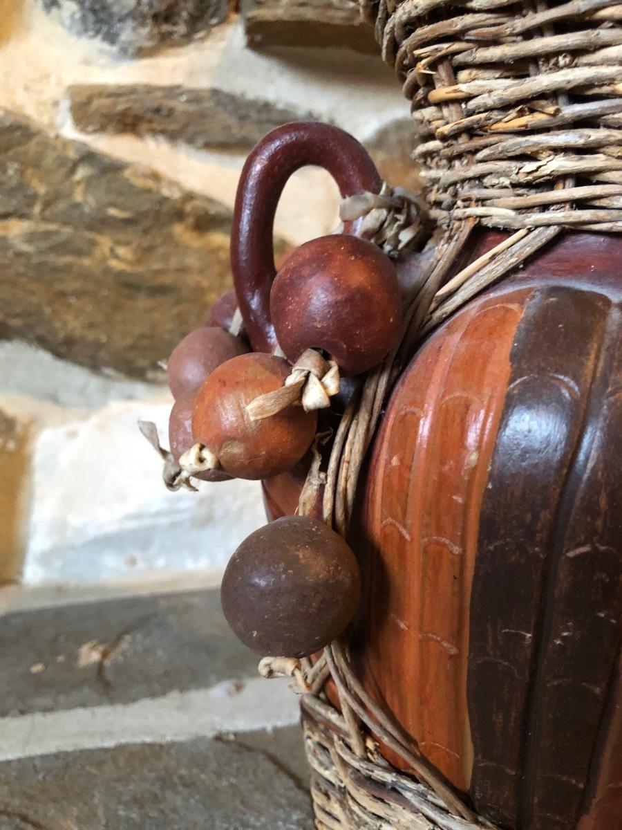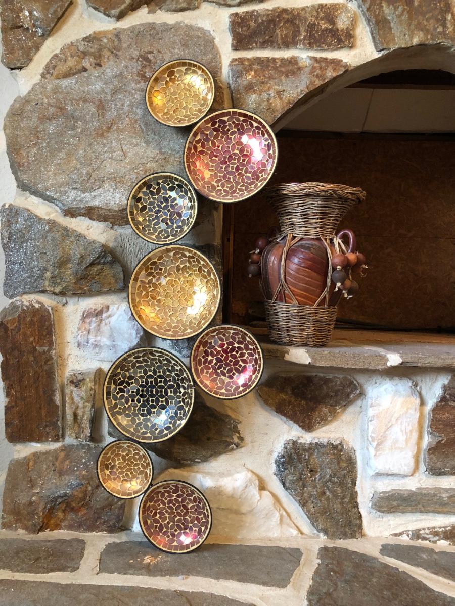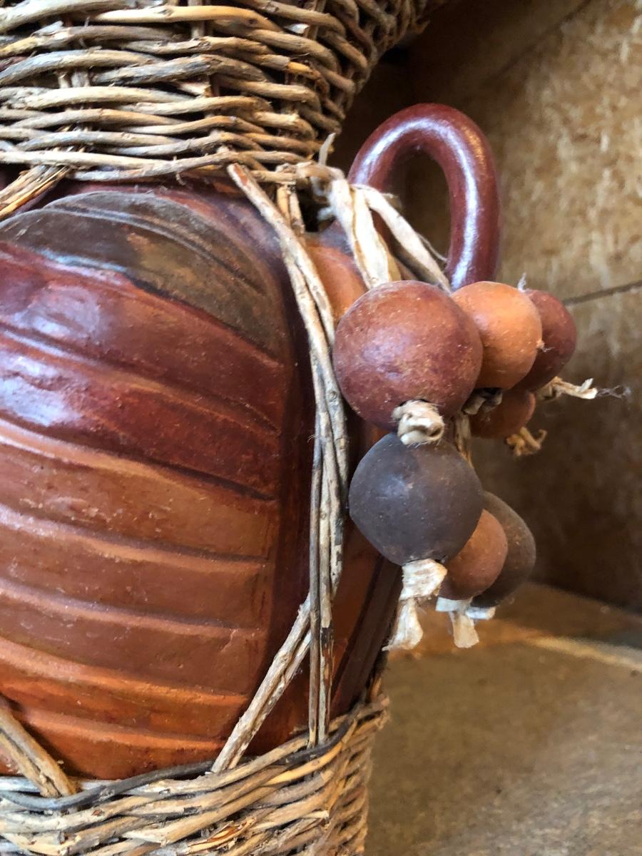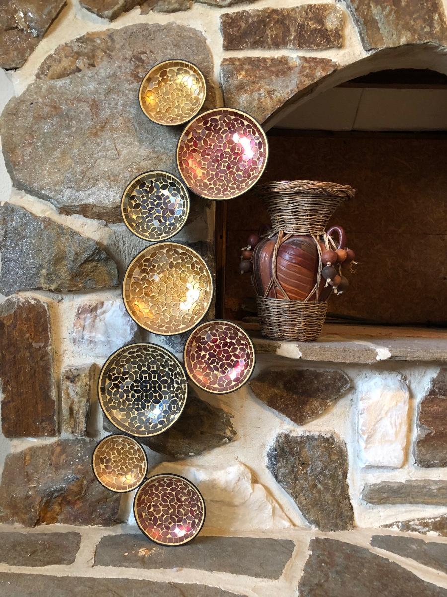 The wall hanging features circles with pieces mosaiced together in different colors. The vase is carved wood wrapped with wicker. Wall hanging measures 34” long.