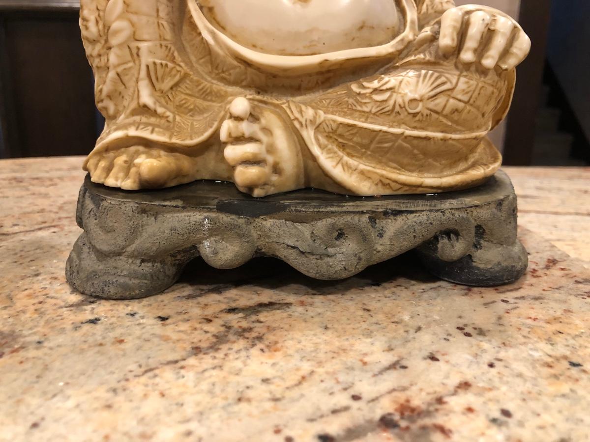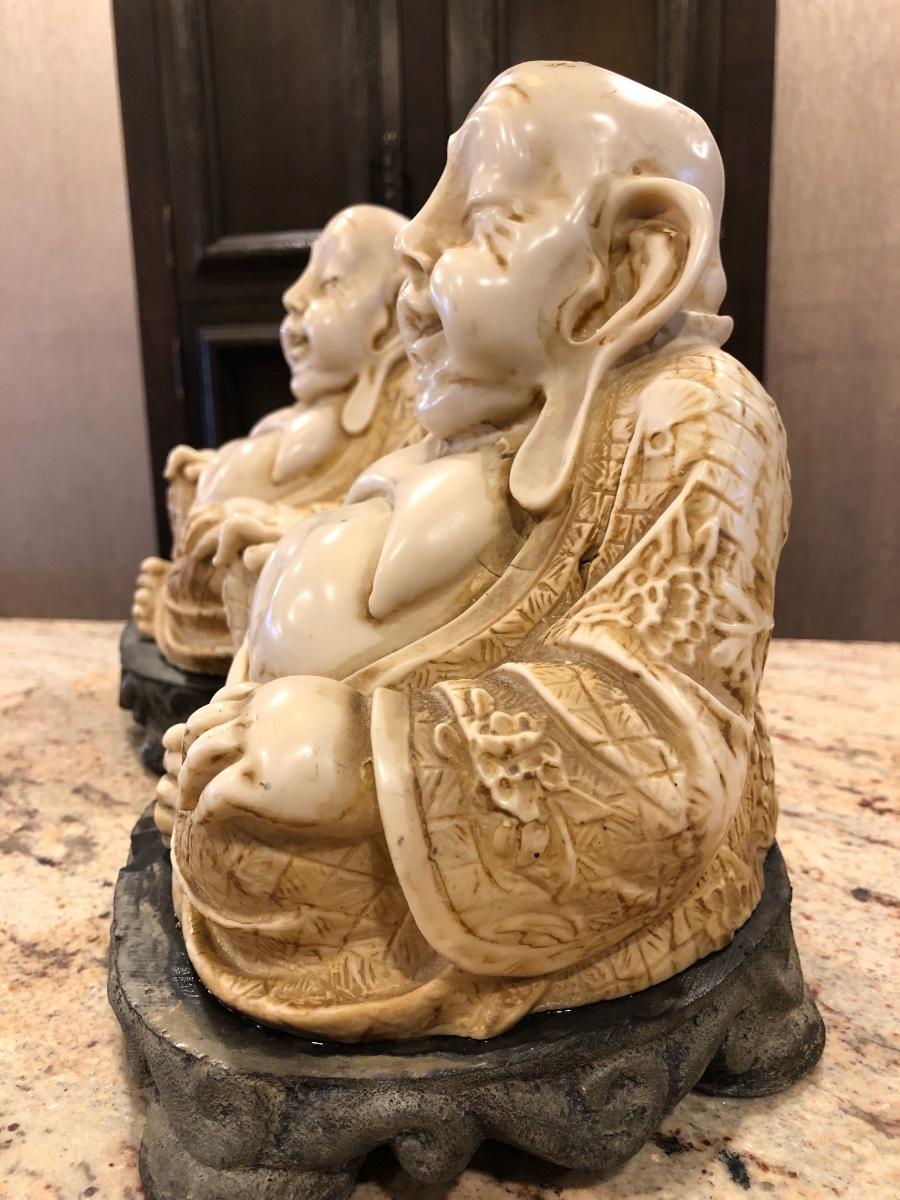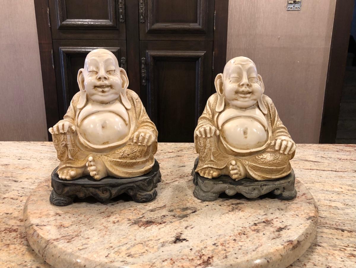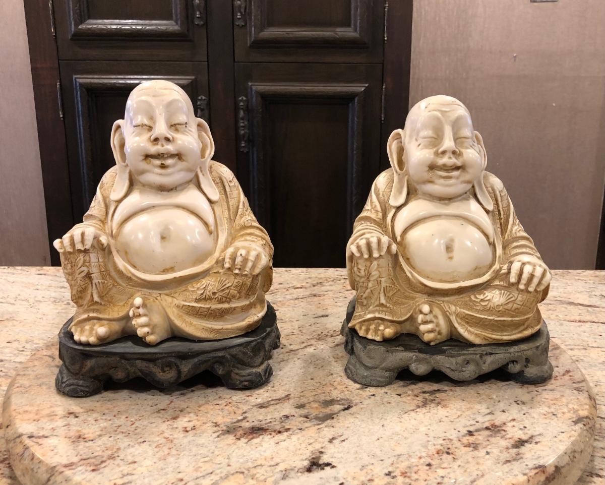 Two heavy statues depicting the laughing Buddha with stone bases. Statues measure 10” tall and 7” wide. One statue has fingers and toes broken (see photos).