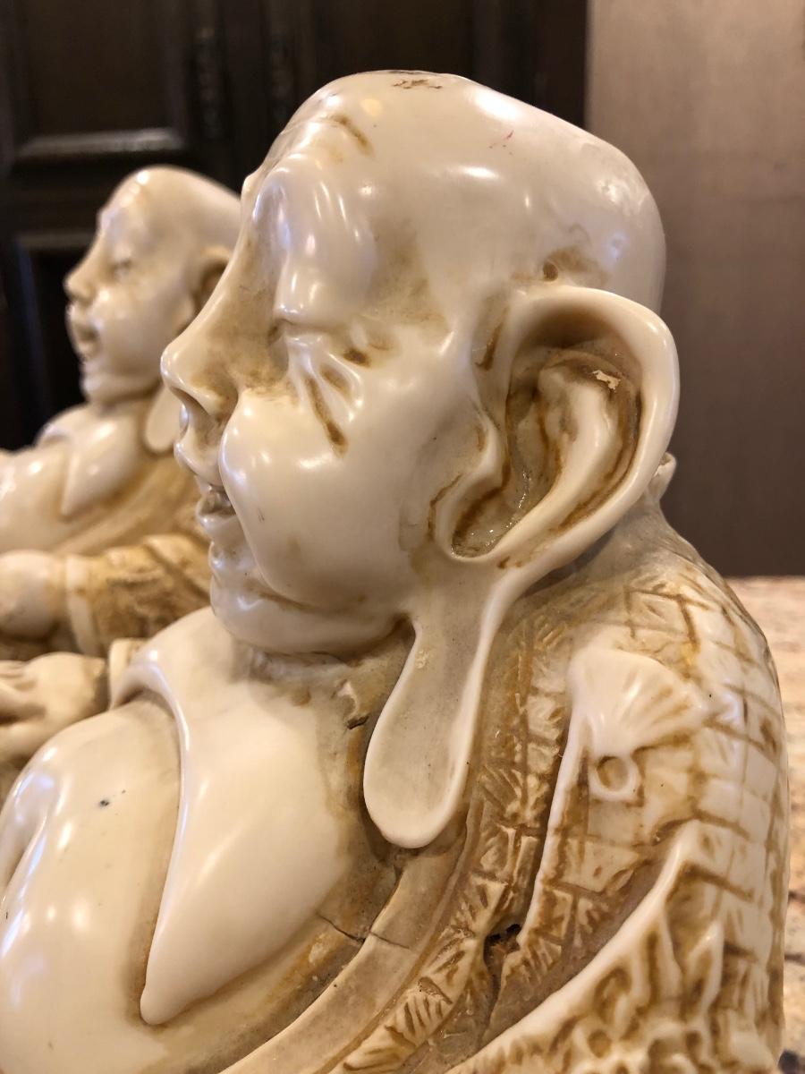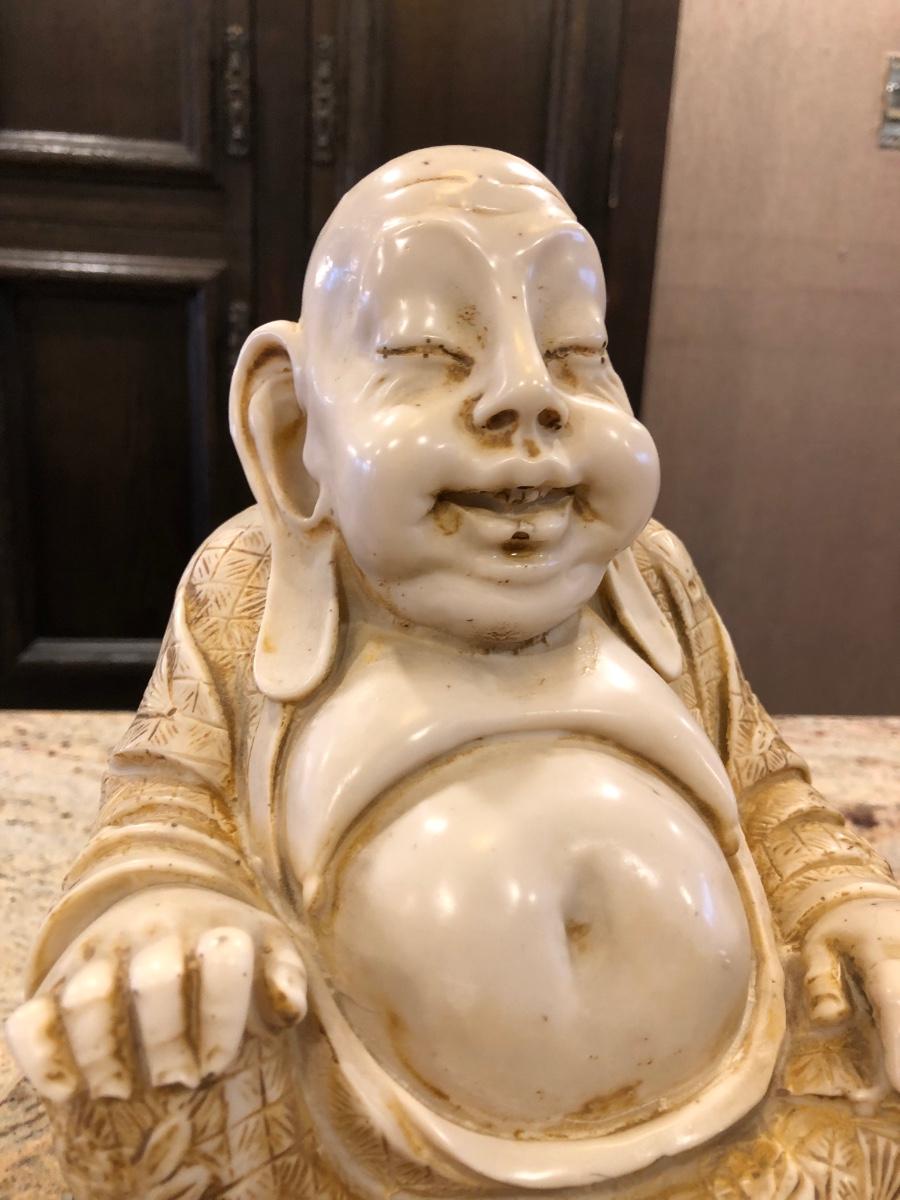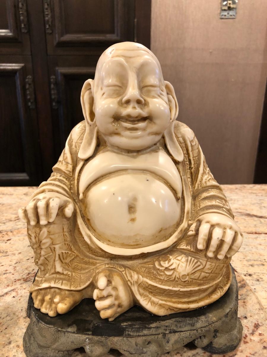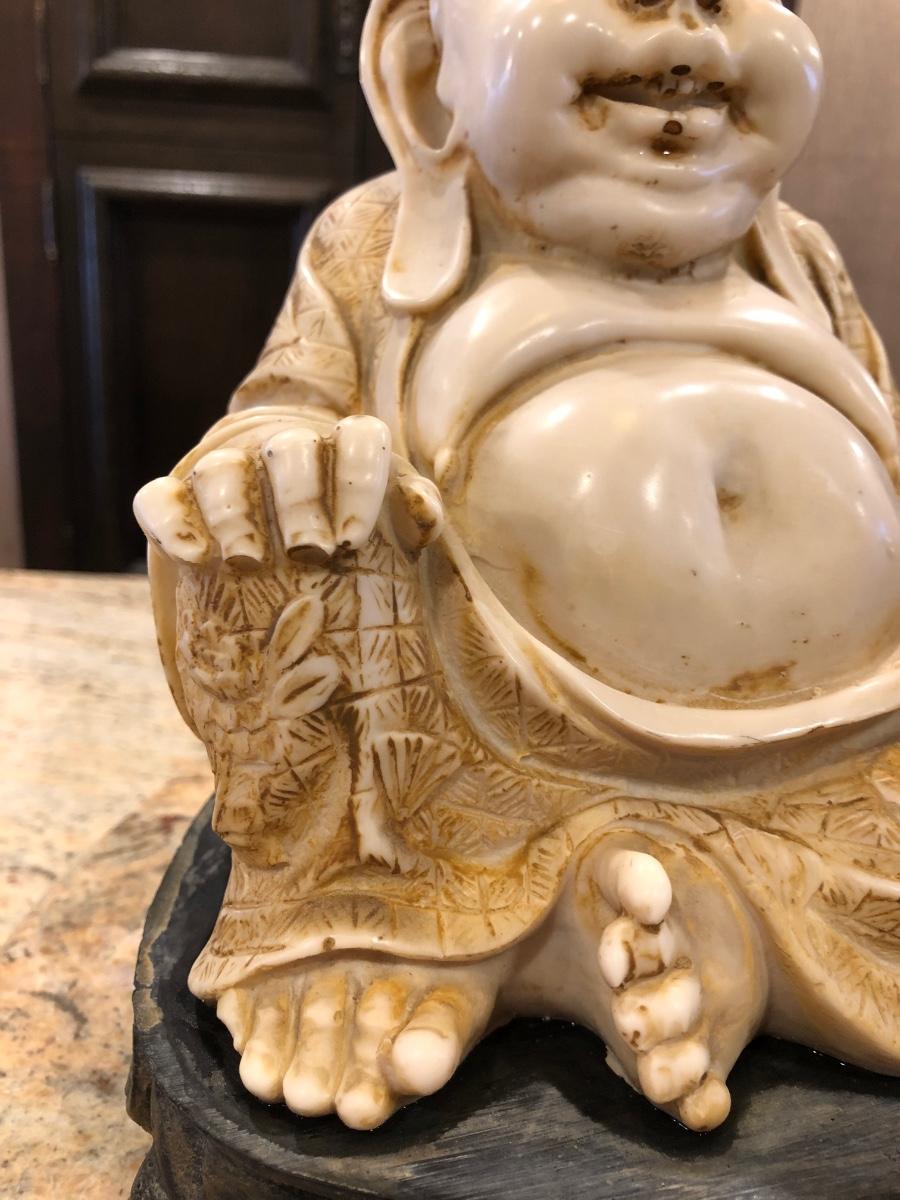 Two heavy statues depicting the laughing Buddha with stone bases. Statues measure 10” tall and 7” wide. One statue has fingers and toes broken (see photos).