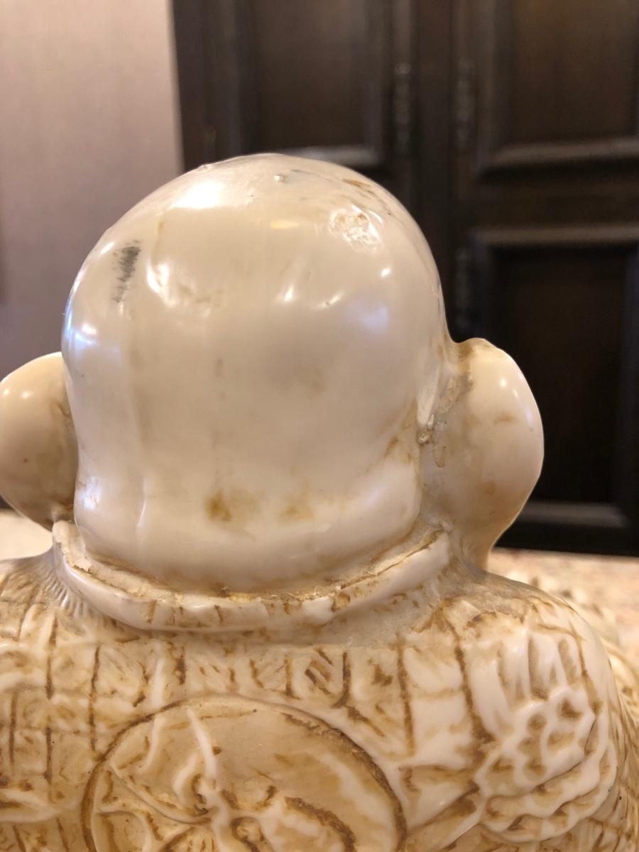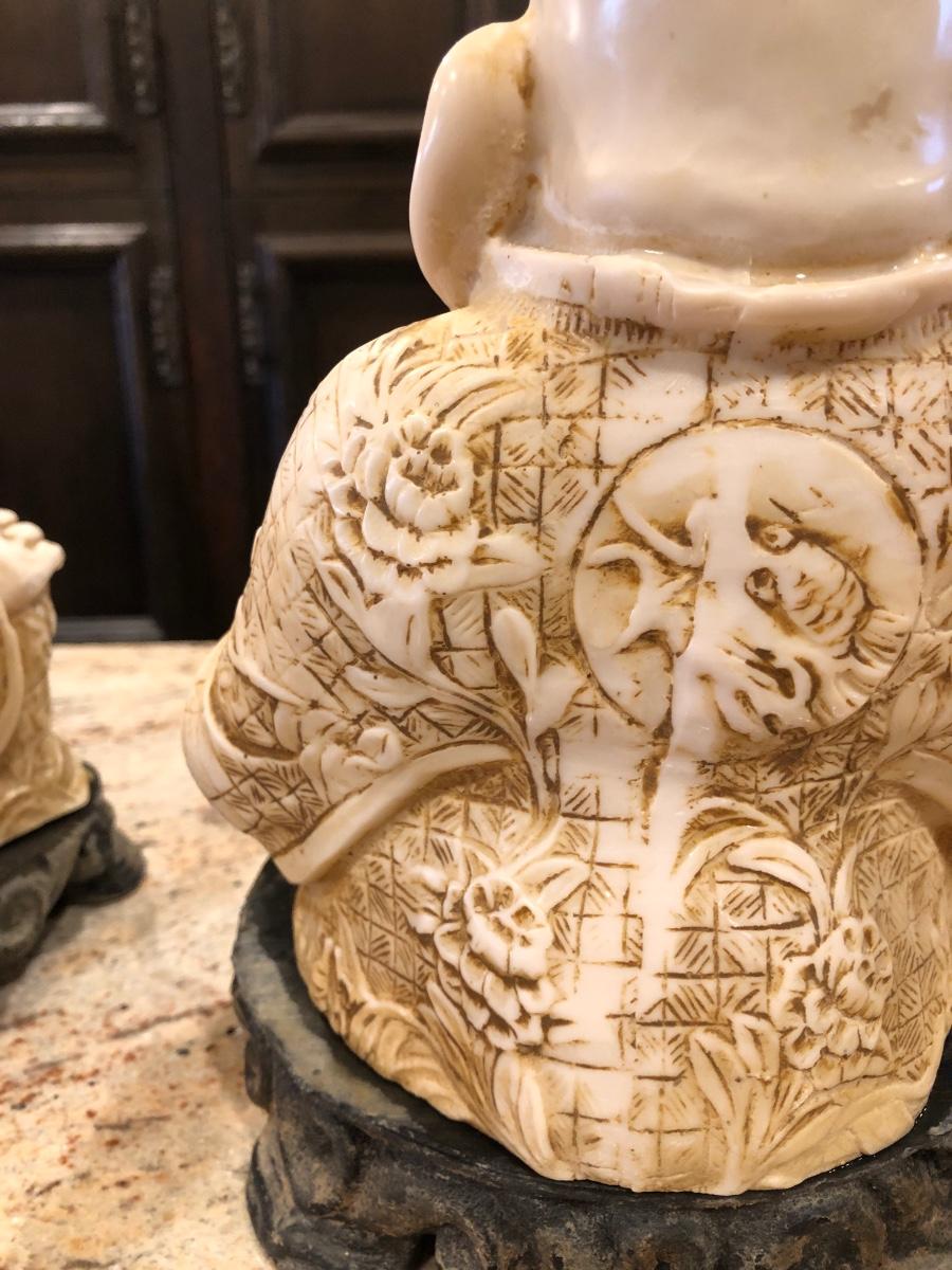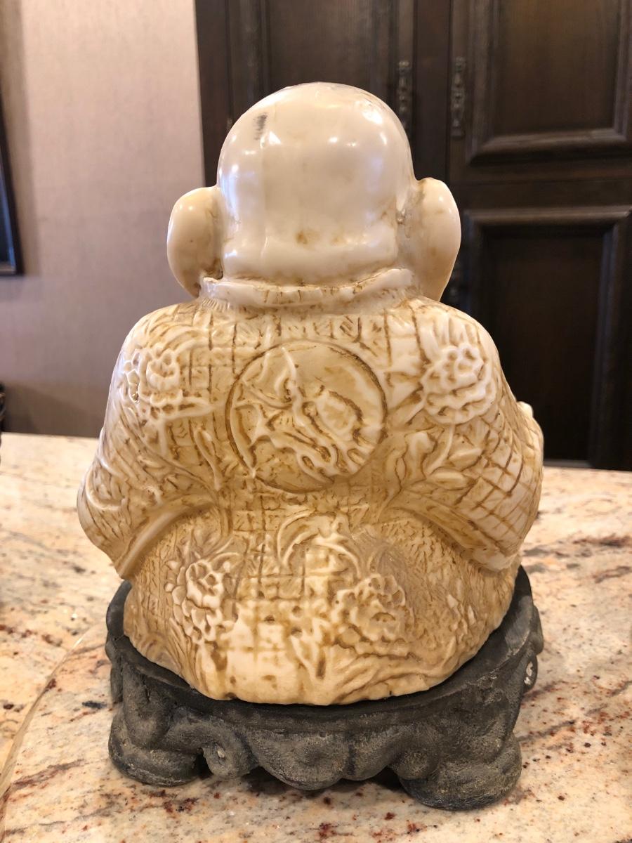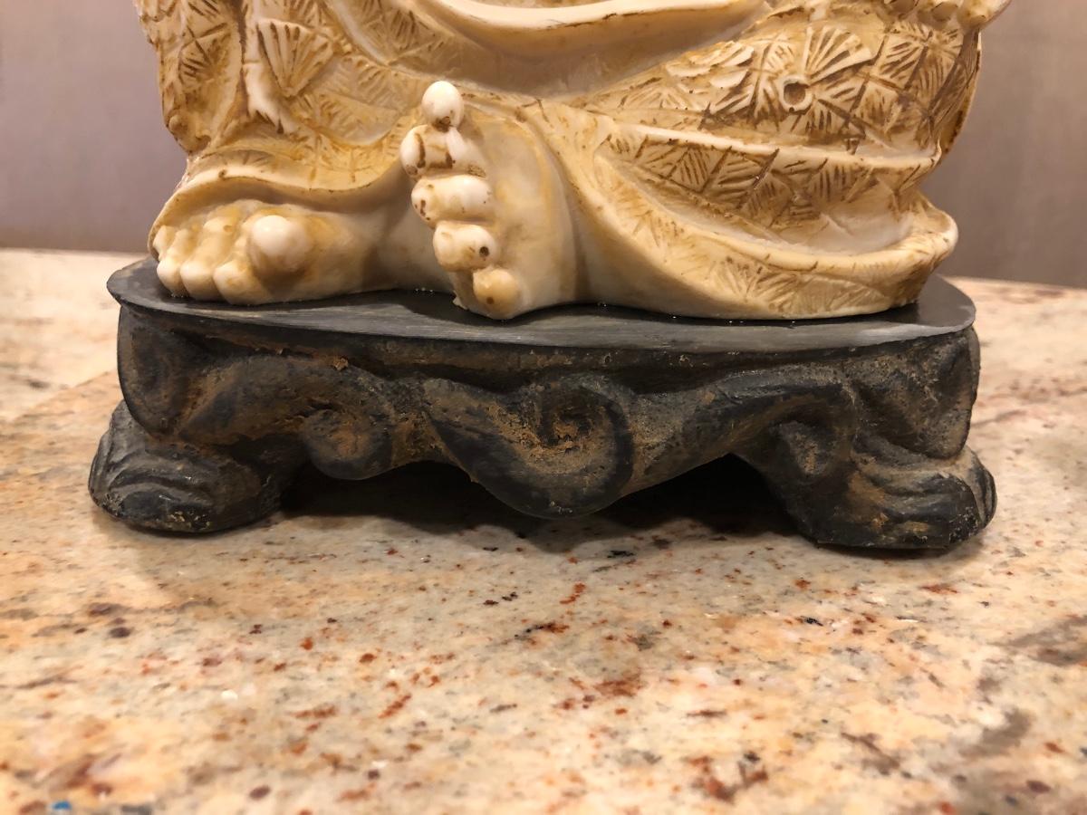 Two heavy statues depicting the laughing Buddha with stone bases. Statues measure 10” tall and 7” wide. One statue has fingers and toes broken (see photos).