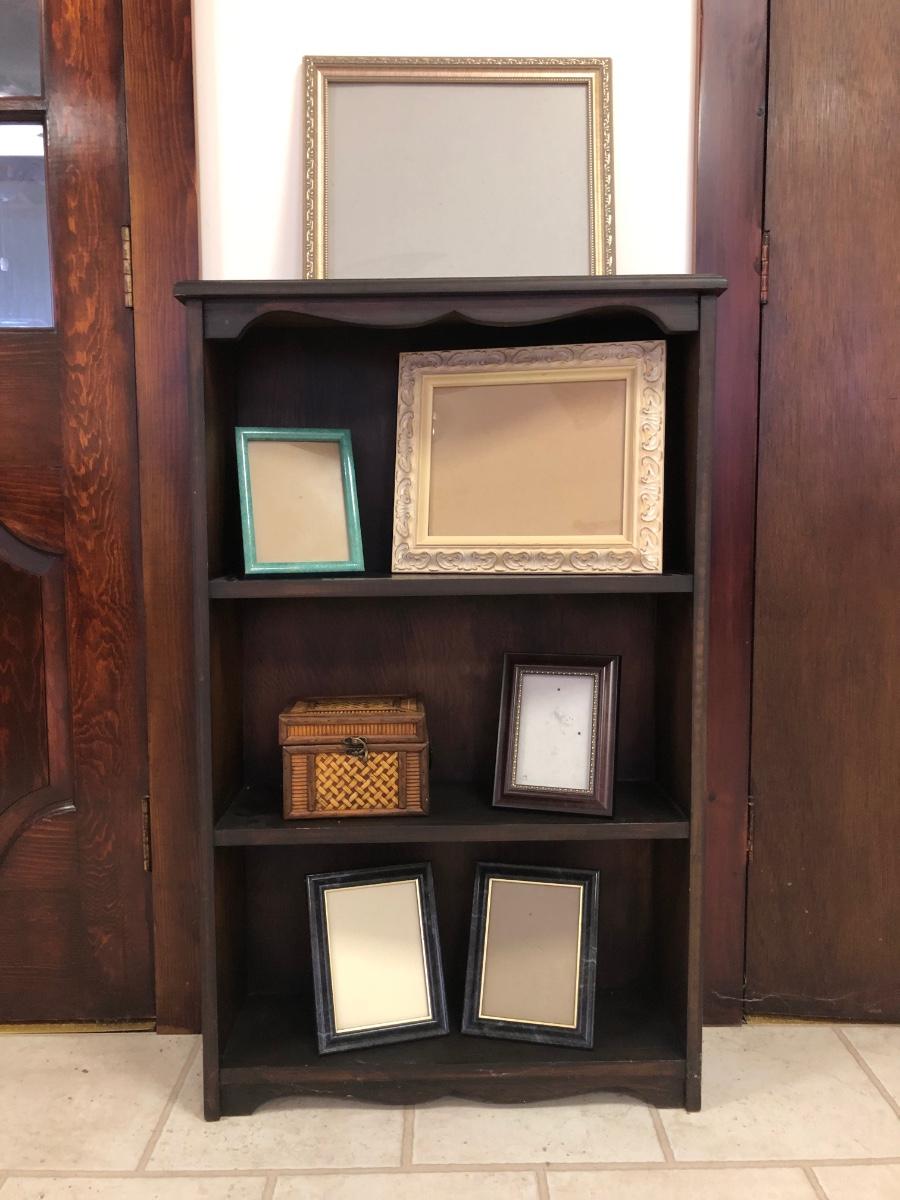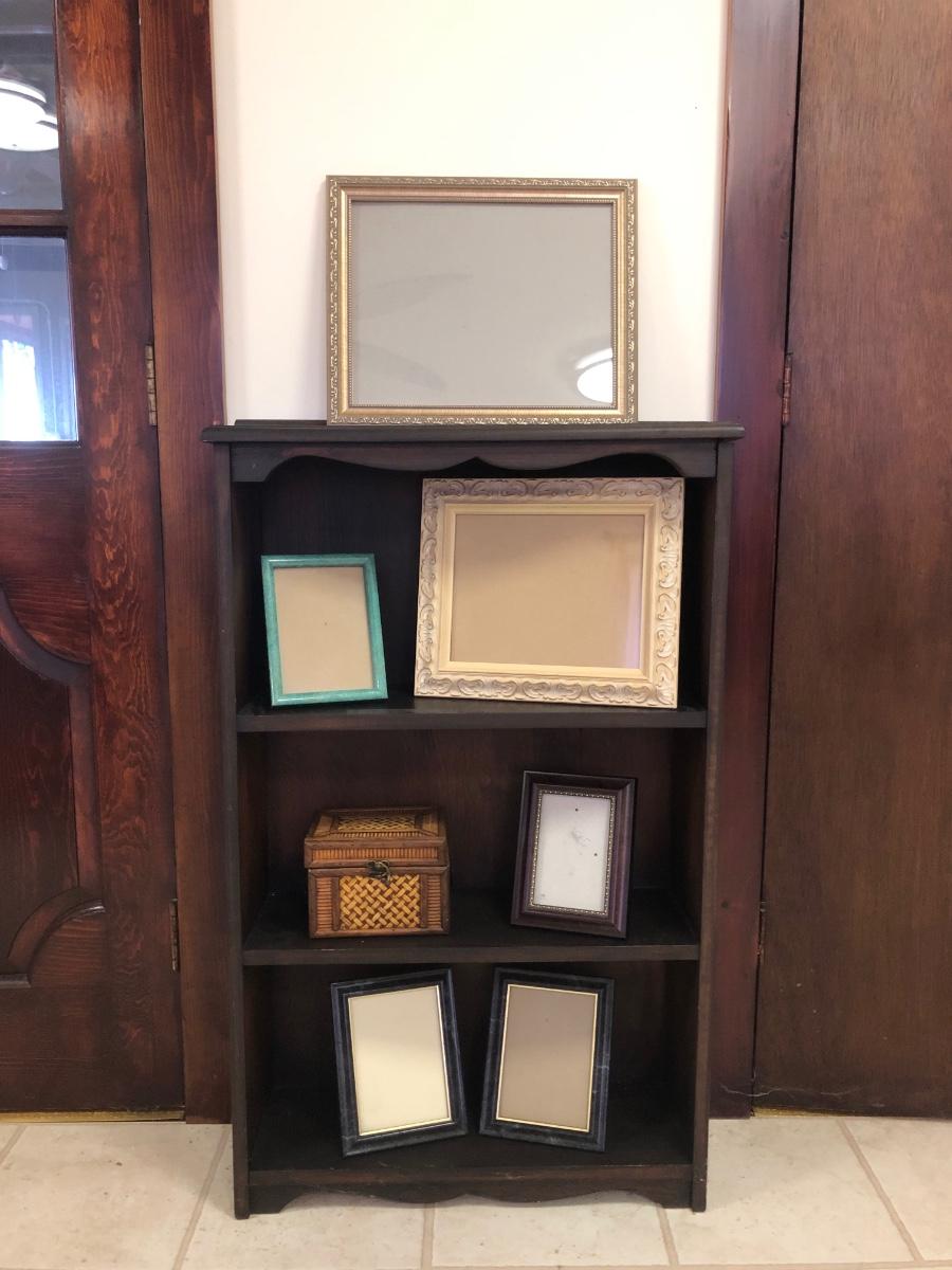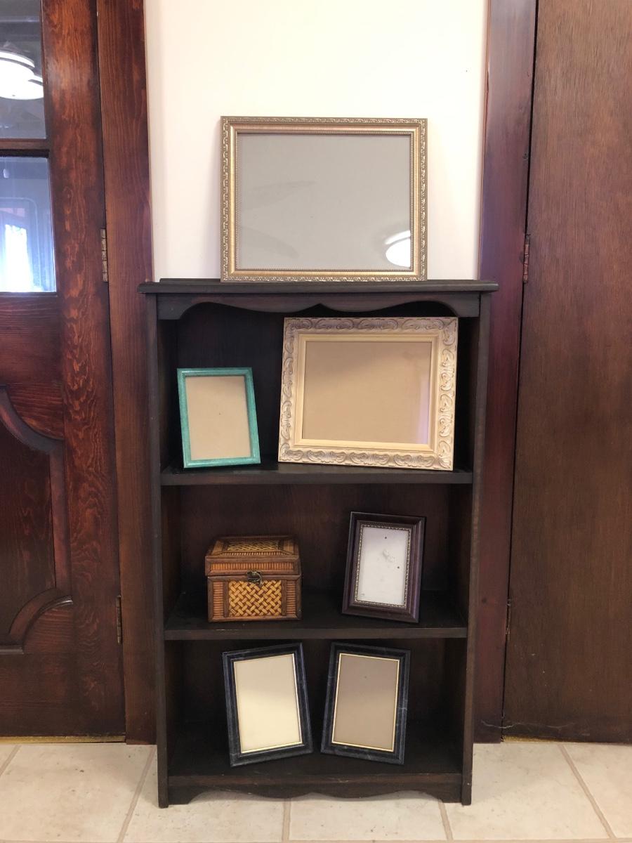Shelf has three sections and is made of wood. Includes six photo frames and a small trinket box made of a wicker-type material. Shelf measures 25W x 8D x 40H.