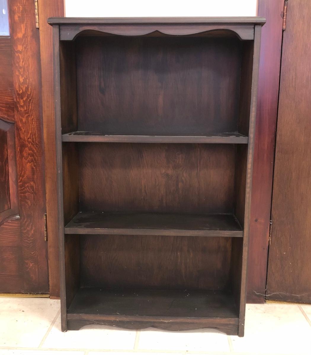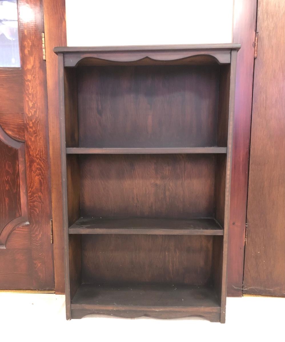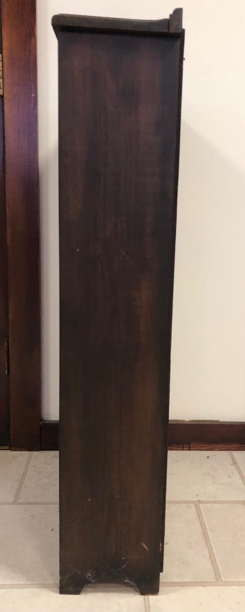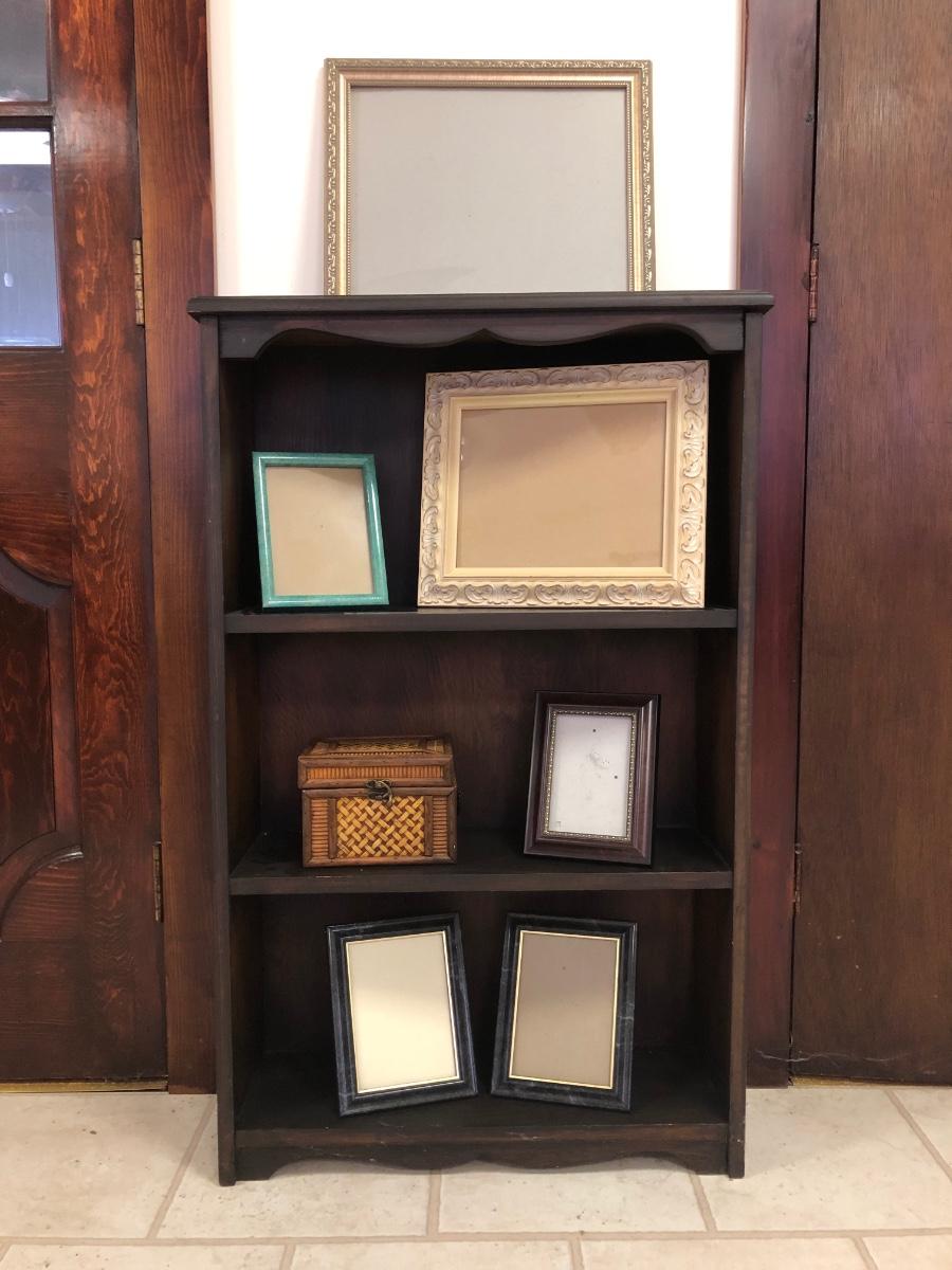 Shelf has three sections and is made of wood. Includes six photo frames and a small trinket box made of a wicker-type material. Shelf measures 25W x 8D x 40H.