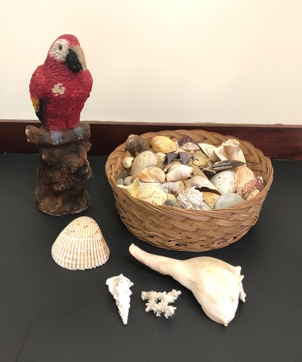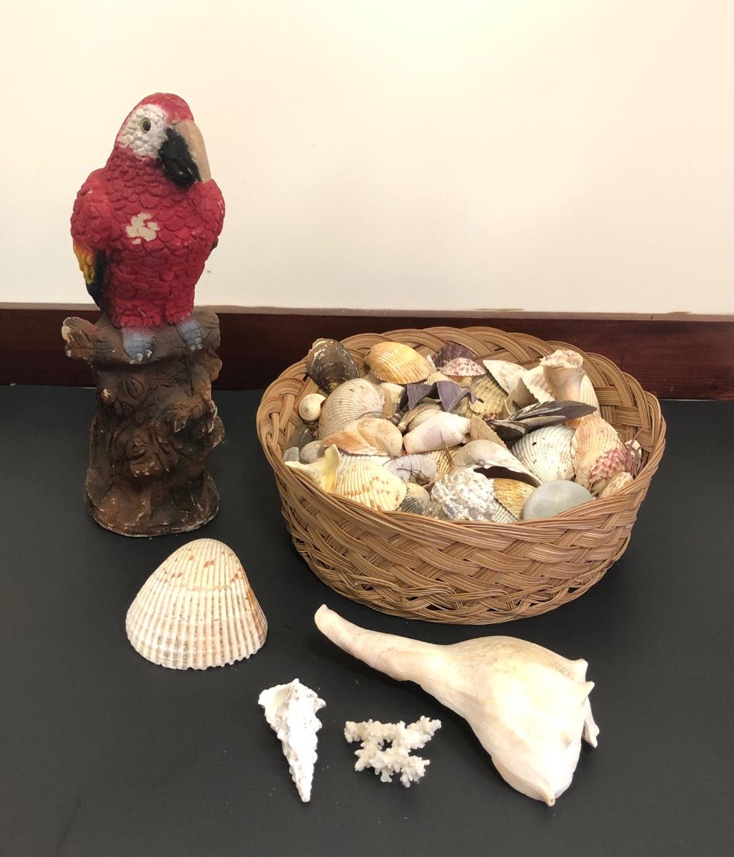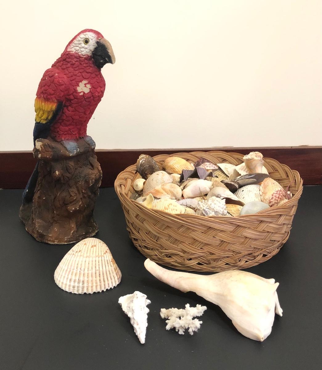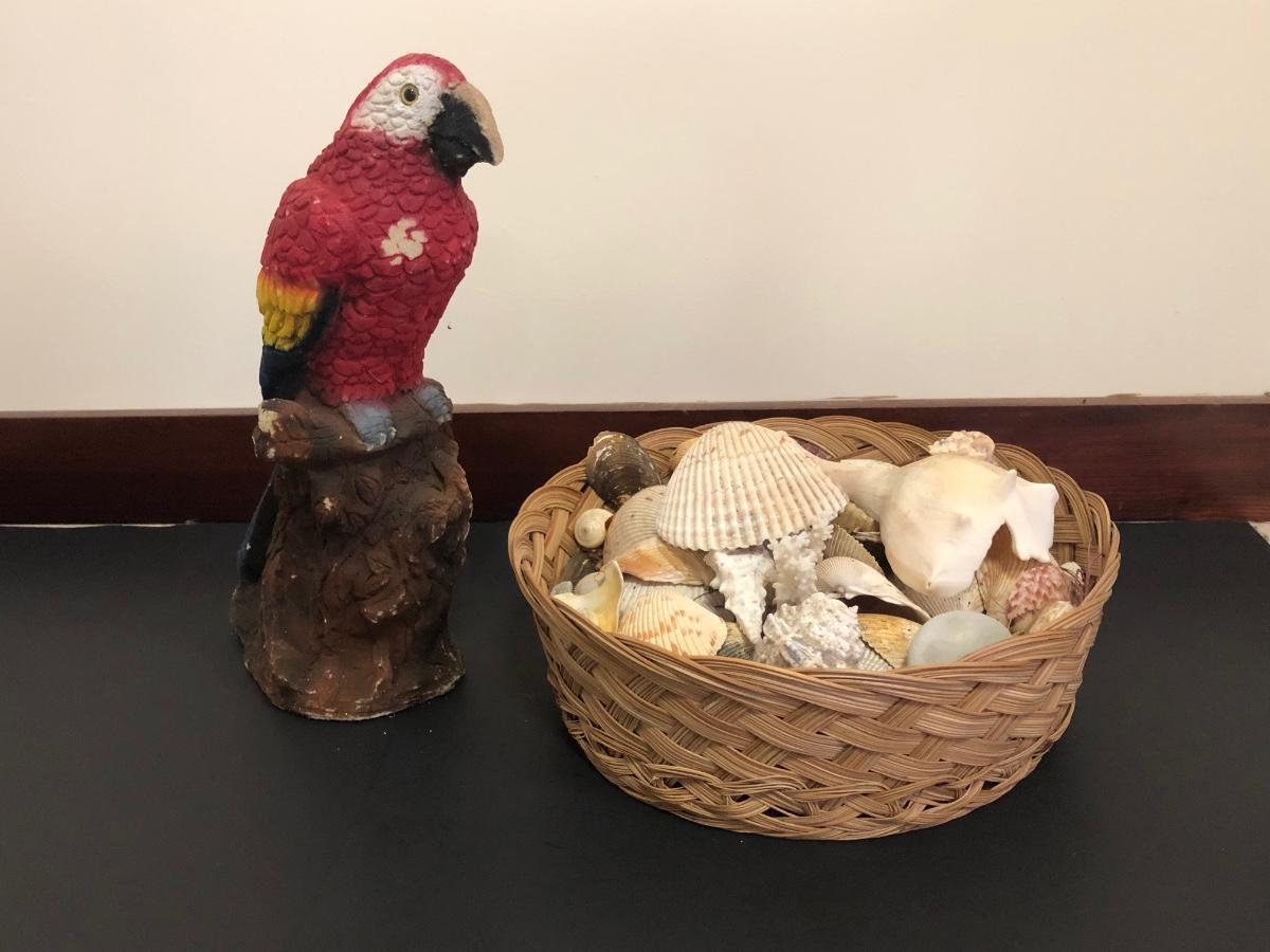 Red parrot statue is heavy and has some noticeable wear. Basket includes a variety of sea shells and some coral pieces.
