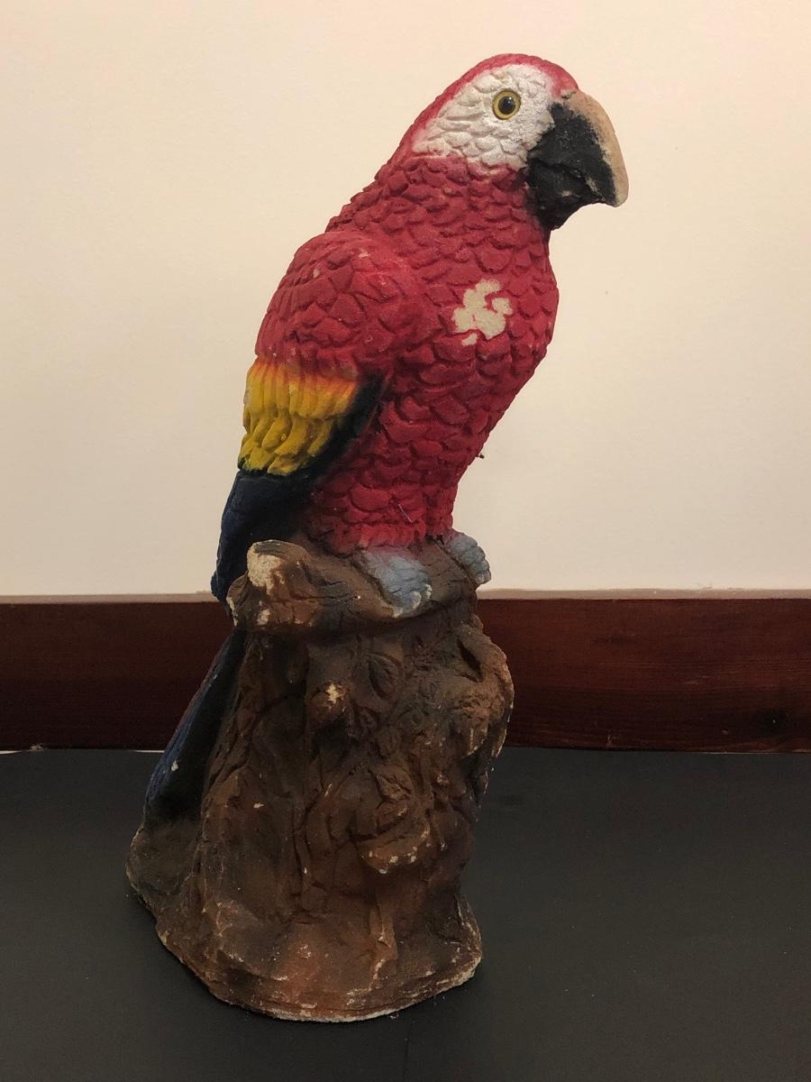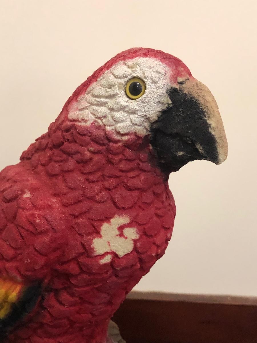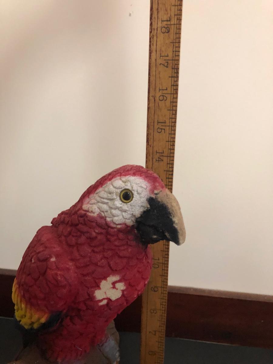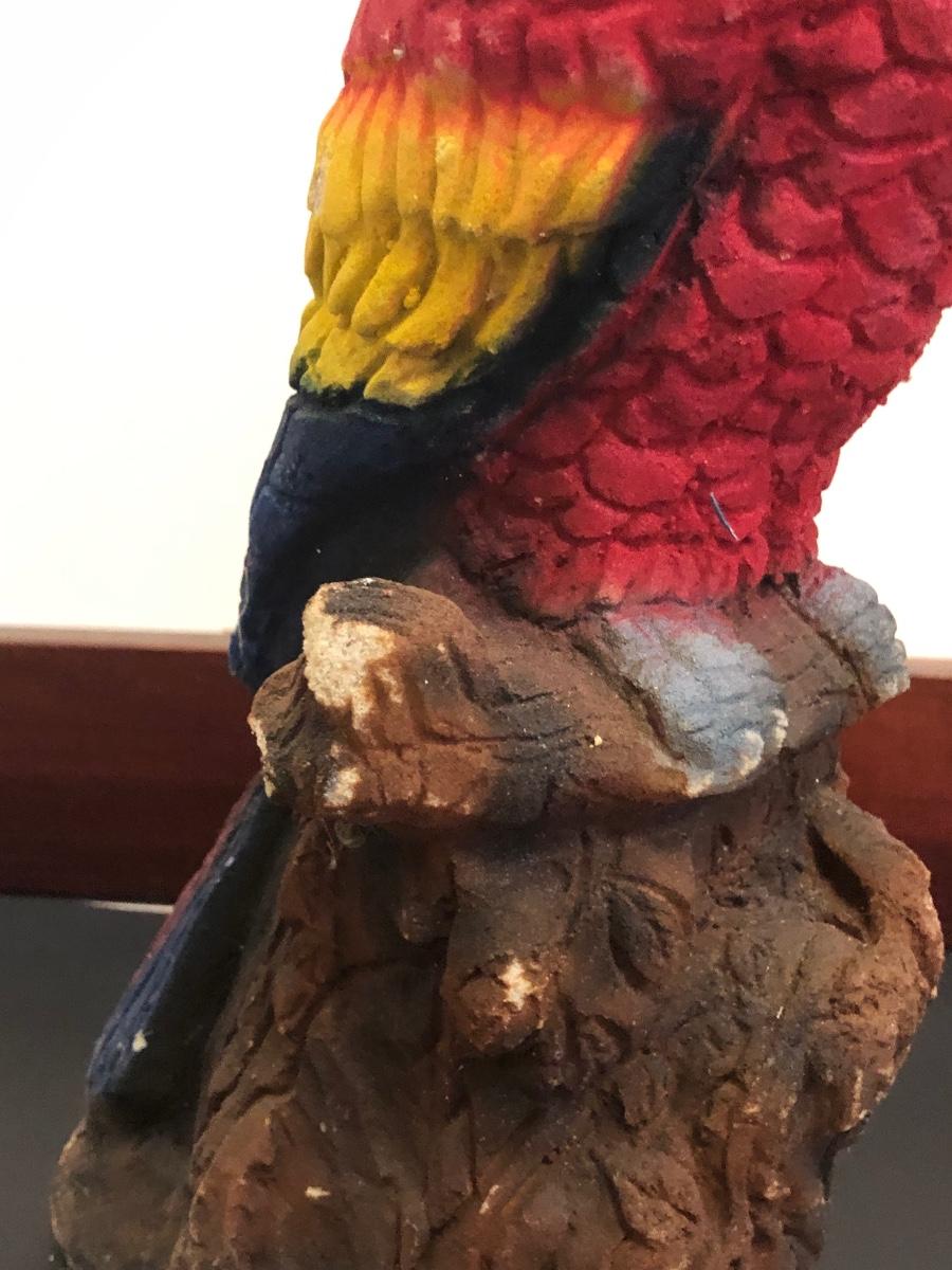 Red parrot statue is heavy and has some noticeable wear. Basket includes a variety of sea shells and some coral pieces.