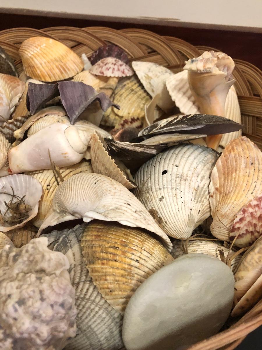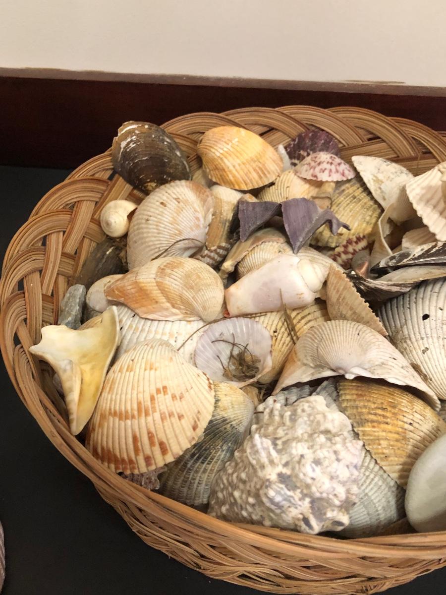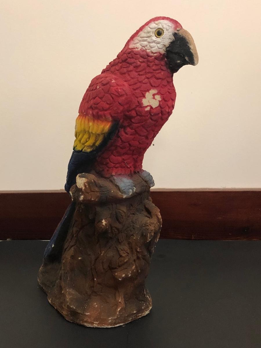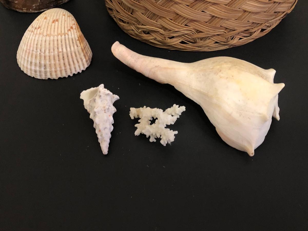 Red parrot statue is heavy and has some noticeable wear. Basket includes a variety of sea shells and some coral pieces.