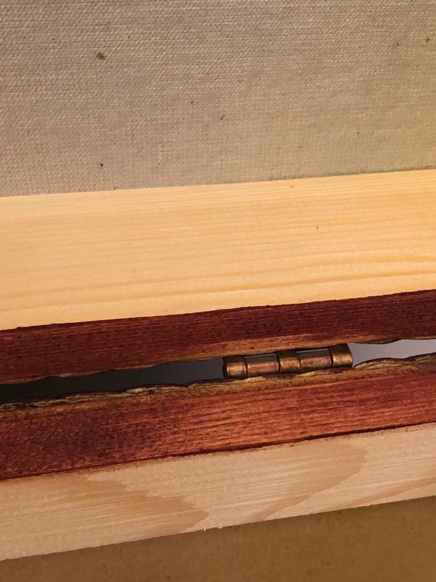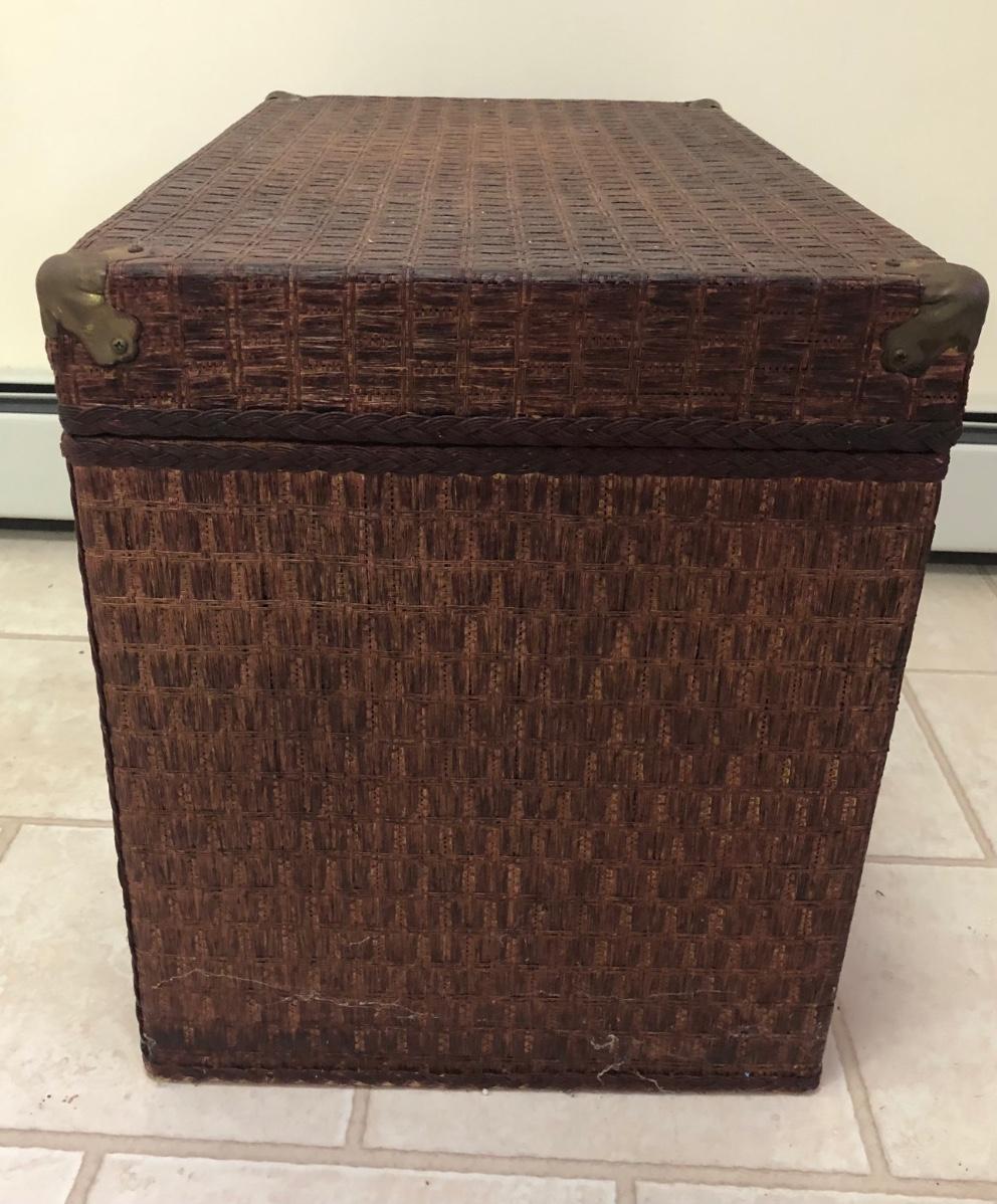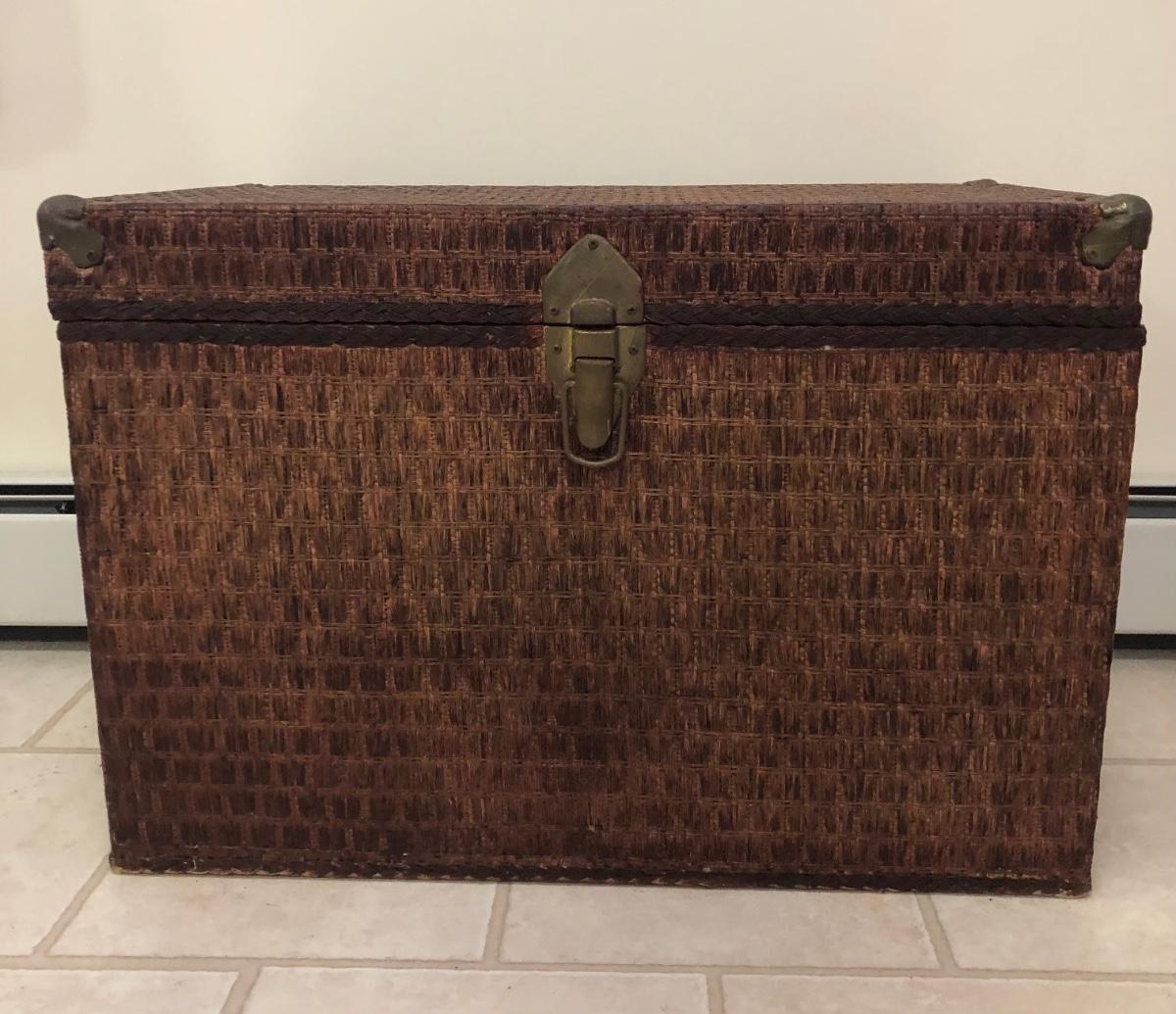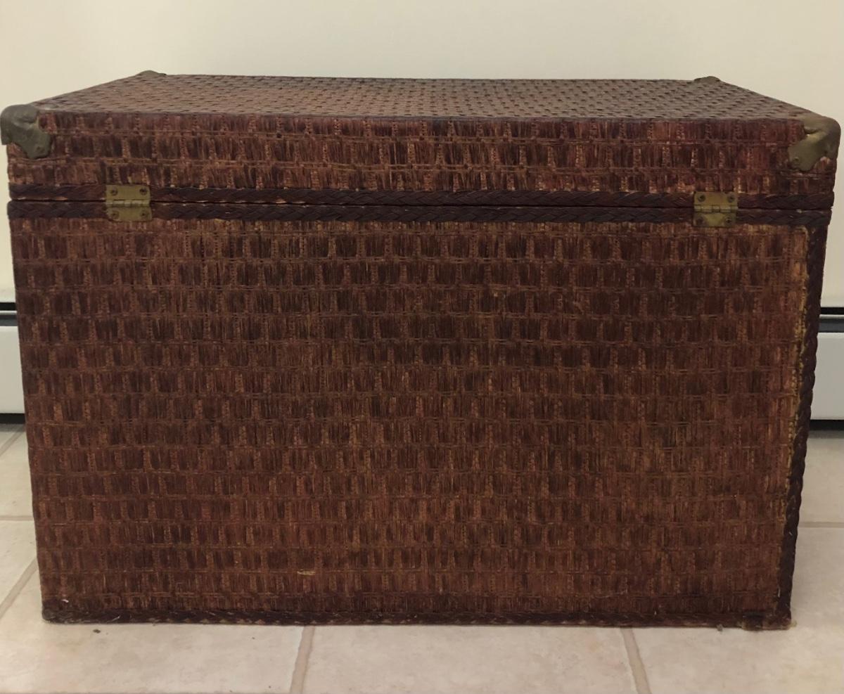 An wooden trunk with a brown wicker like cover and brass colored accents. Measures 28W x 16H x 19D.