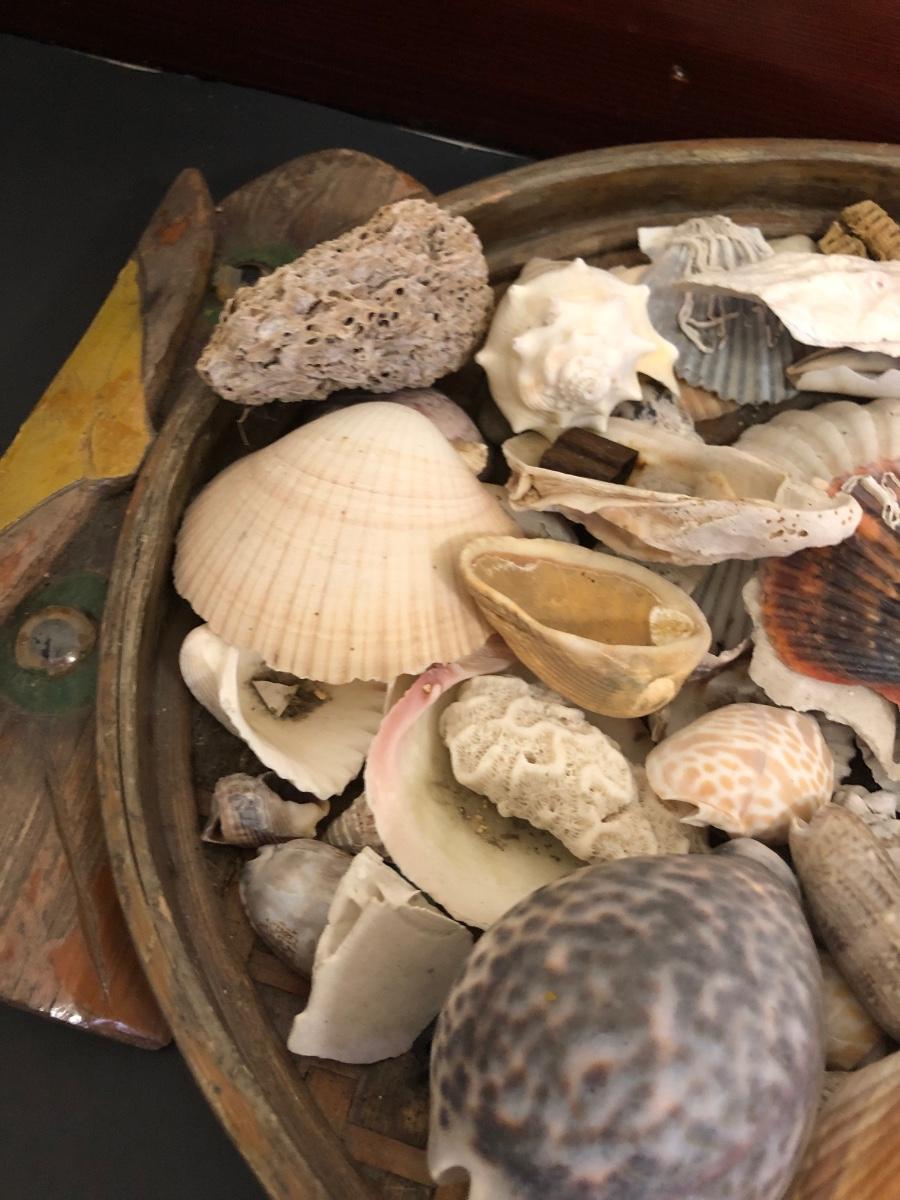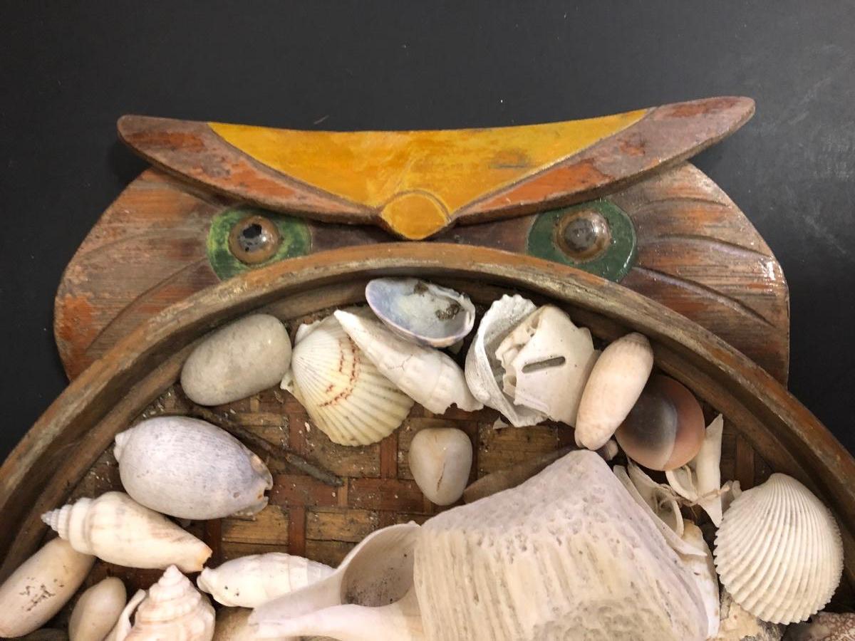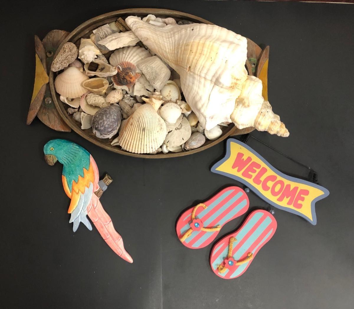 15-inch conch shell comes with a wooden owl tray and the pictured sea shells. Also includes a glittery parrot decoration and a "welcome" sign with pink flip flops.