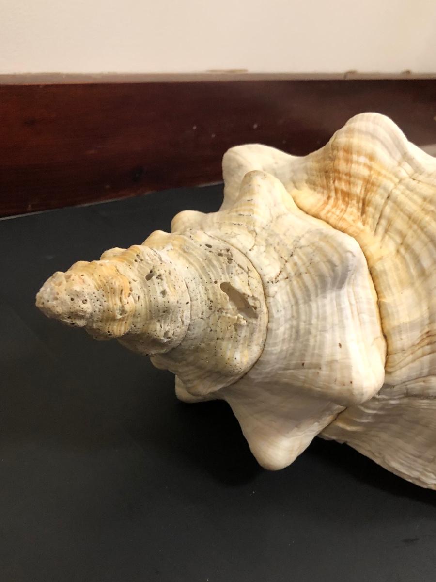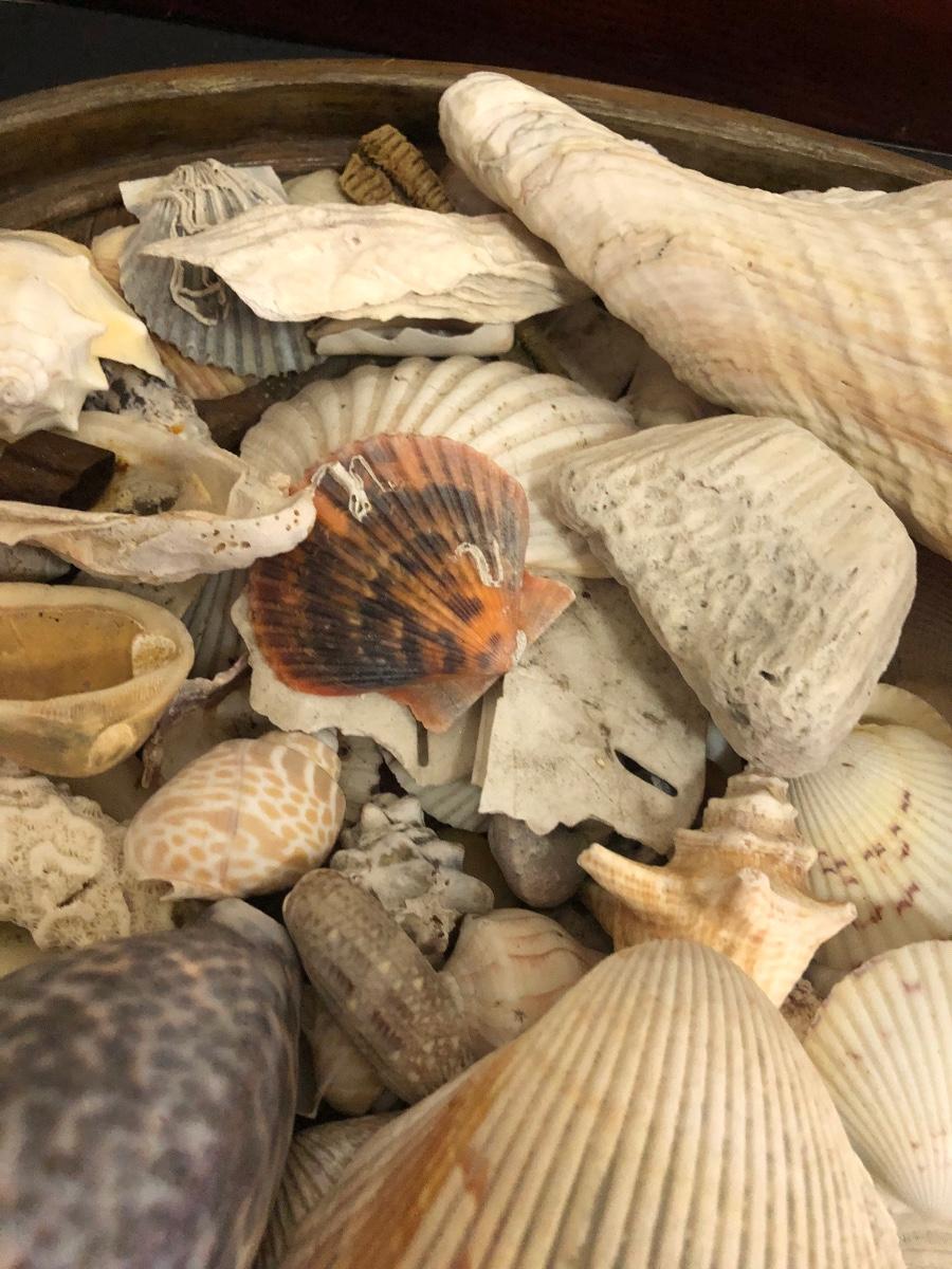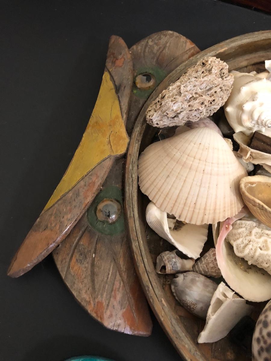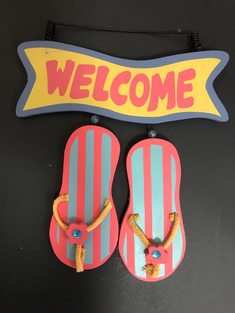 15-inch conch shell comes with a wooden owl tray and the pictured sea shells. Also includes a glittery parrot decoration and a "welcome" sign with pink flip flops.
