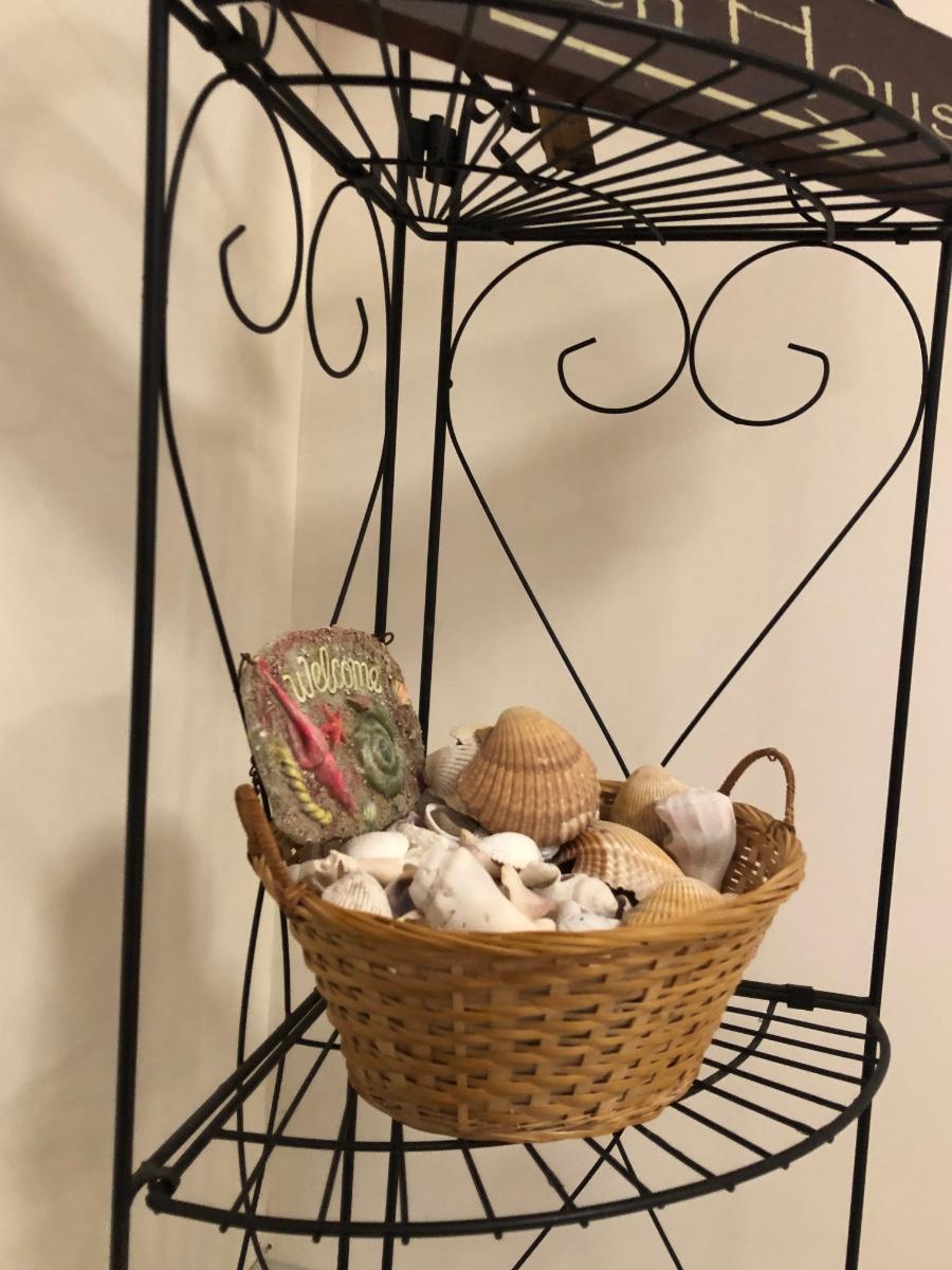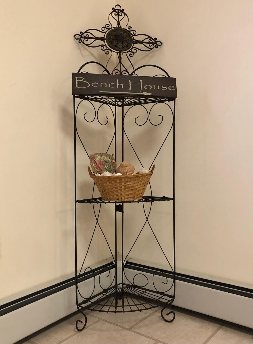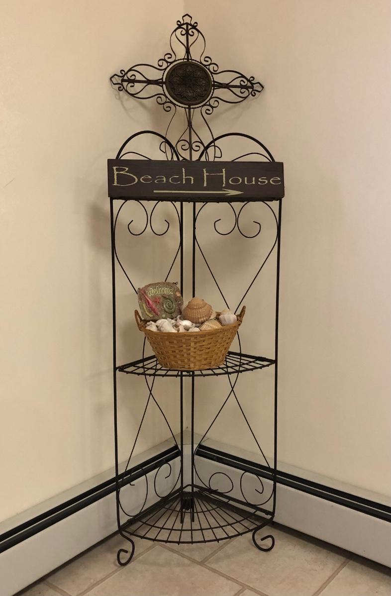 Wire frame corner shelf with heard design. Shelf folds out to be 12W x 12D x 34H. Decor collection includes a decorative cross, a "Beach House" sign, a welcome sign, and a basket of sea shells.
