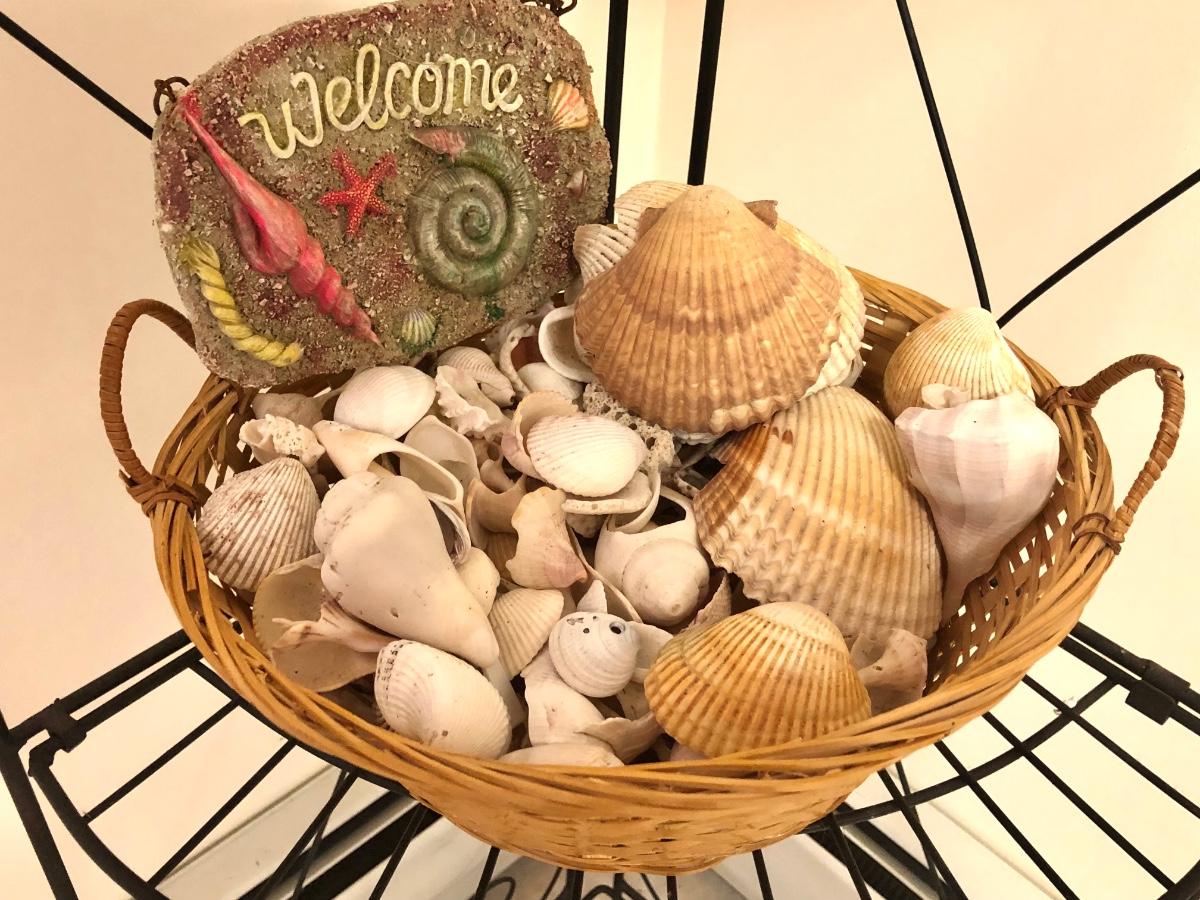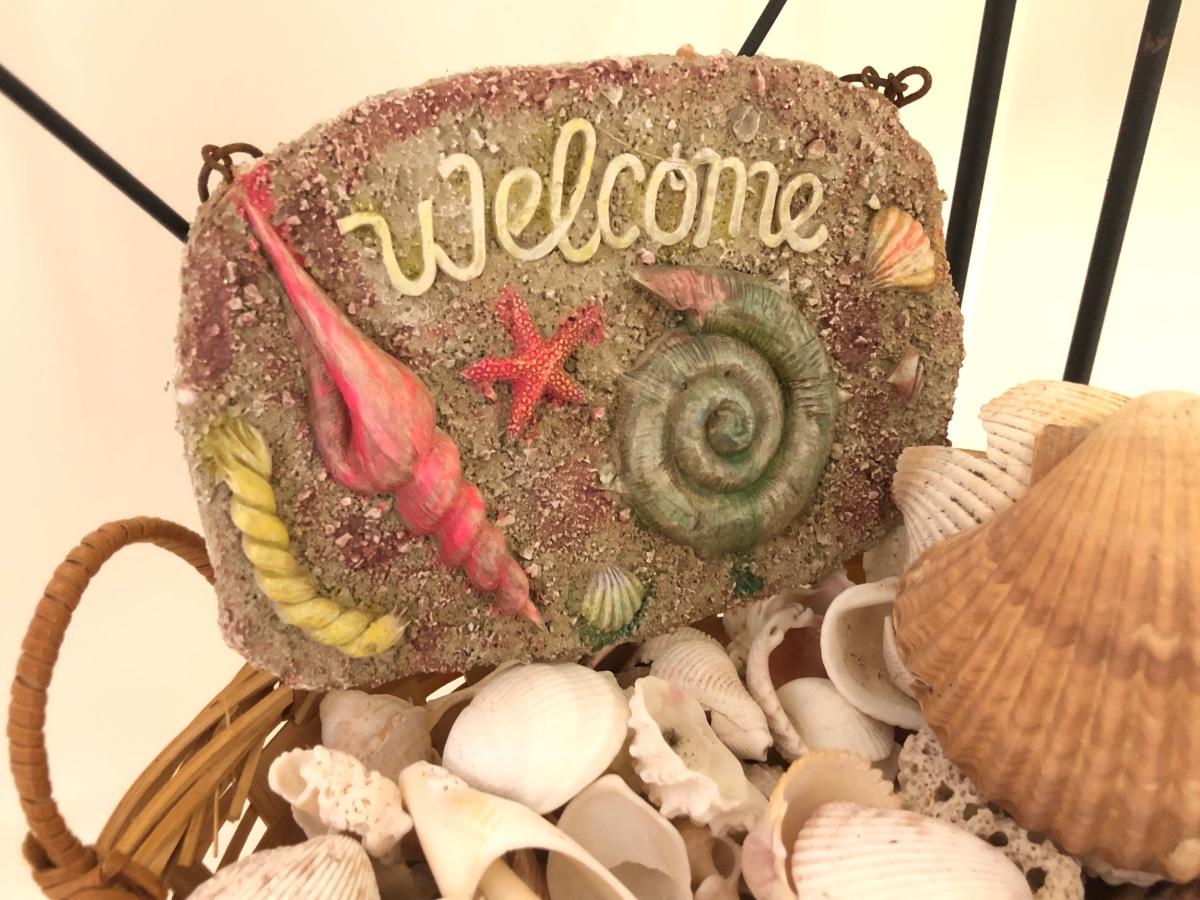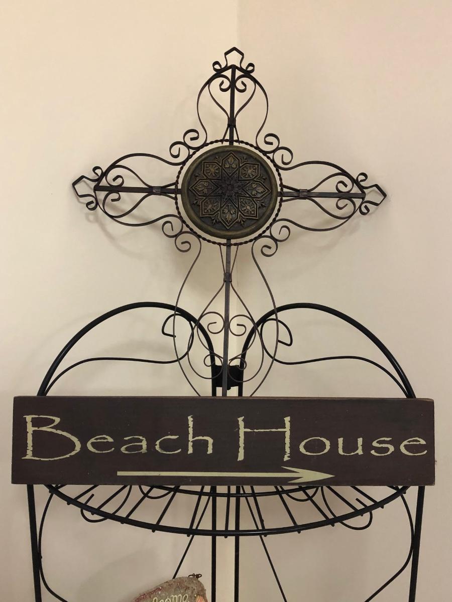 Wire frame corner shelf with heard design. Shelf folds out to be 12W x 12D x 34H. Decor collection includes a decorative cross, a "Beach House" sign, a welcome sign, and a basket of sea shells.