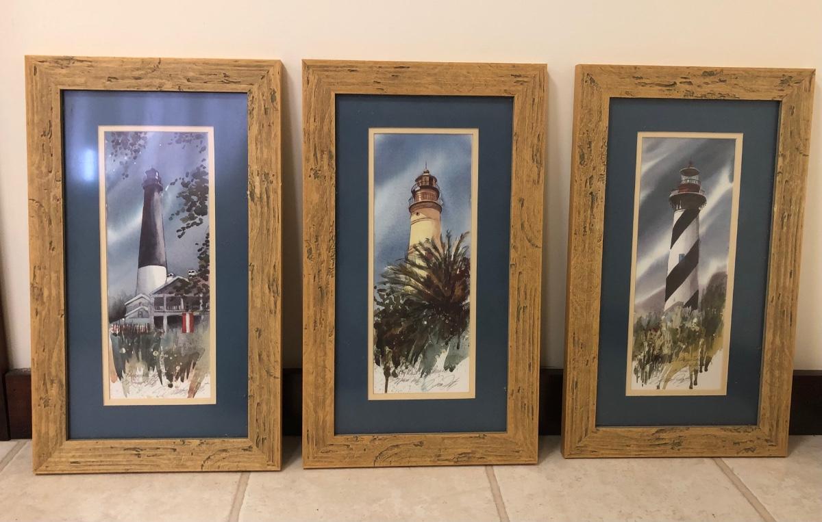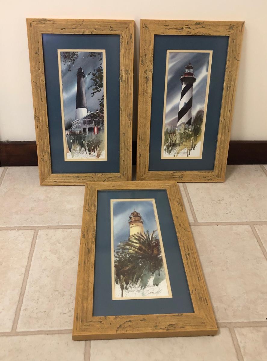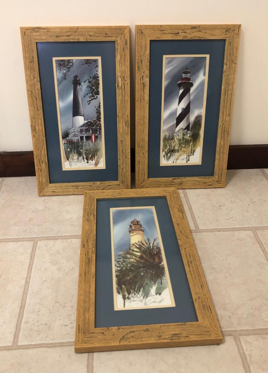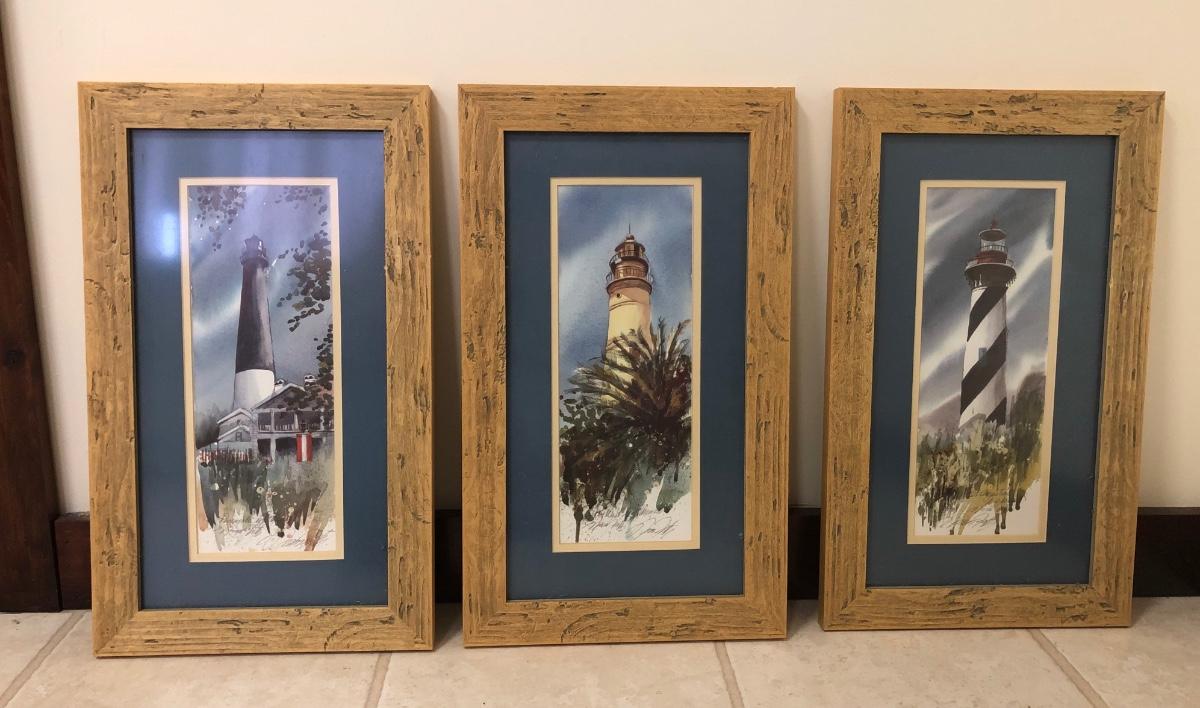 Three framed prints depicting different lighthouses. Each measure 11.5 x 20 inches.