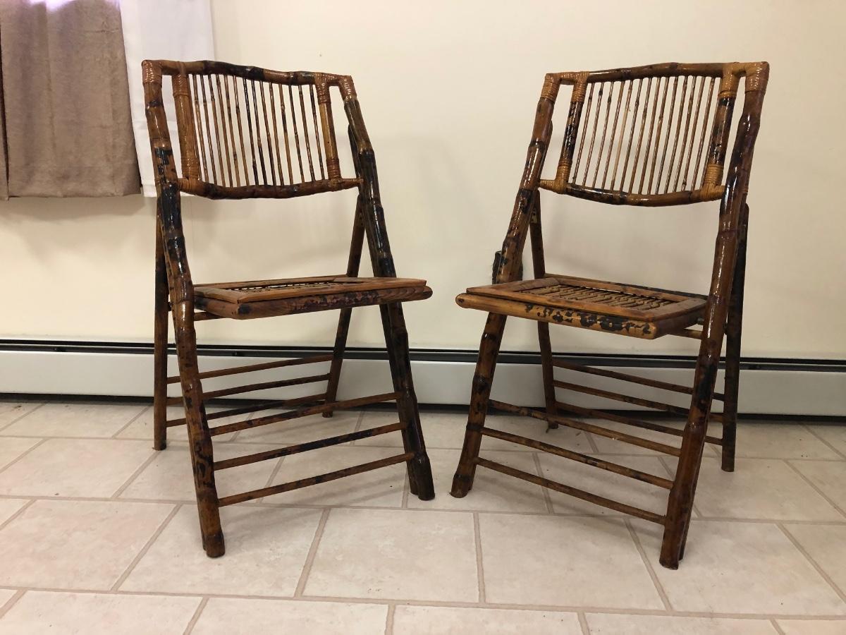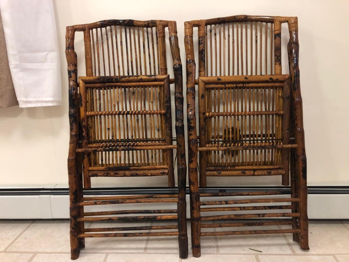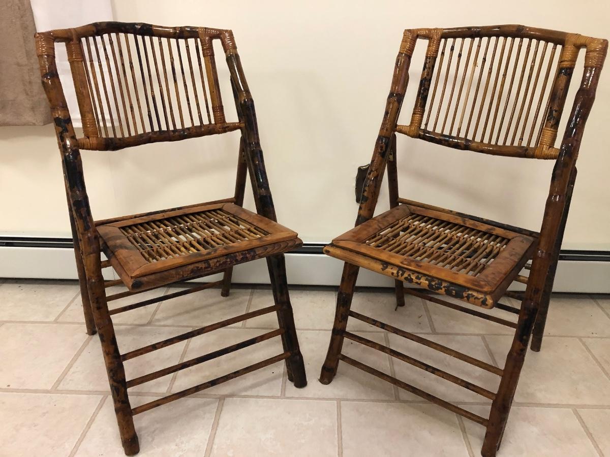 Two bamboo folding chairs. When open, chairs each measure 18W x 17D x 35H.