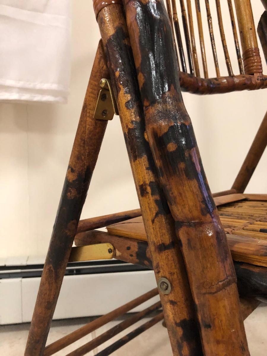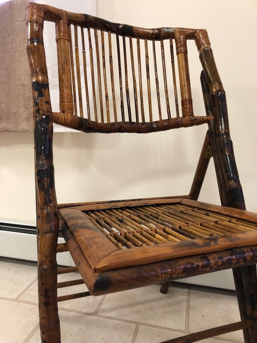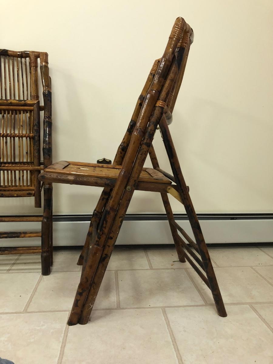 Two bamboo folding chairs. When open, chairs each measure 18W x 17D x 35H.