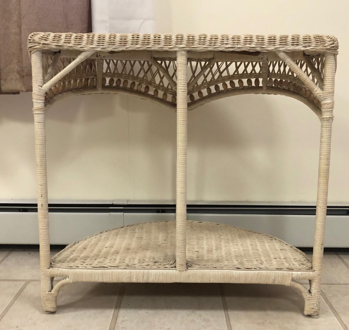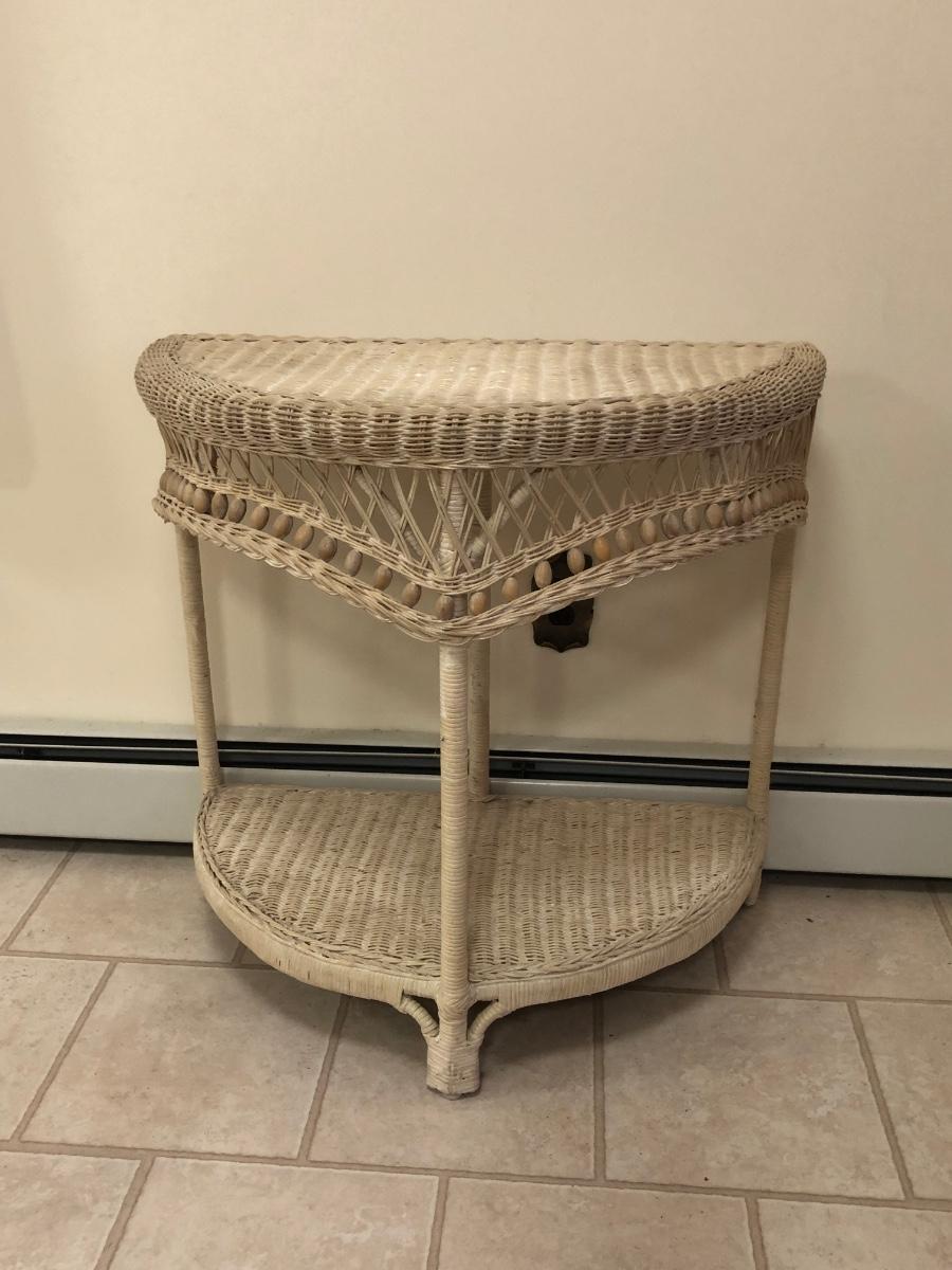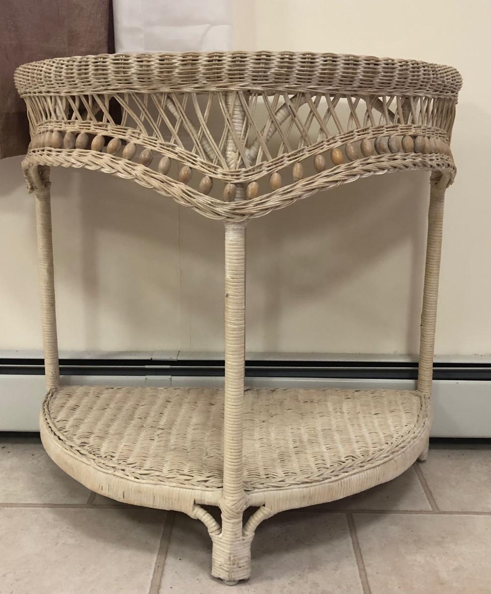 One half-circle wicker table. Measures 30W x 15D x 29H.