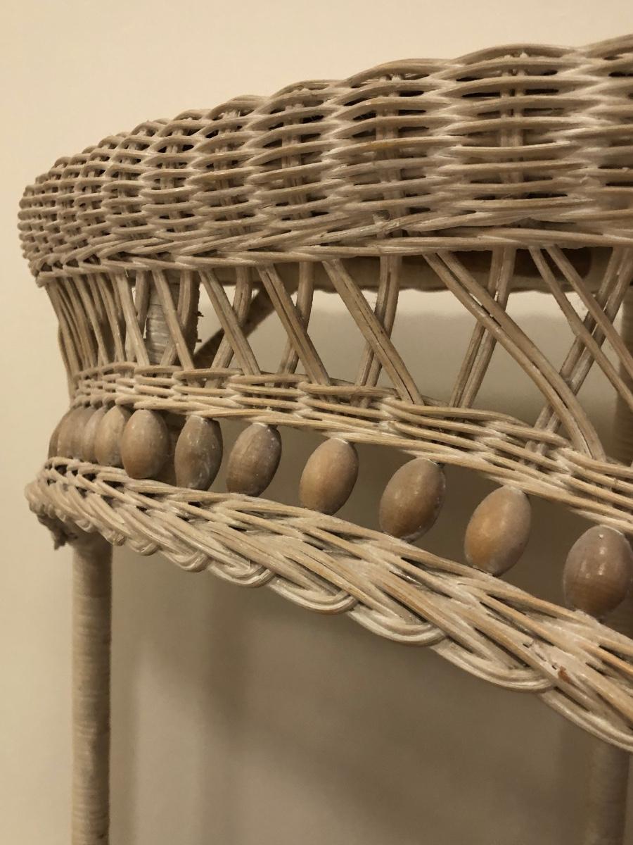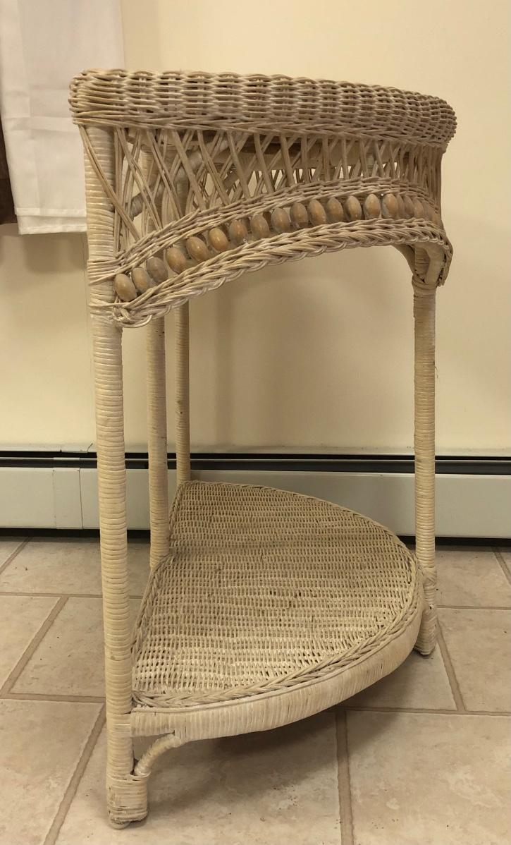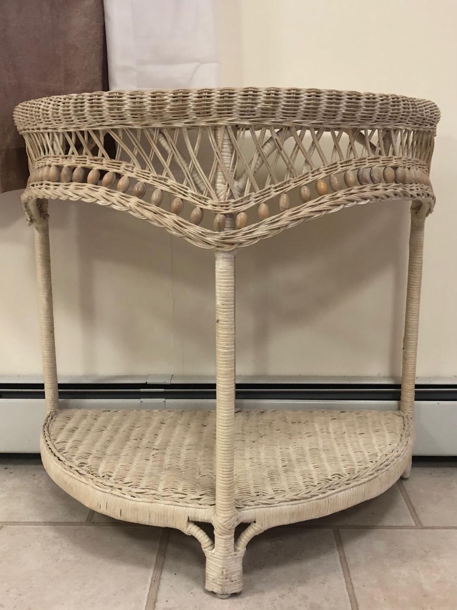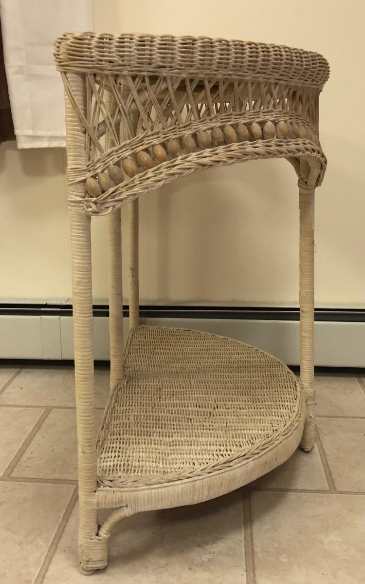 One half-circle wicker table. Measures 30W x 15D x 29H.
