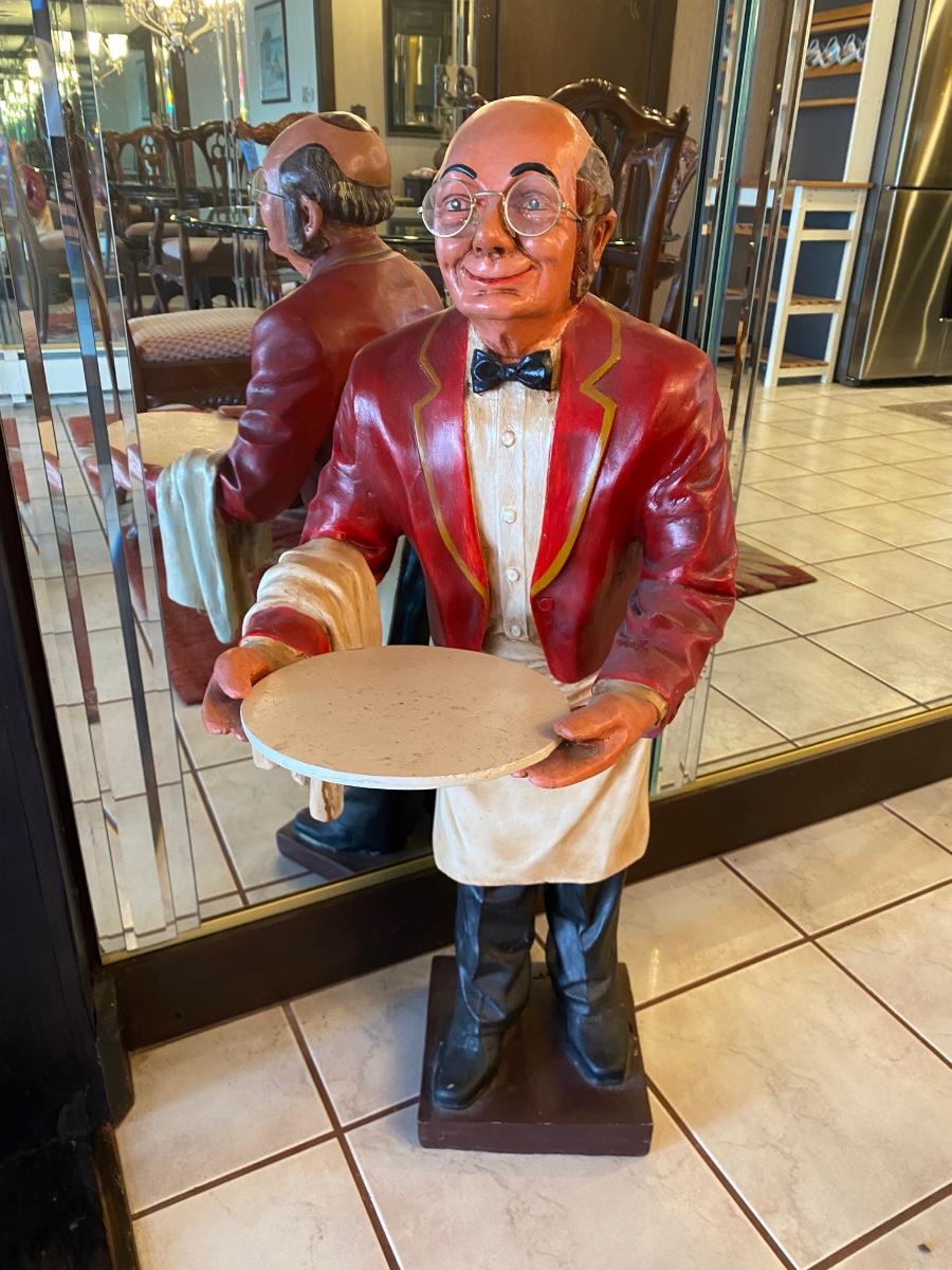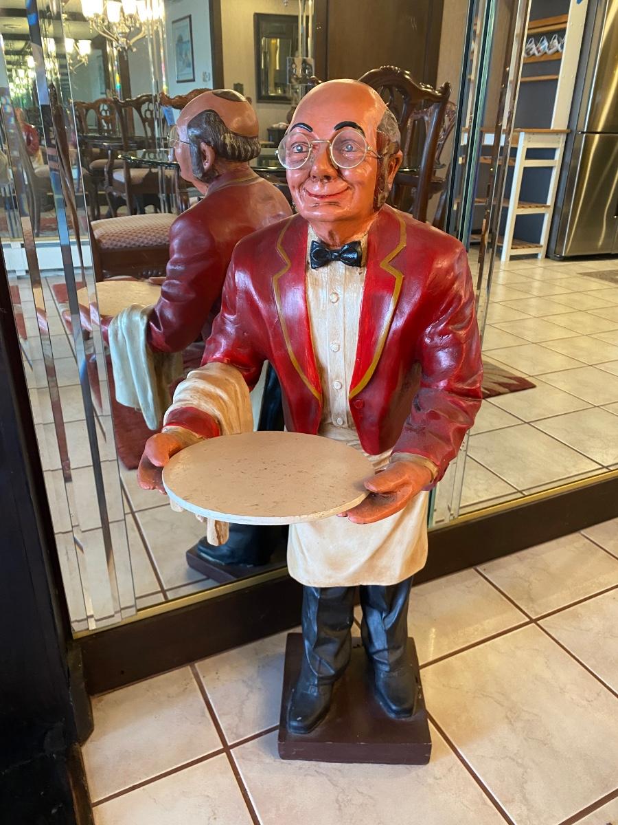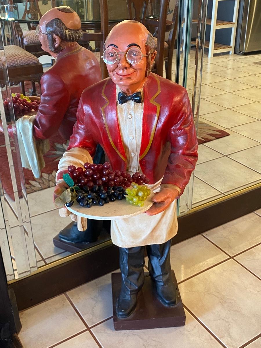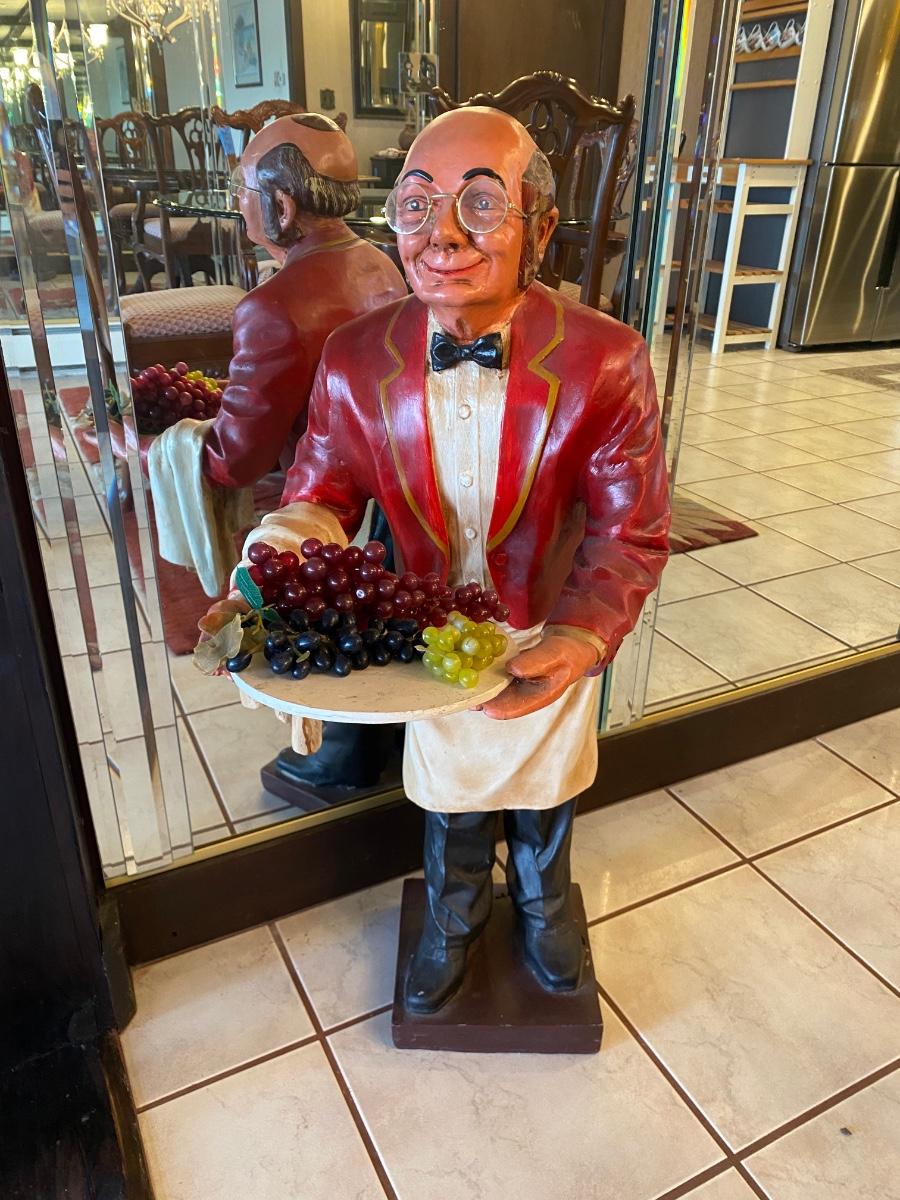 Statue of a balding butler with glasses, a red jacket, and bowtie. He holds a plate with removable faux grapes (included). This statue measures 37 inches tall.