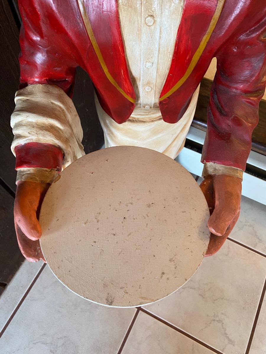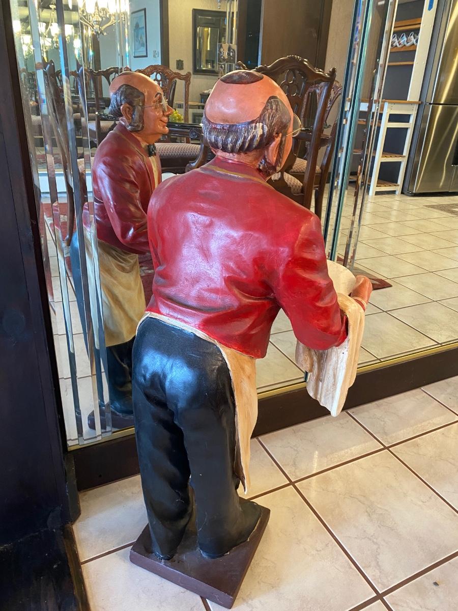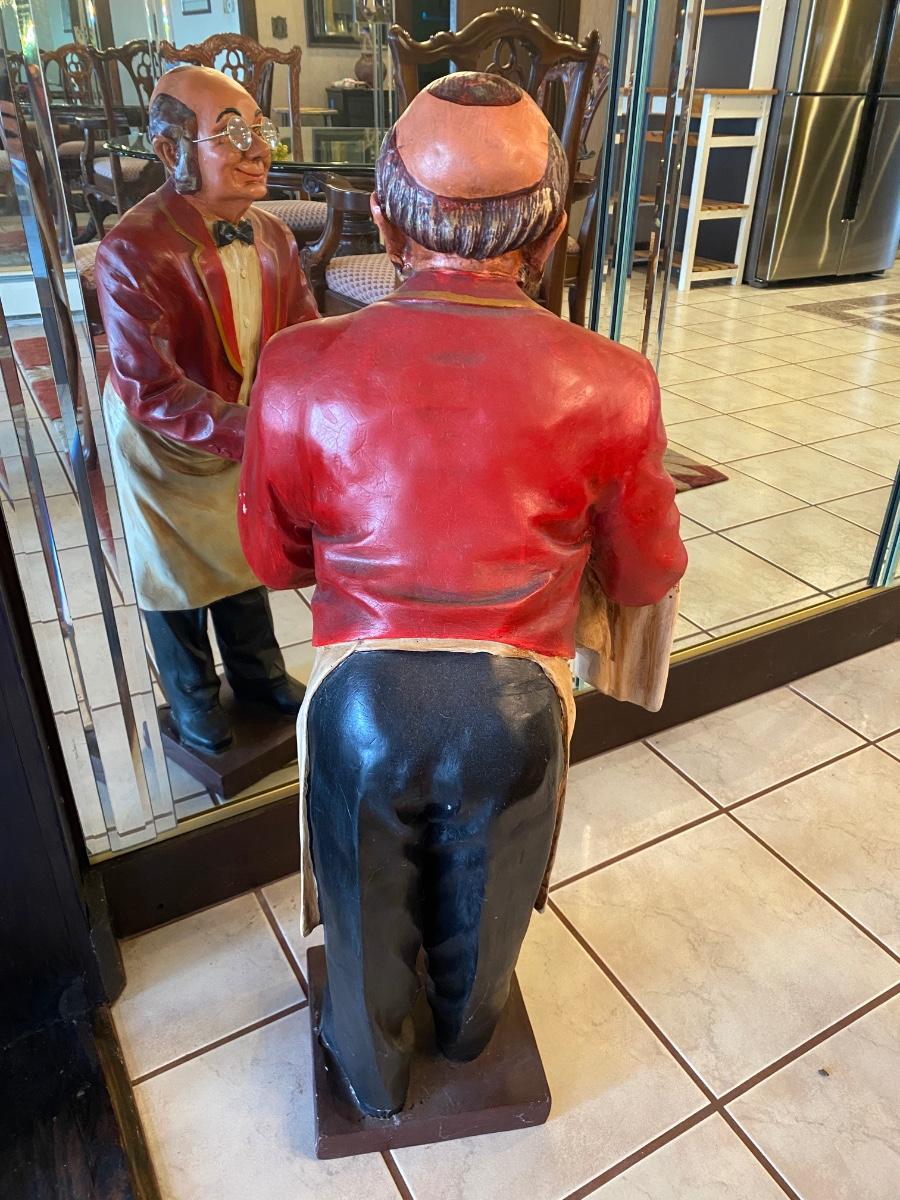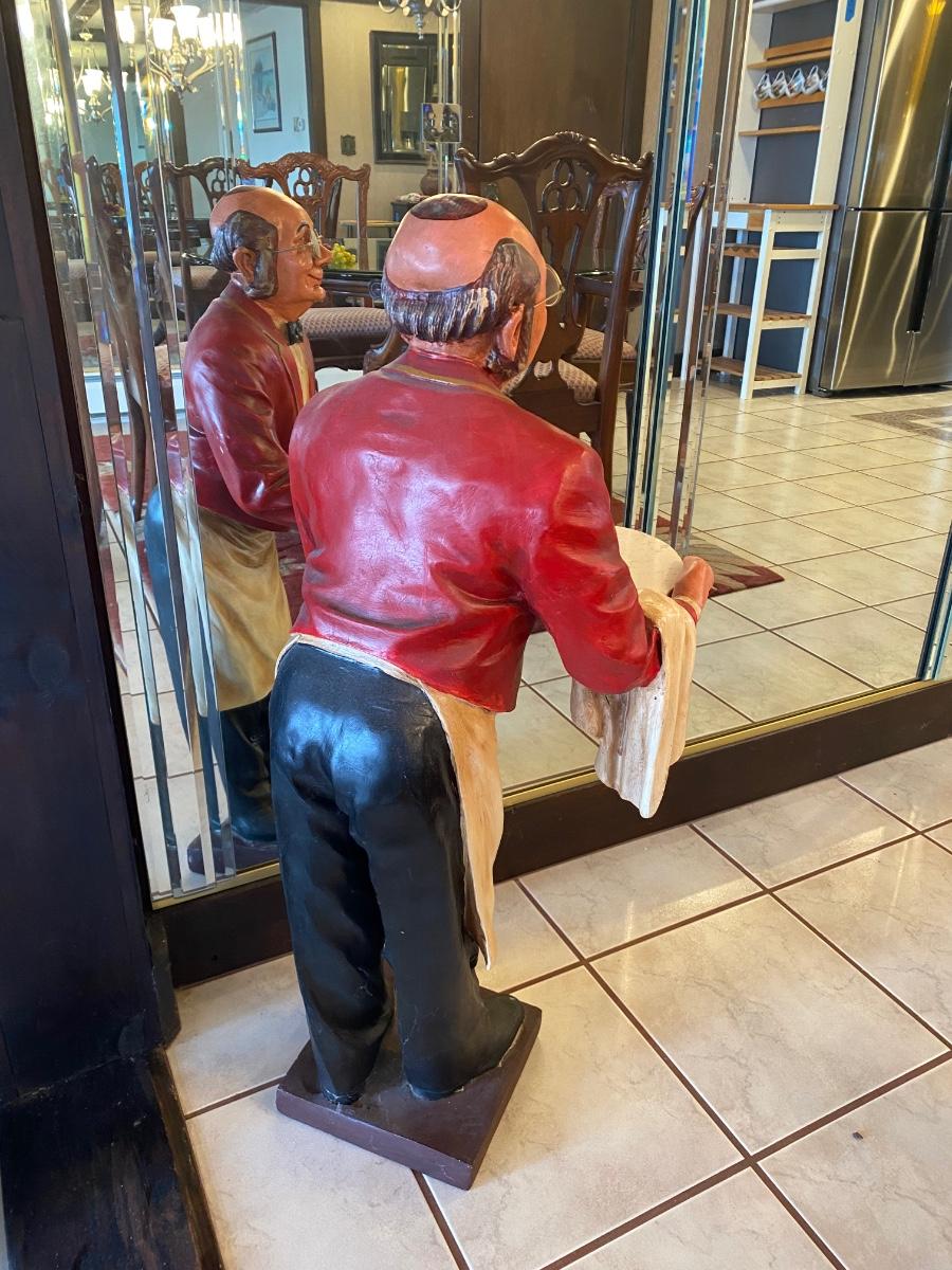 Statue of a balding butler with glasses, a red jacket, and bowtie. He holds a plate with removable faux grapes (included). This statue measures 37 inches tall.