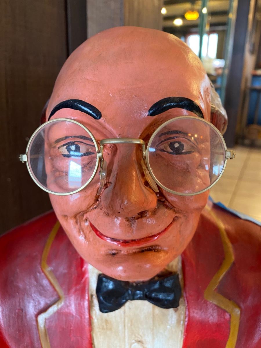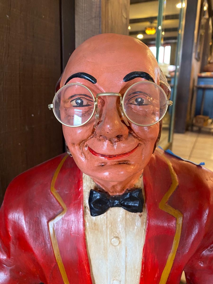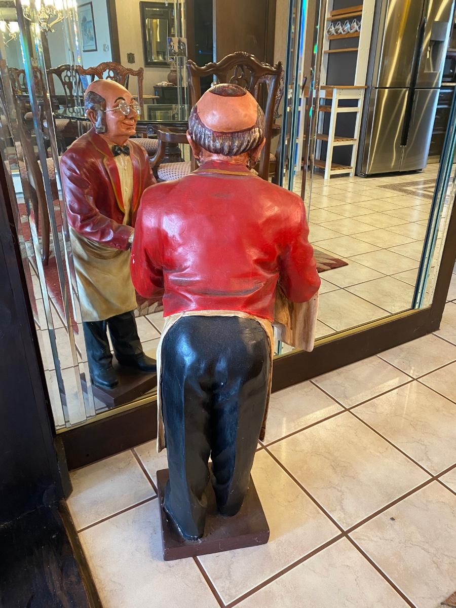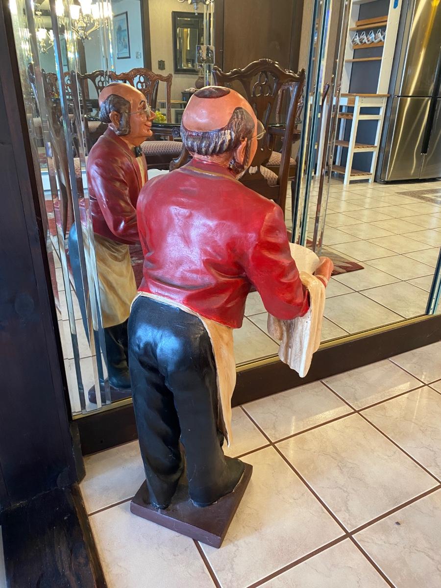 Statue of a balding butler with glasses, a red jacket, and bowtie. He holds a plate with removable faux grapes (included). This statue measures 37 inches tall.