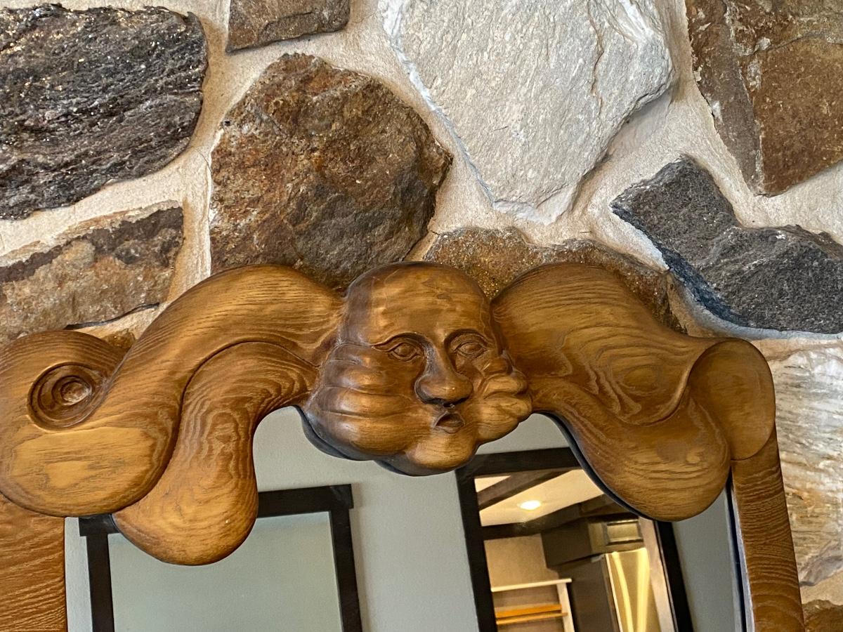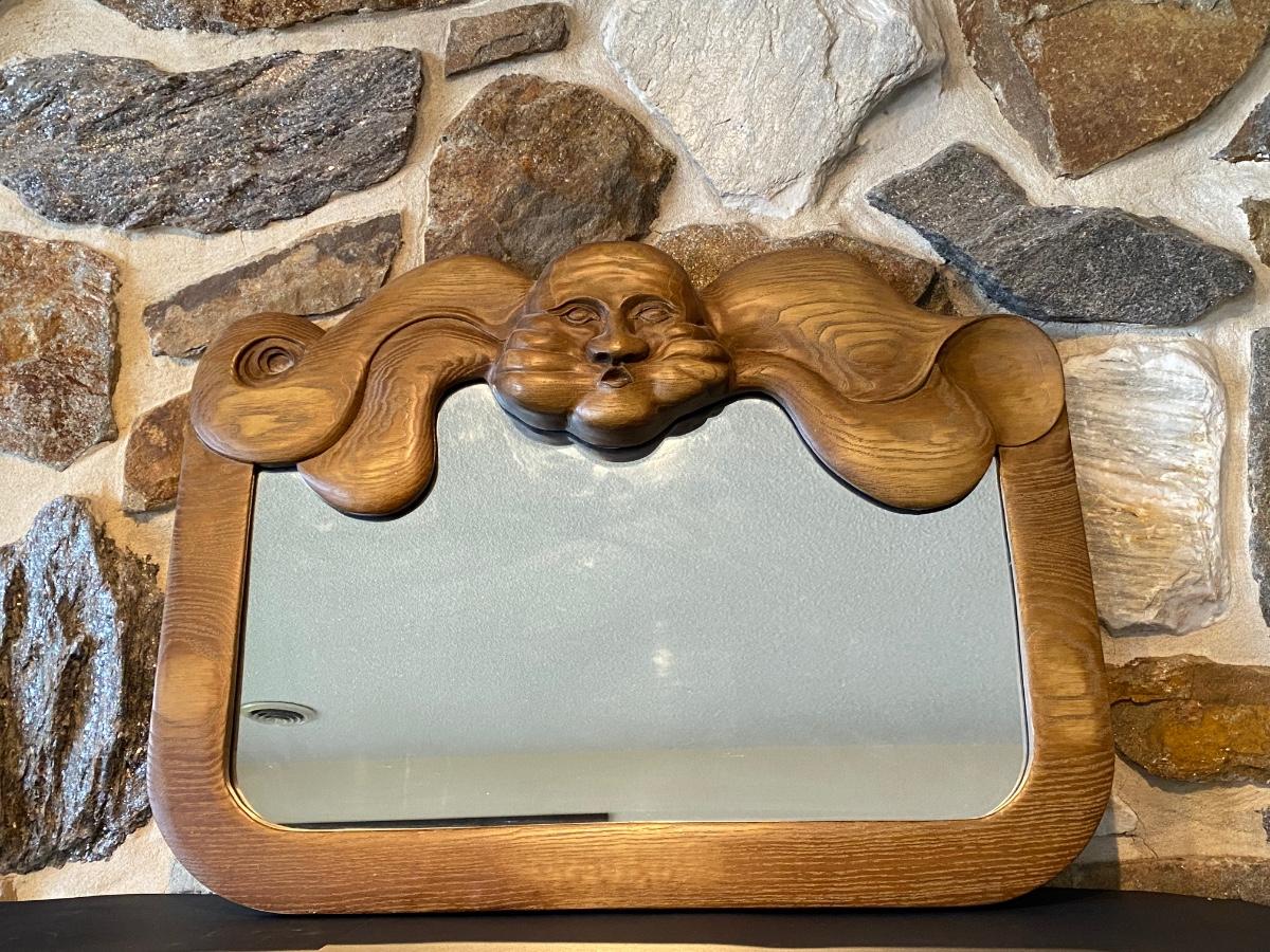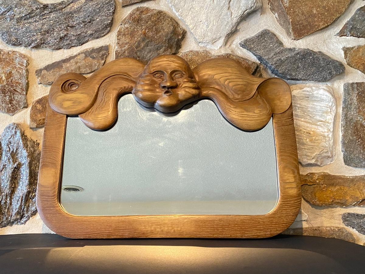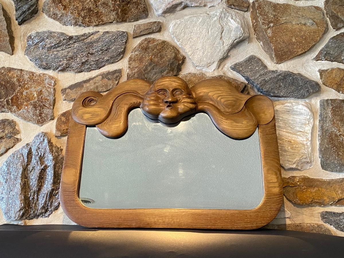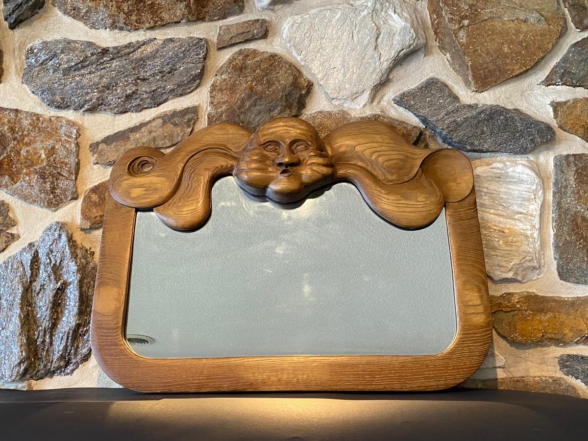 Carved composite mirror made to hang on the wall. Measures 30.5 x 23 inches.