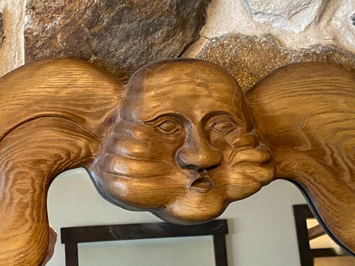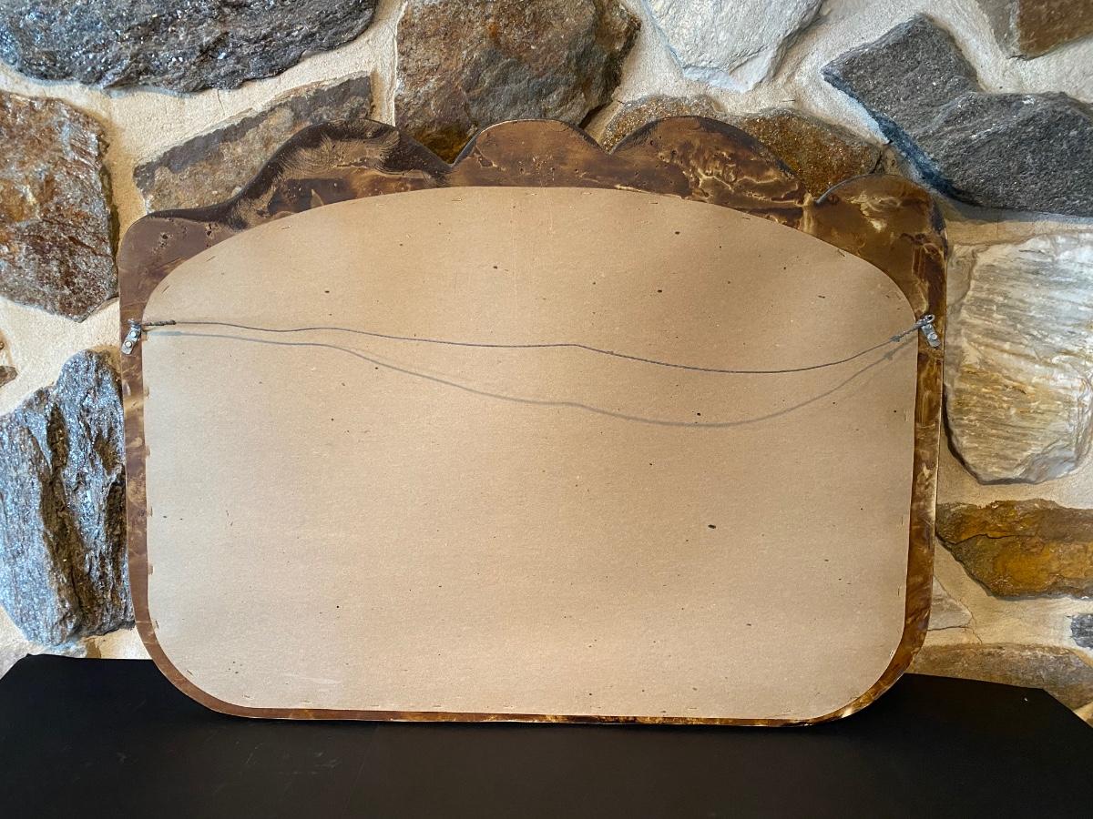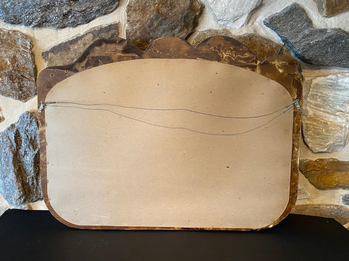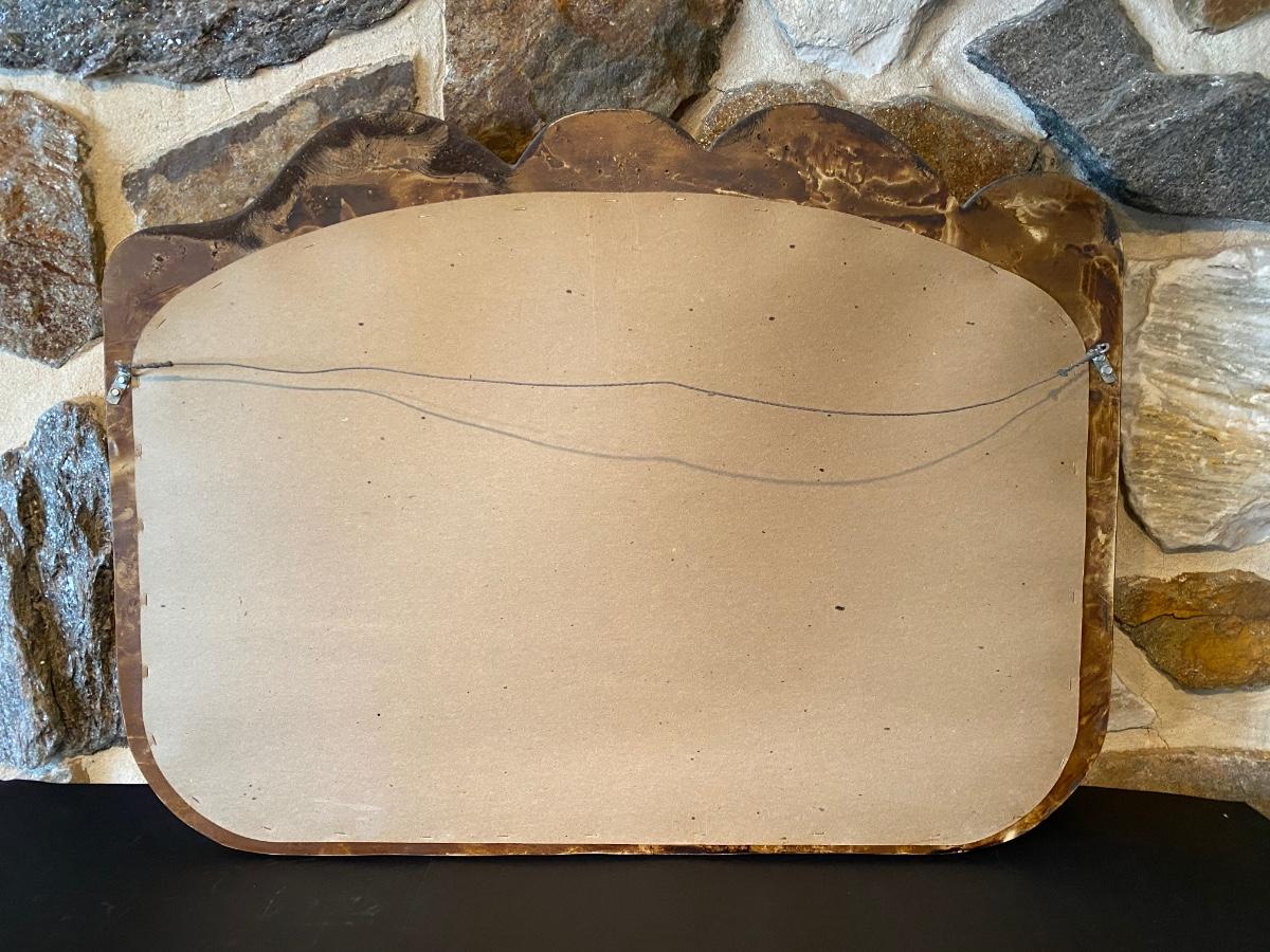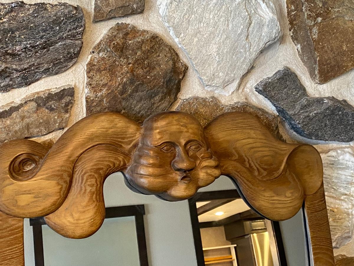 Carved composite mirror made to hang on the wall. Measures 30.5 x 23 inches.