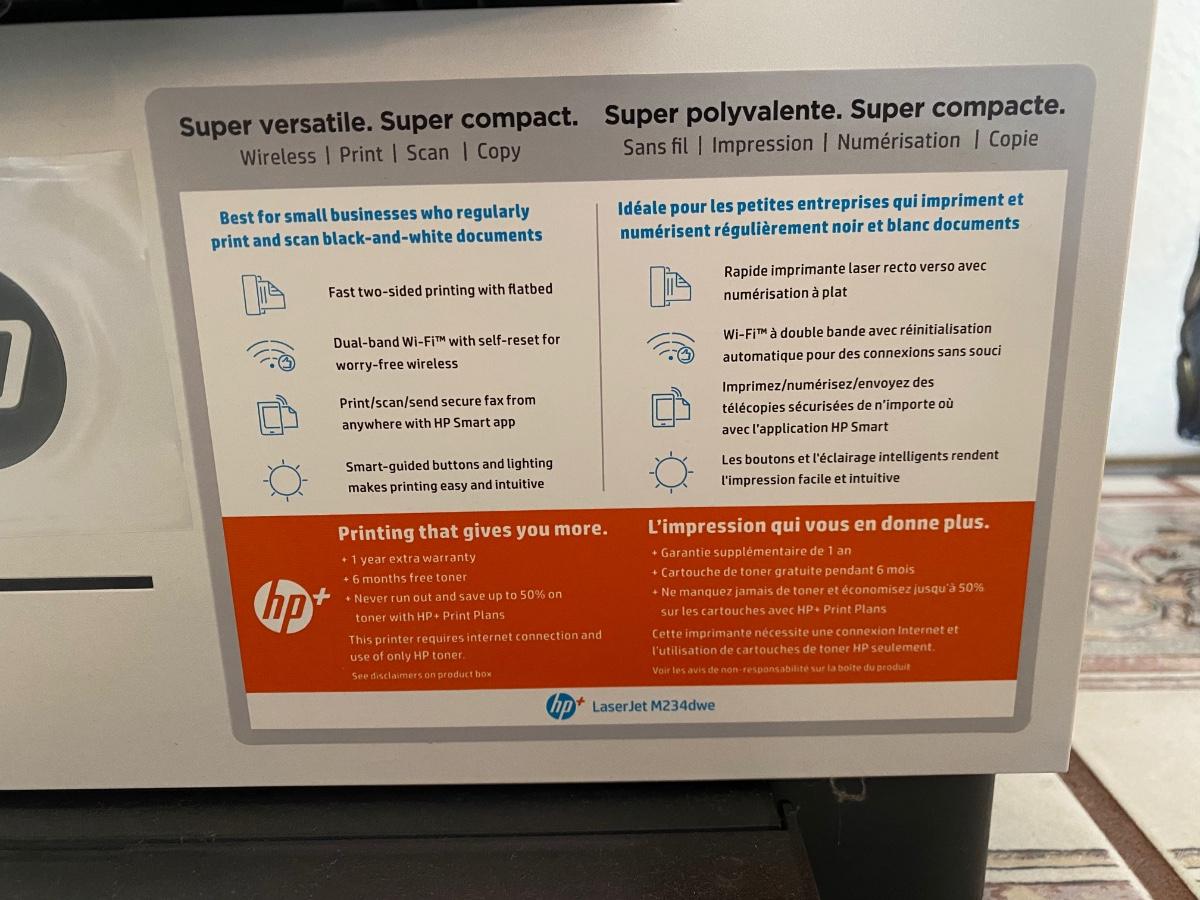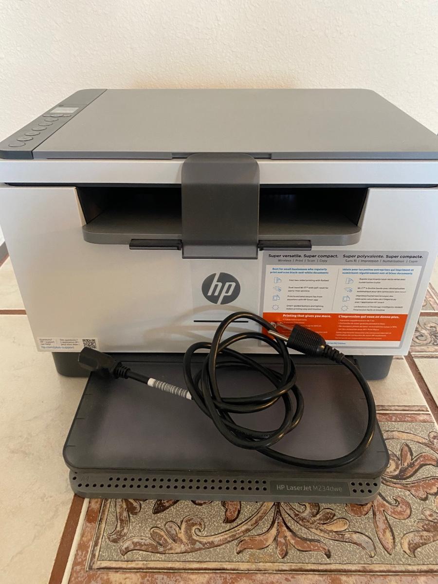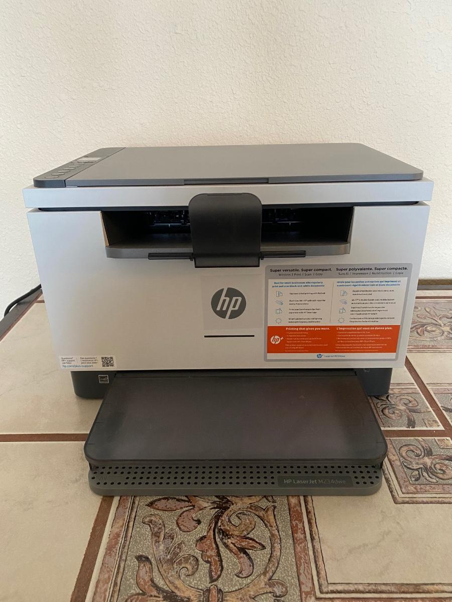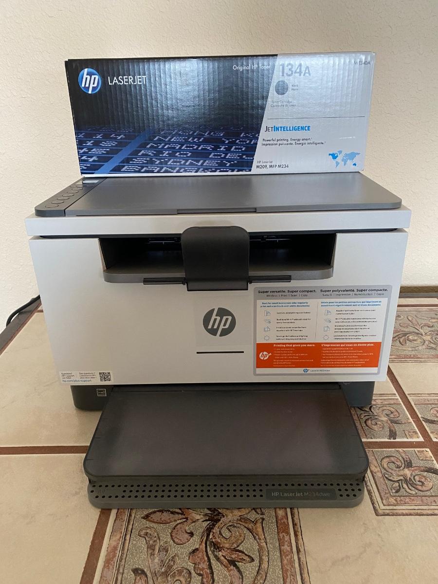 Includes one HP LaserJet M234dwe printer with its cords and one unopened HP Toner. Printer is in good condition, untested.