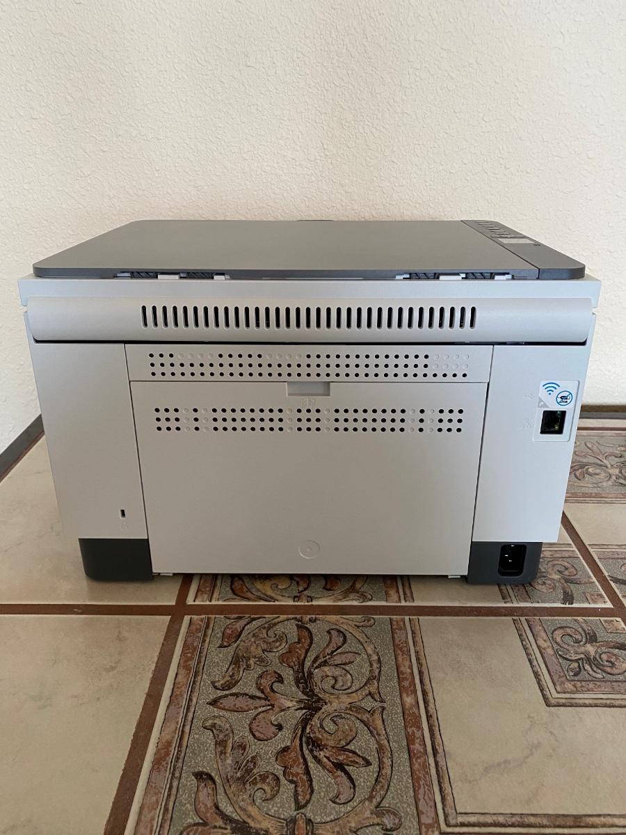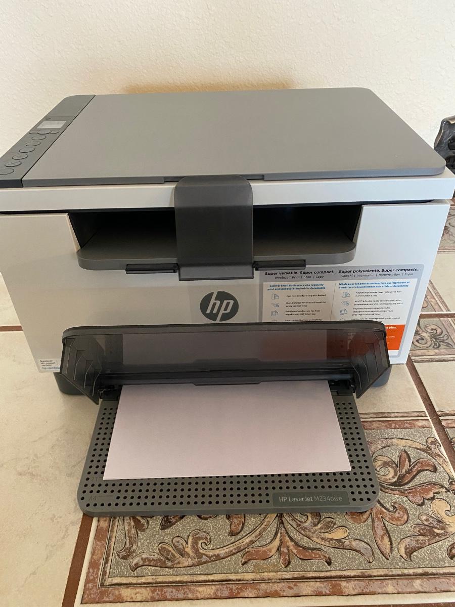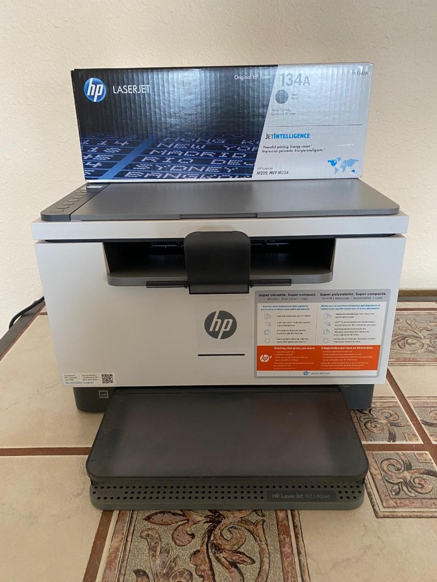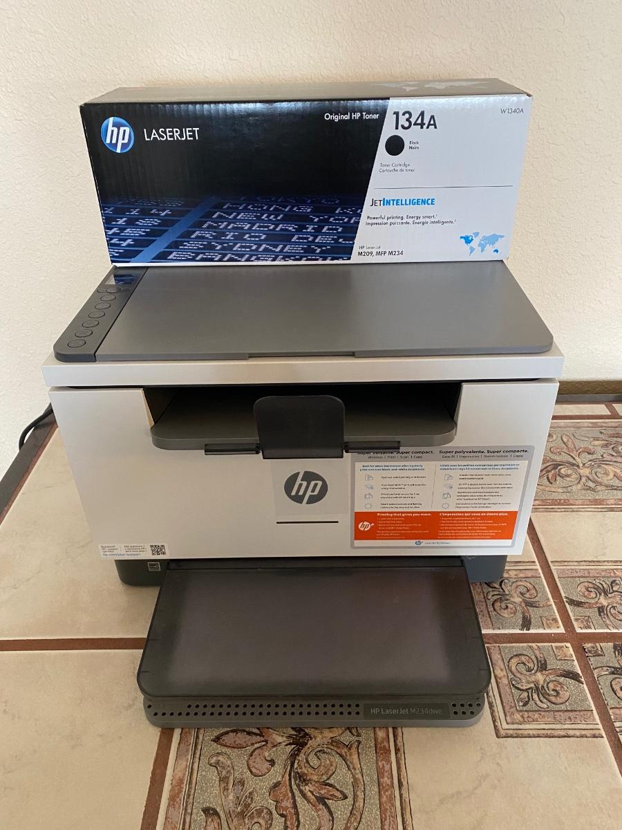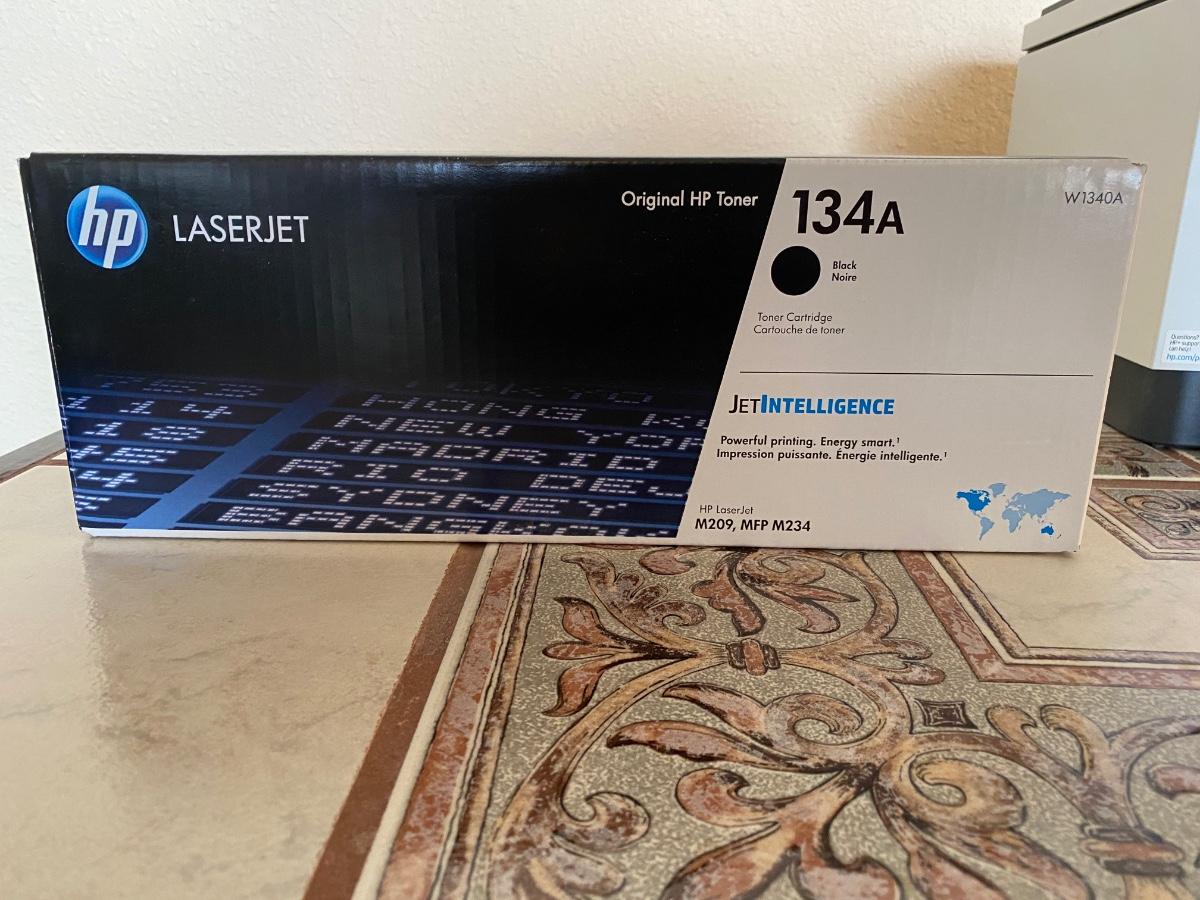 Includes one HP LaserJet M234dwe printer with its cords and one unopened HP Toner. Printer is in good condition, untested.
