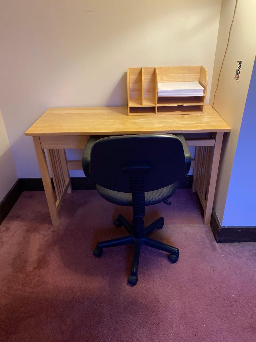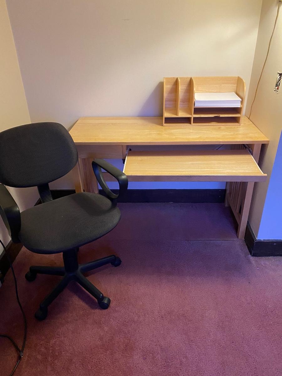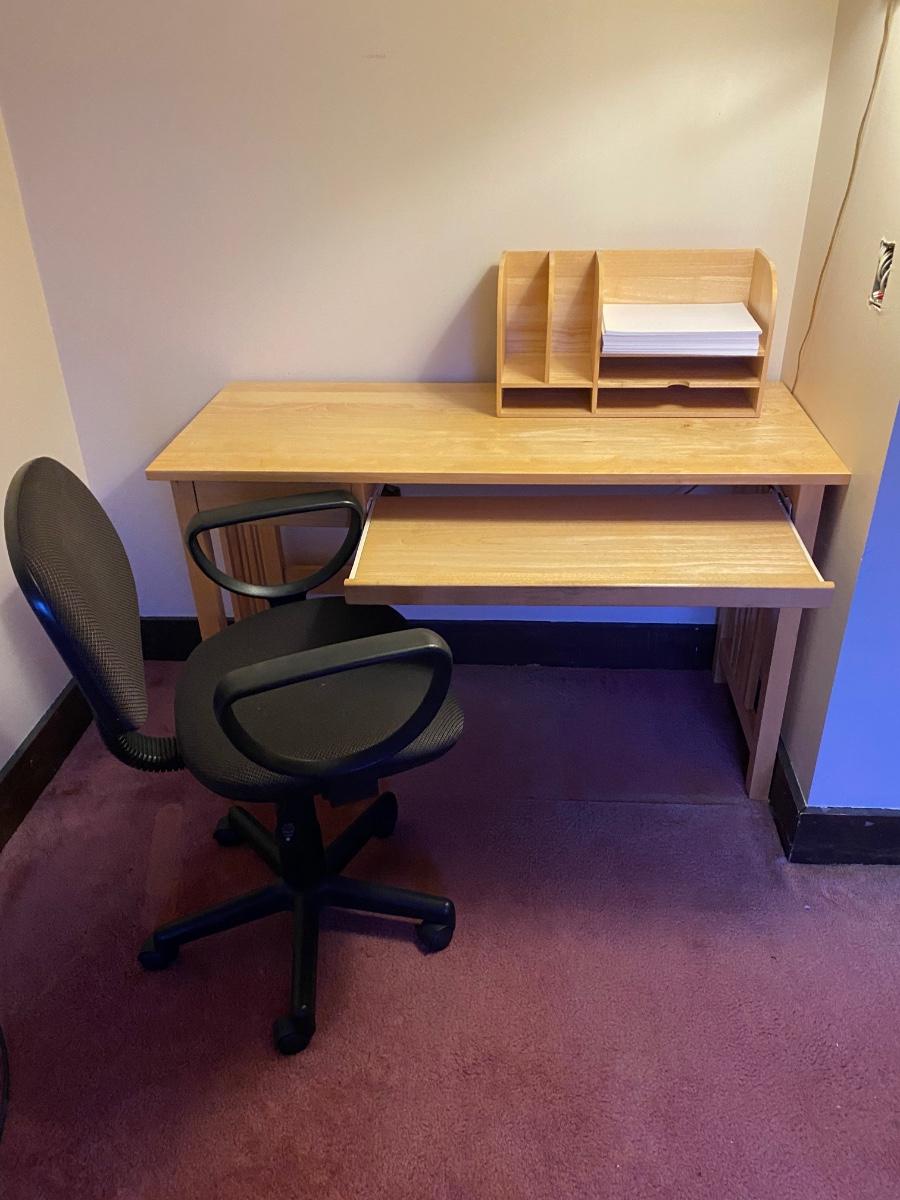 47”x20”x29” Computer desk. Lot includes computer chair and desk top organizer. Please see all pictures as they are the best representation of the items. The pictures show condition, measurements if taken, and what is included in the lot. Due to the large amount that we photograph and the time frame, we are not always able to take measurements. All items unless noted, are pre-owned and have been used. If you purchased furniture, you must bring help. We do not allow one person to carry large furniture out on their own. Bring help, tools and a truck for the safety of our client’s homes, and your personal safety. Any damages that result to the property including walls, and floors due to moving of the furniture will be charged to the buyer. Company policy. Thank you.