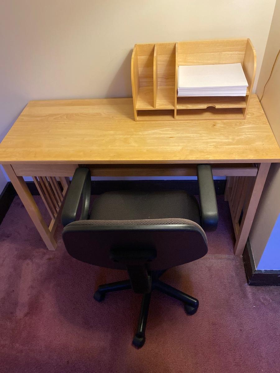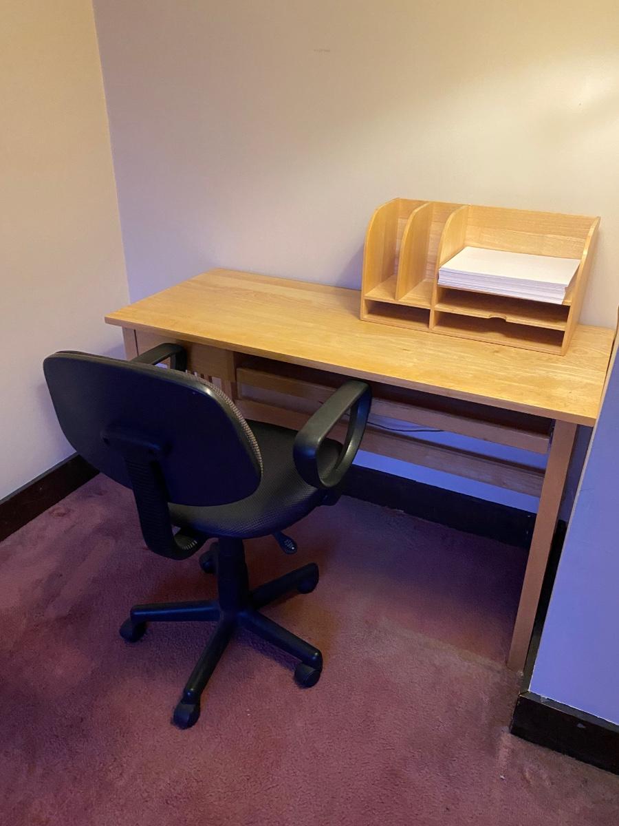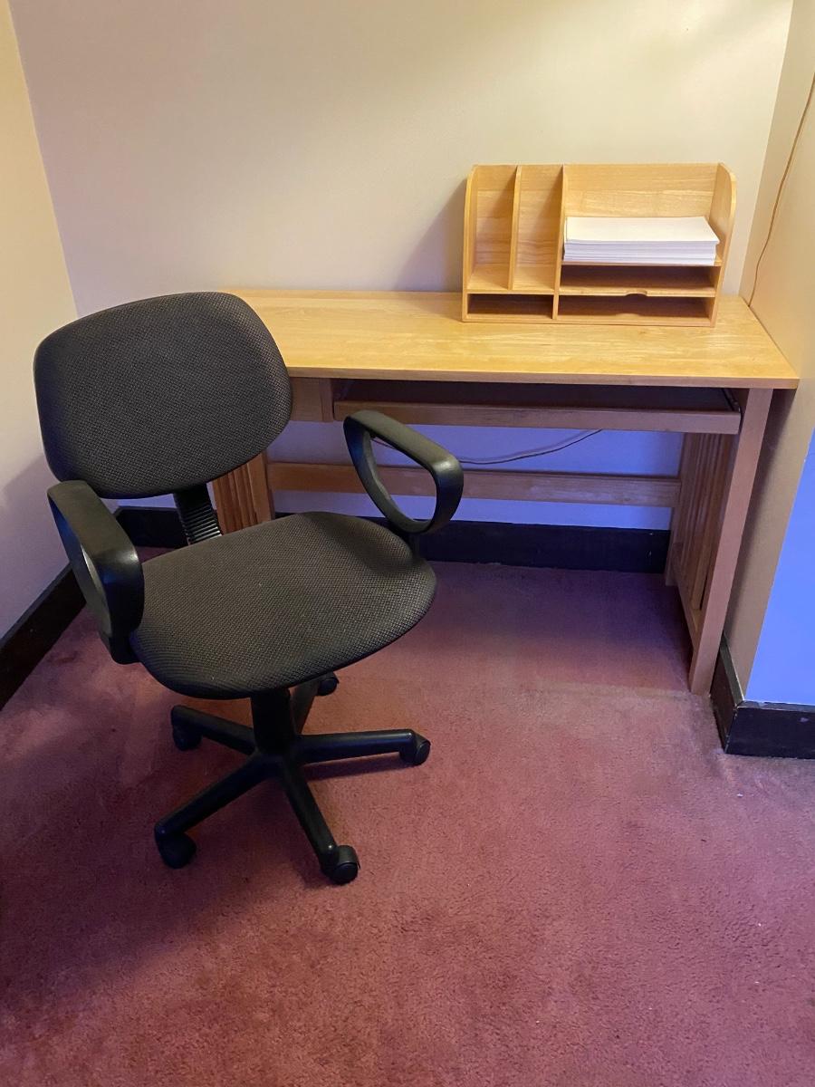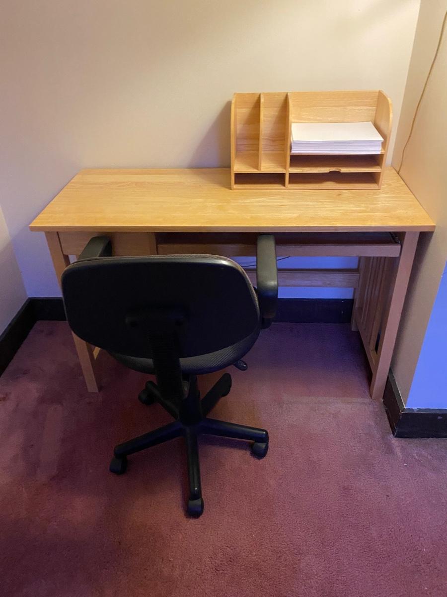 47”x20”x29” Computer desk. Lot includes computer chair and desk top organizer. Please see all pictures as they are the best representation of the items. The pictures show condition, measurements if taken, and what is included in the lot. Due to the large amount that we photograph and the time frame, we are not always able to take measurements. All items unless noted, are pre-owned and have been used. If you purchased furniture, you must bring help. We do not allow one person to carry large furniture out on their own. Bring help, tools and a truck for the safety of our client’s homes, and your personal safety. Any damages that result to the property including walls, and floors due to moving of the furniture will be charged to the buyer. Company policy. Thank you.
