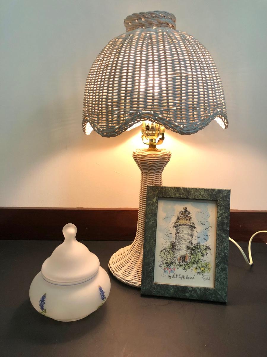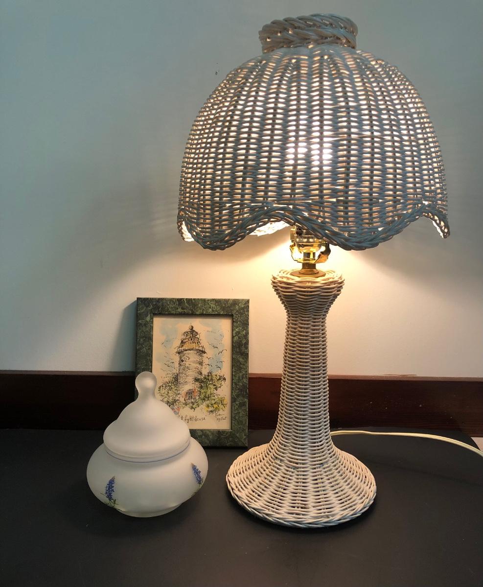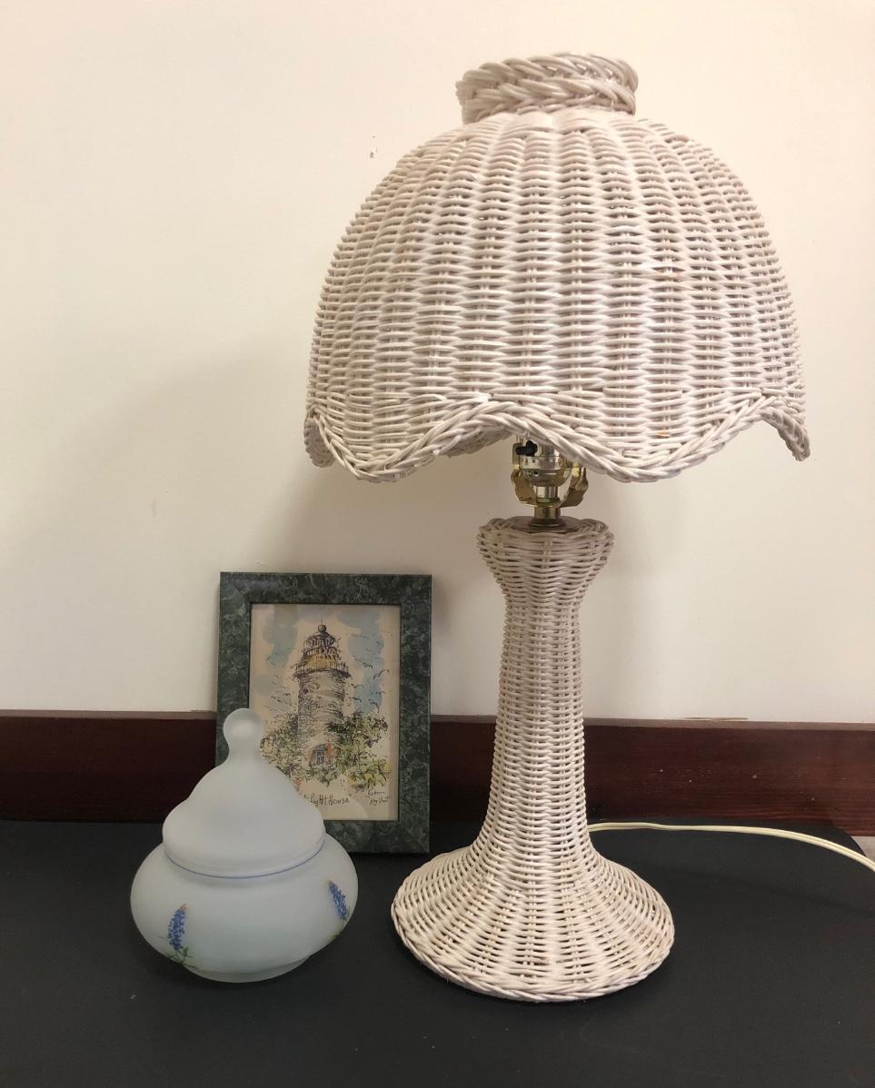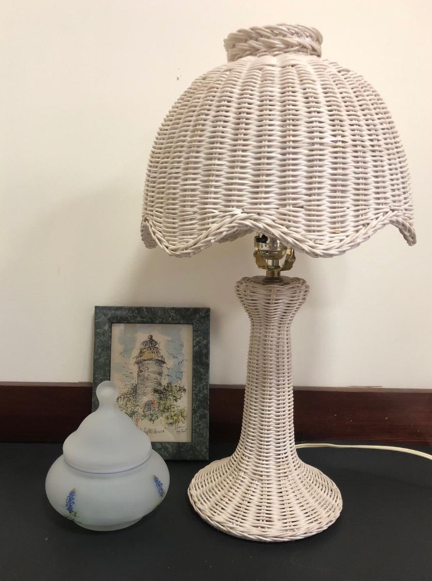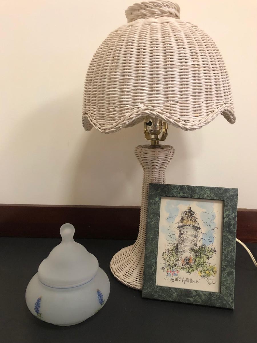 One wicker lamp in working condition. Includes a small cloudy glass dish with blue hydrangeas on it and a framed lighthouse print.