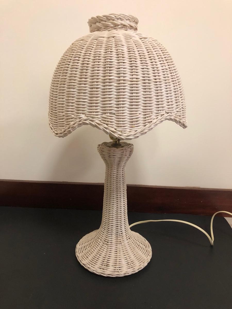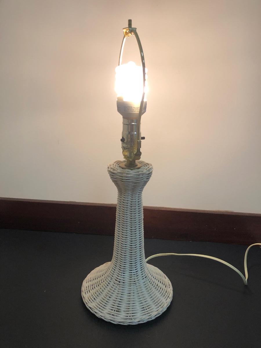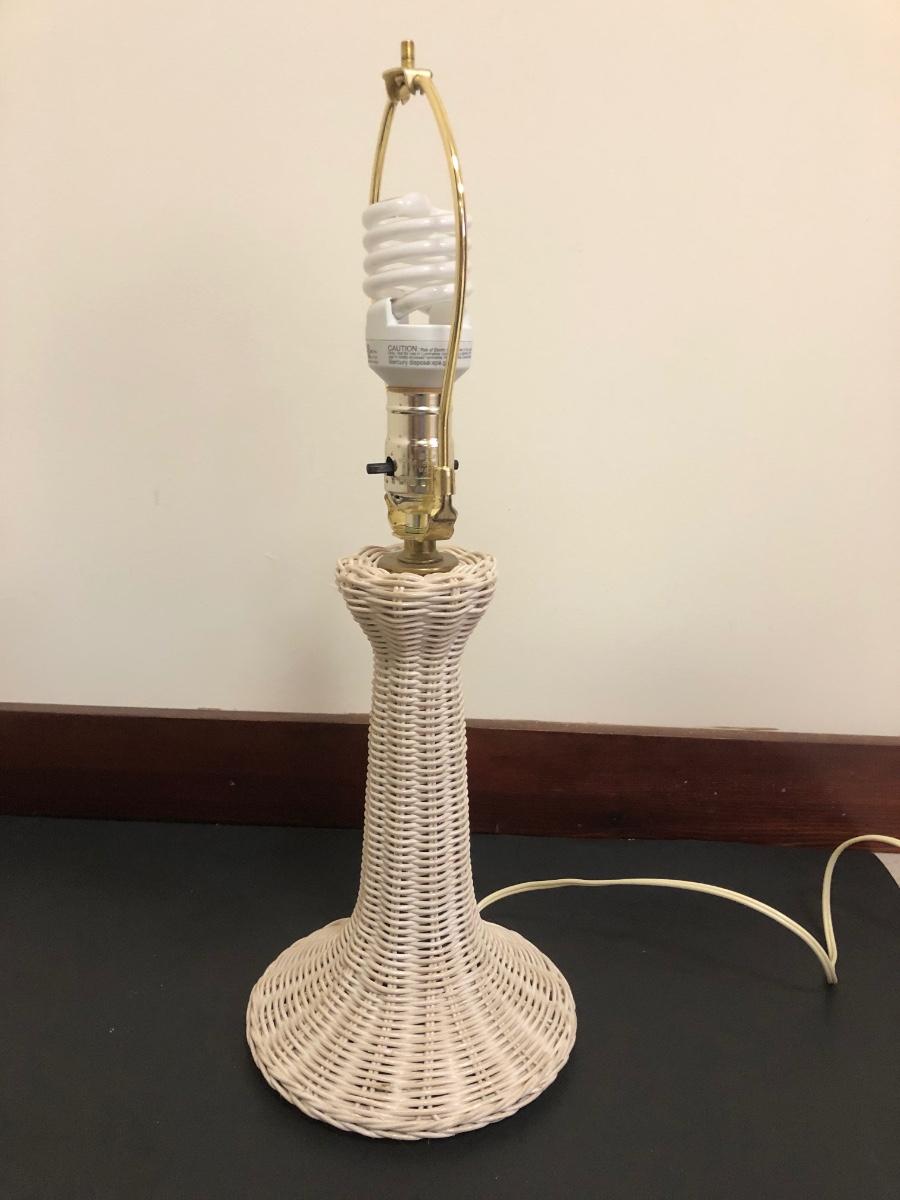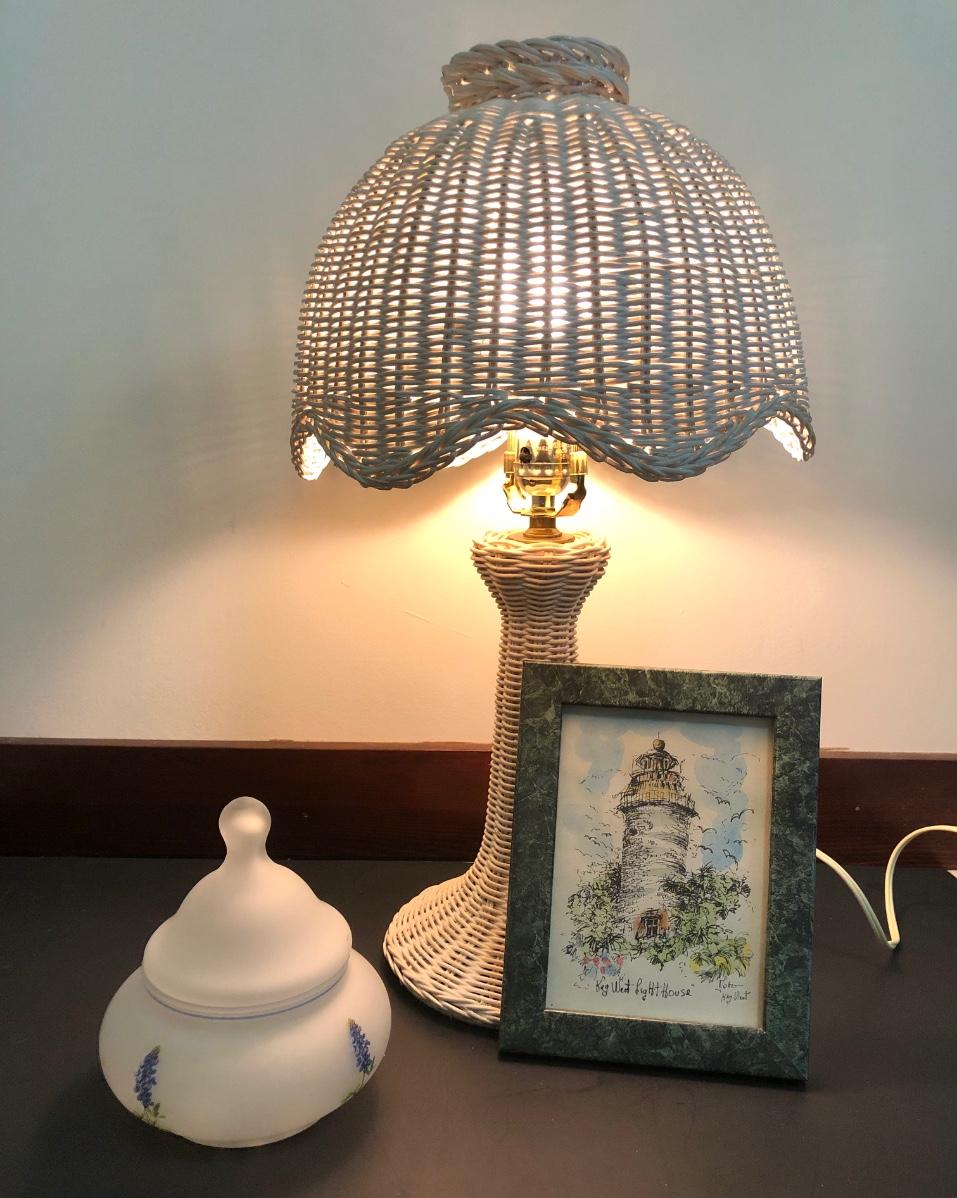 One wicker lamp in working condition. Includes a small cloudy glass dish with blue hydrangeas on it and a framed lighthouse print.