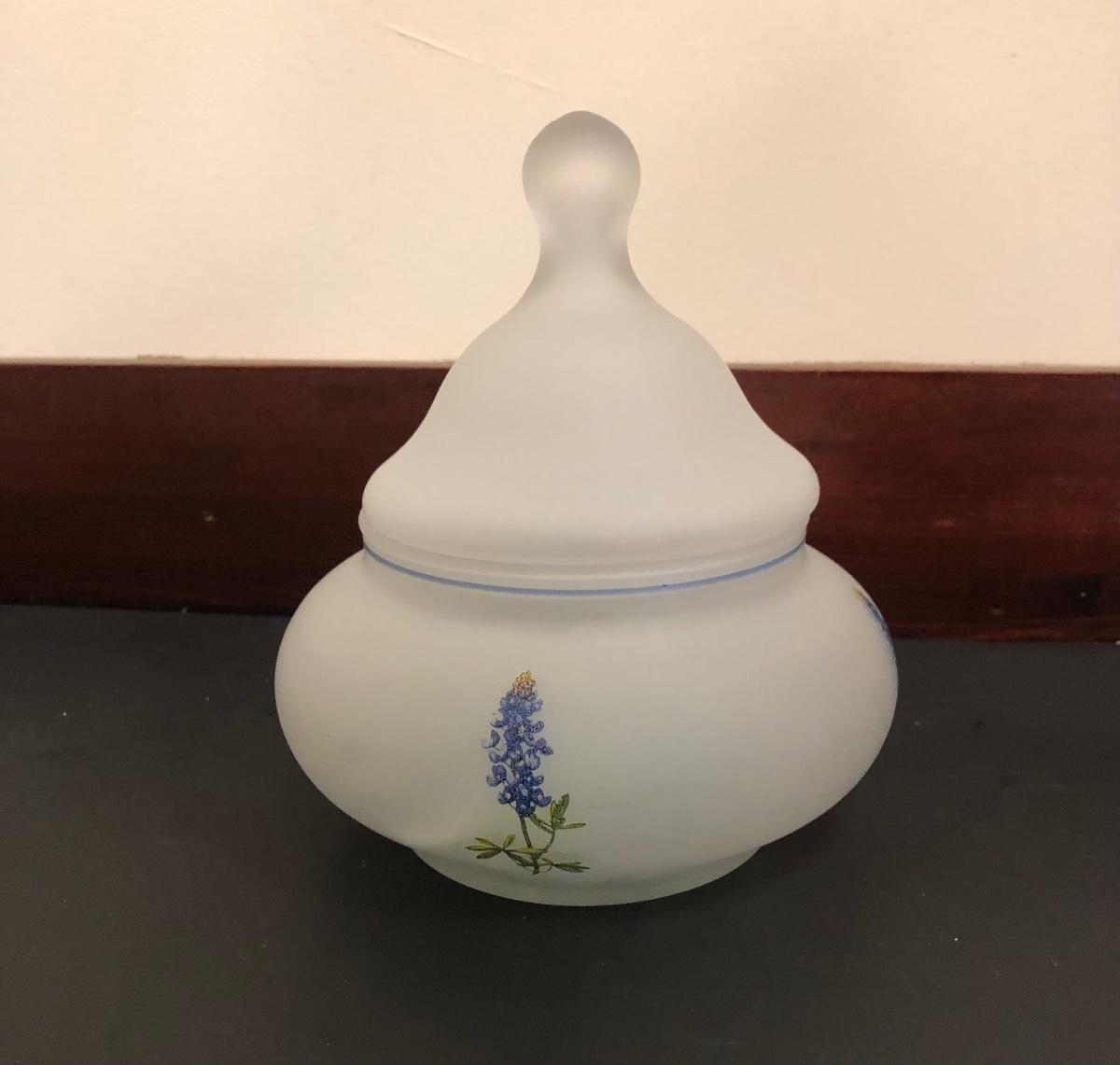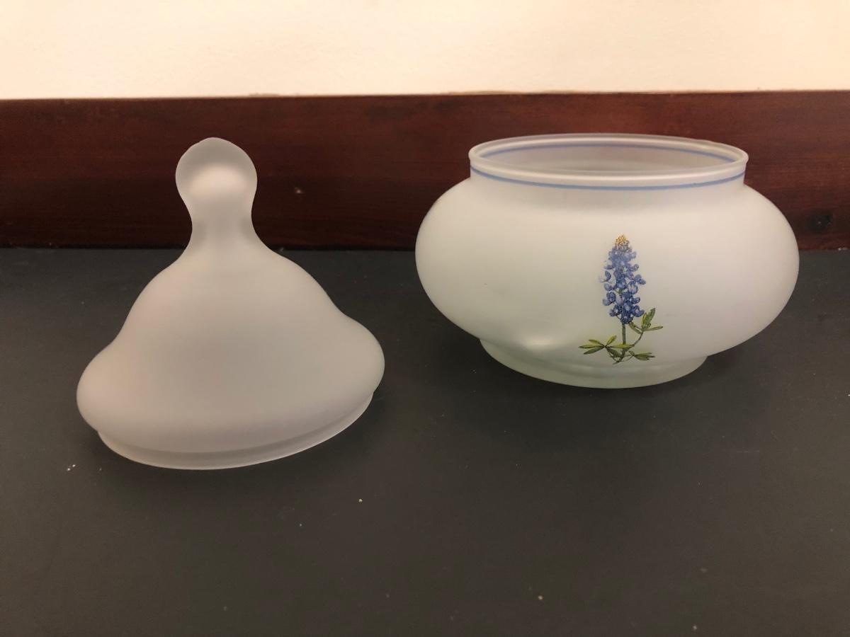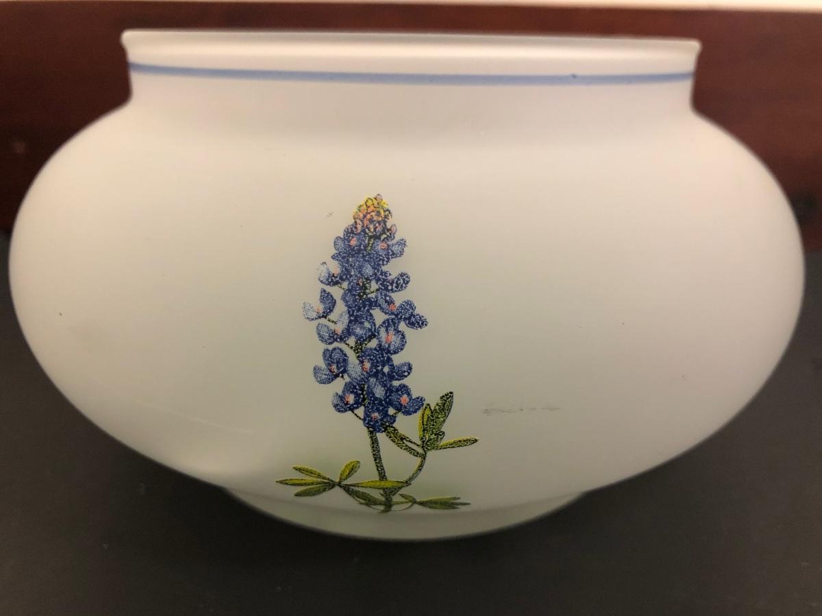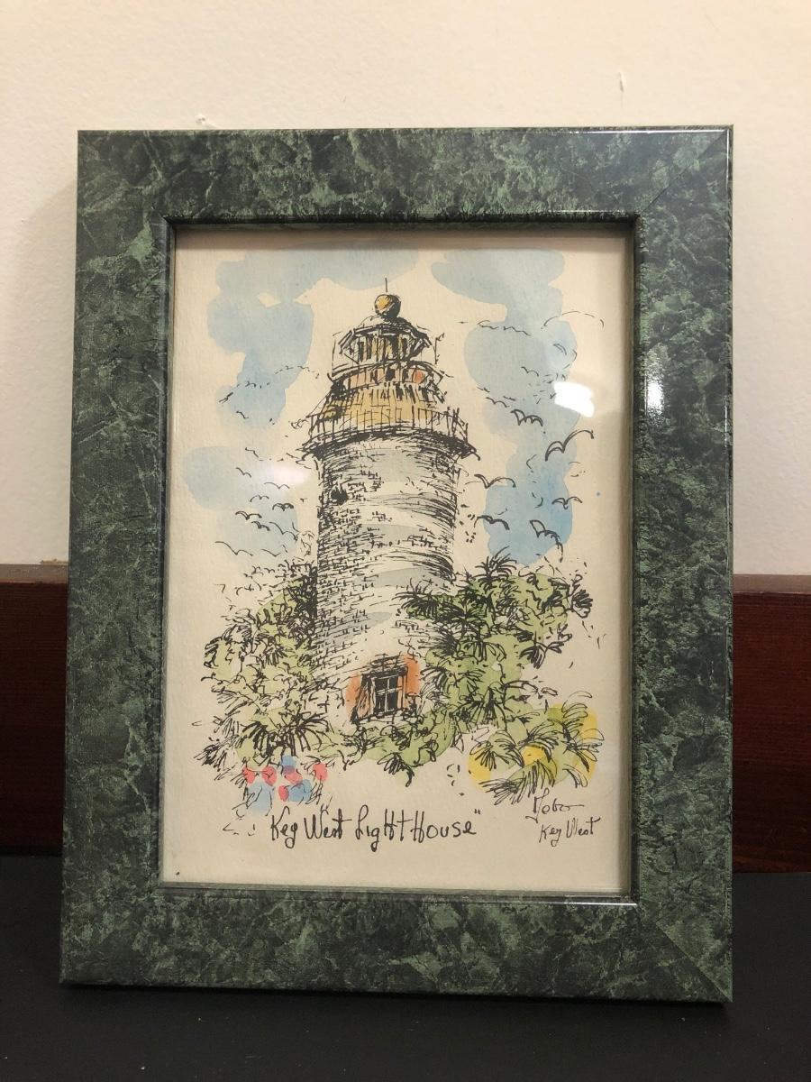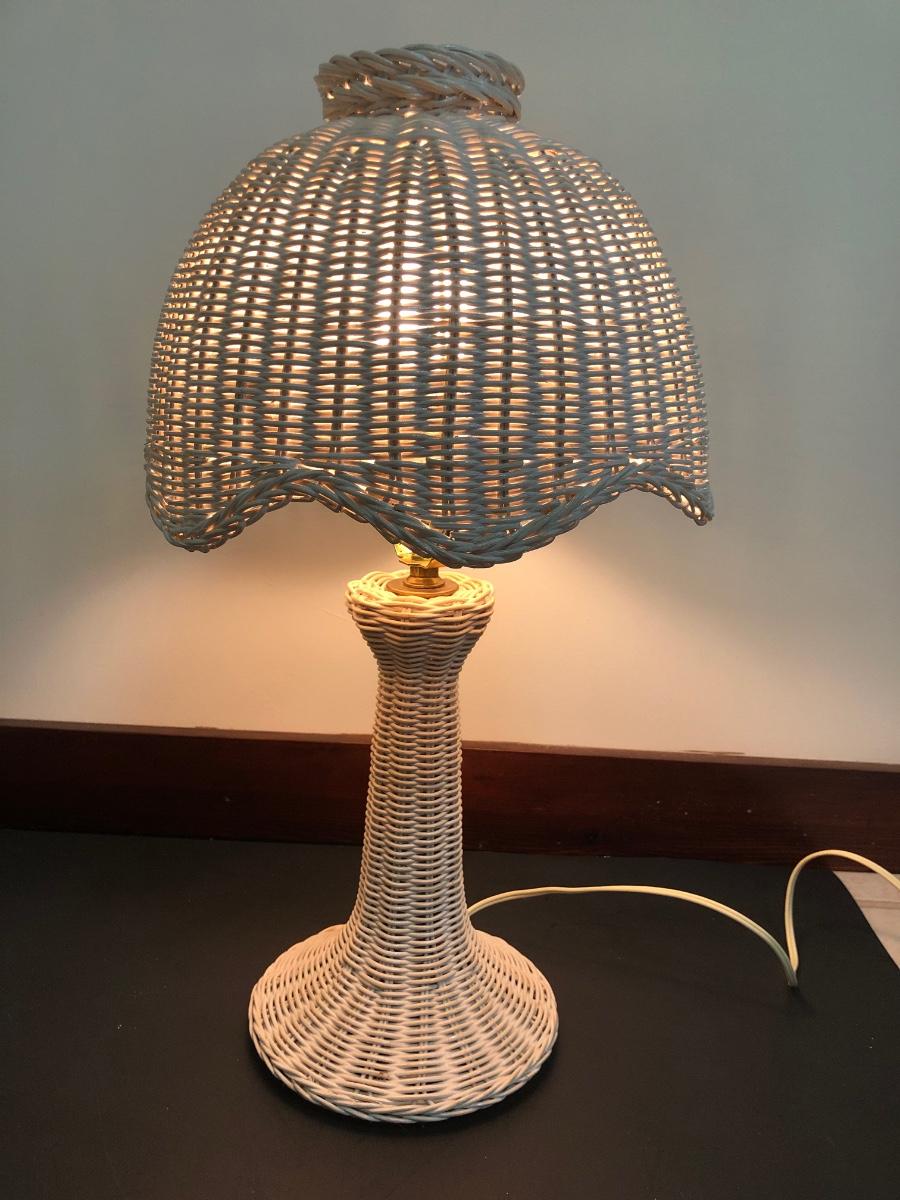 One wicker lamp in working condition. Includes a small cloudy glass dish with blue hydrangeas on it and a framed lighthouse print.