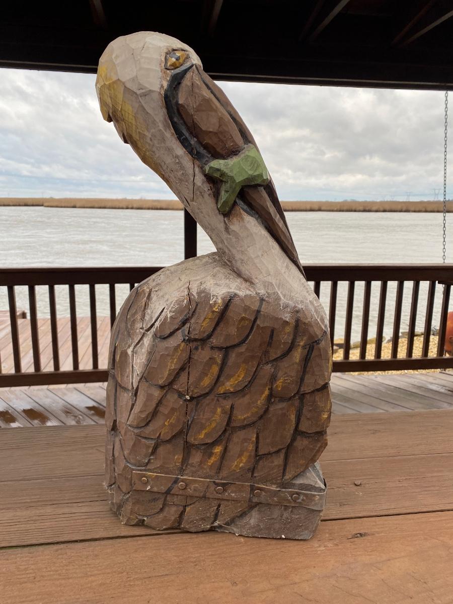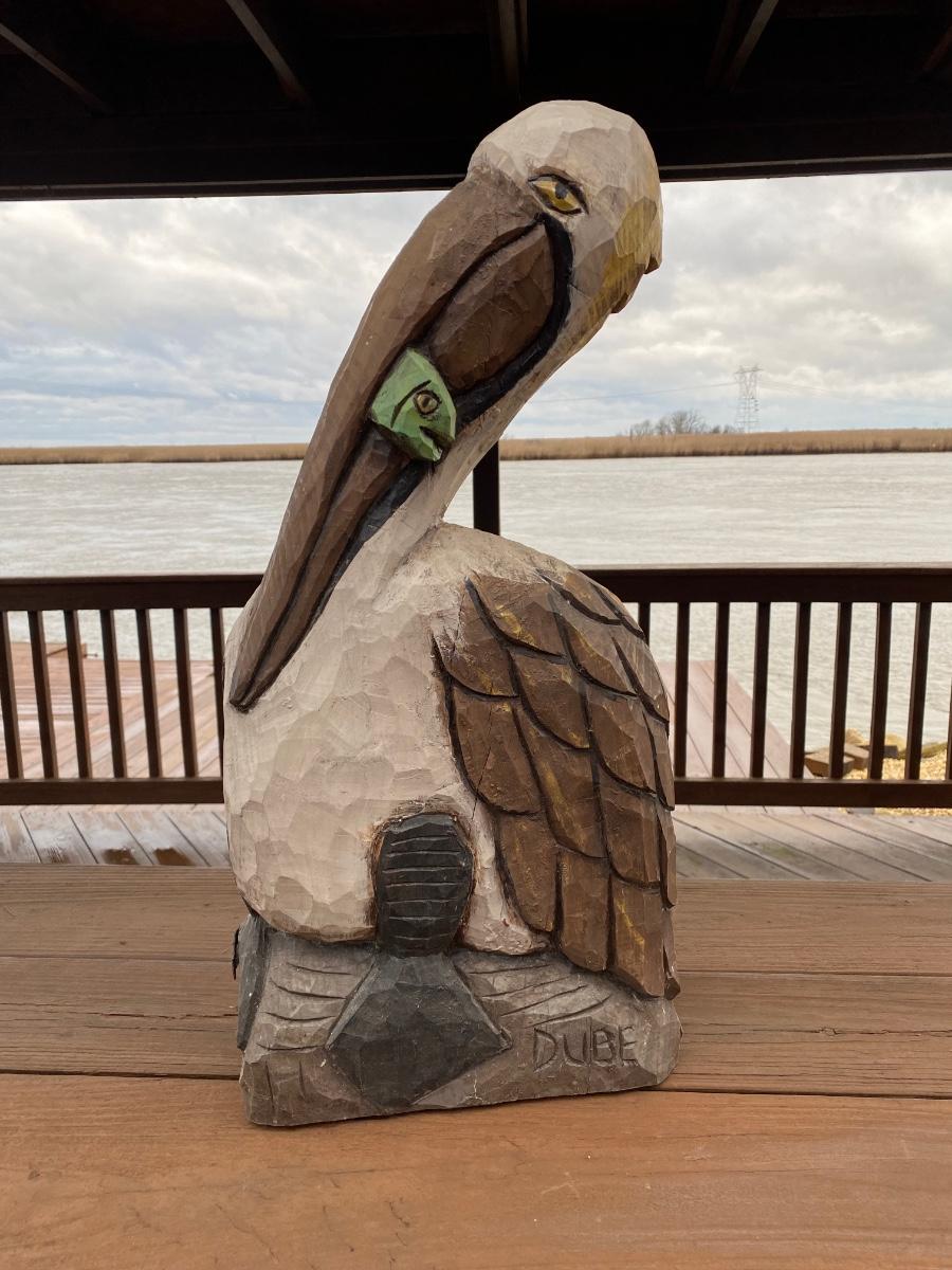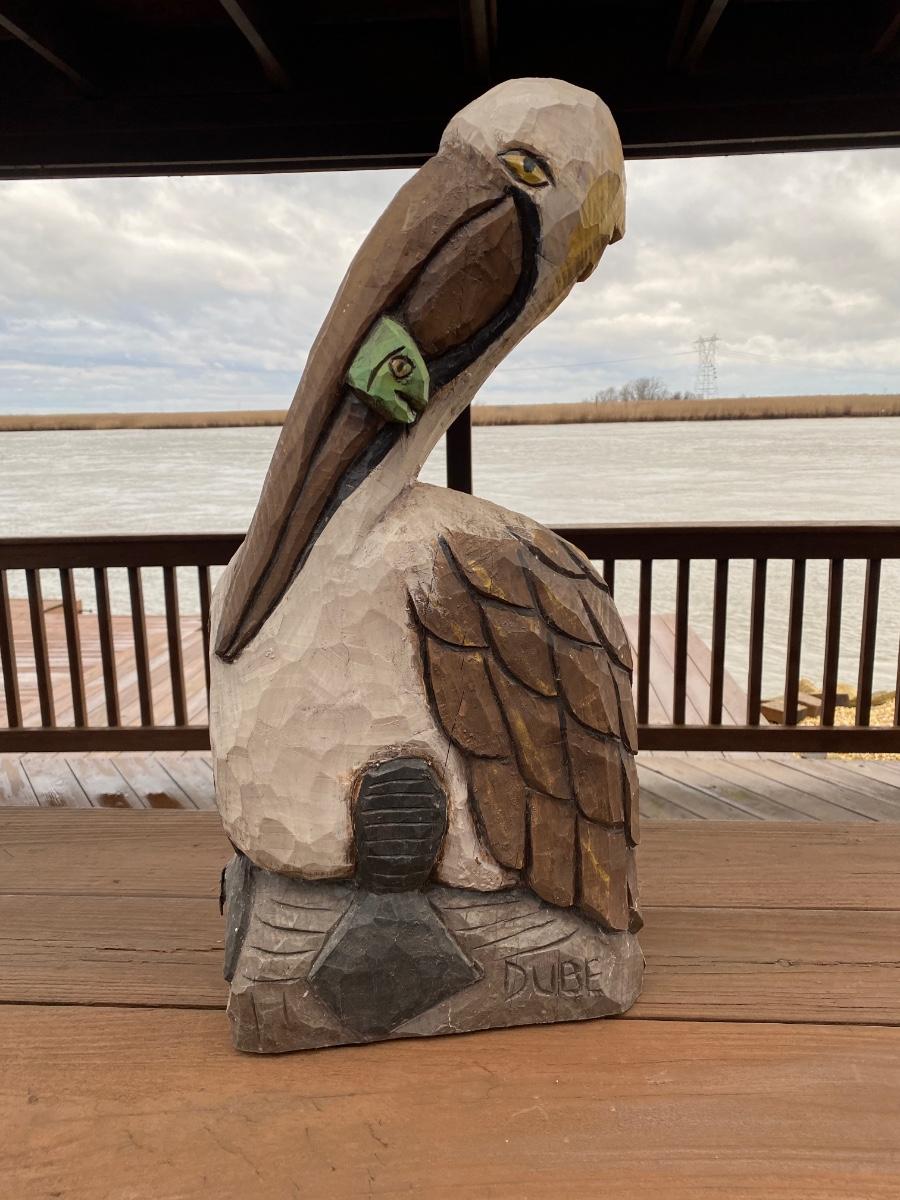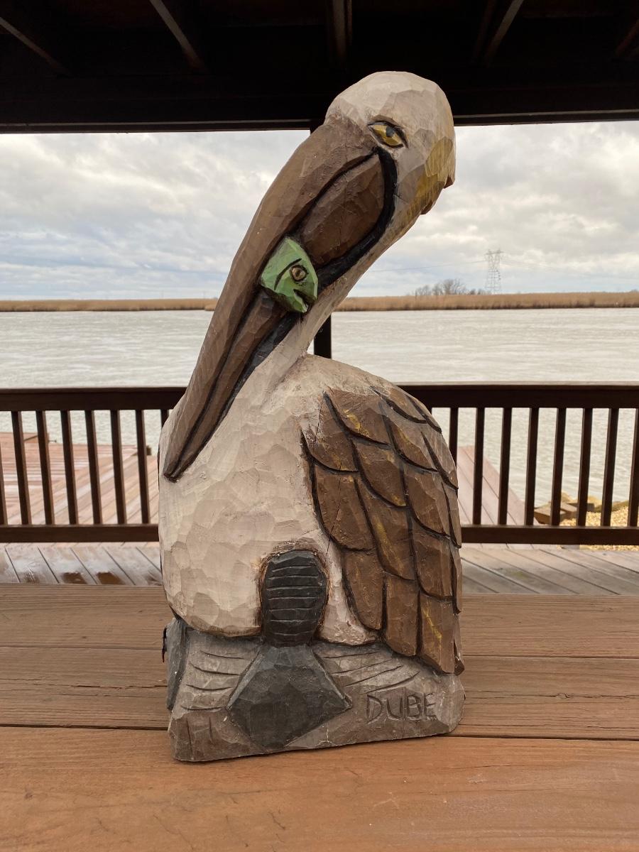 One carved wooden statue of a pelican with a fish in it's mouth. Signed "Dube." Measures about 24" tall.