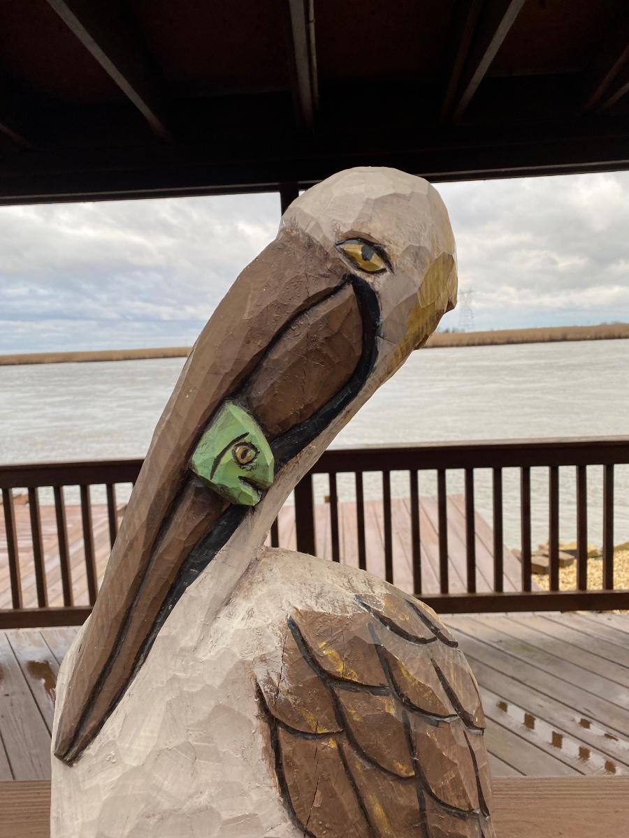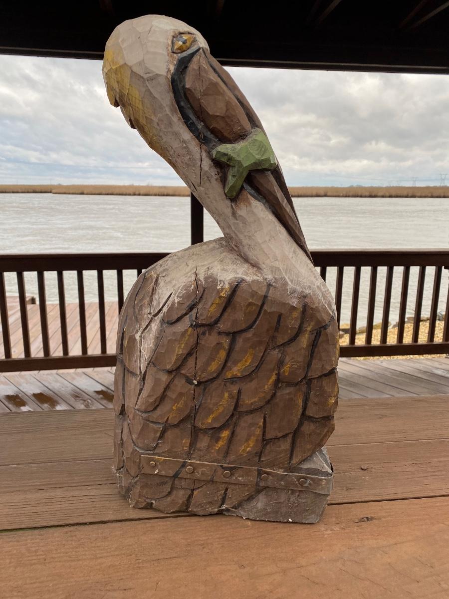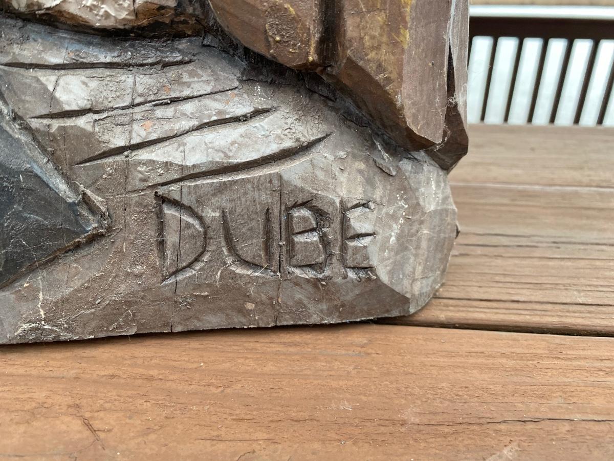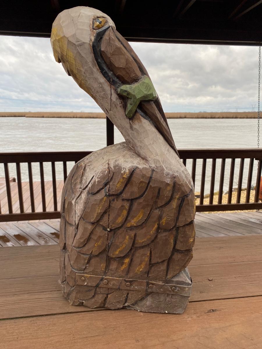 One carved wooden statue of a pelican with a fish in it's mouth. Signed "Dube." Measures about 24" tall.