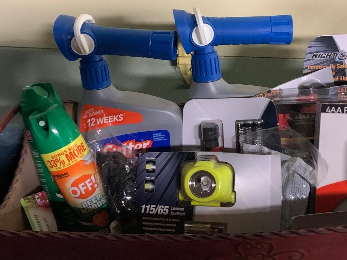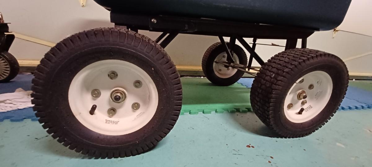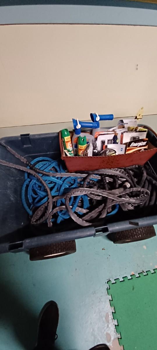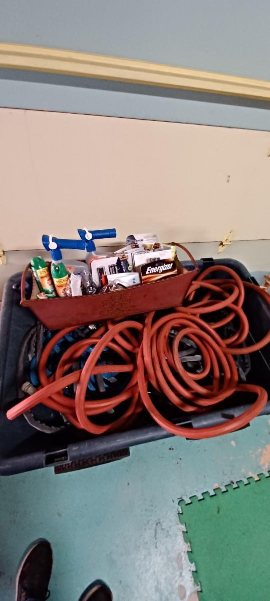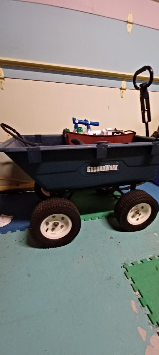 Good condition wagon. Multiple garden hoses. Tin of various outdoor and misc items.