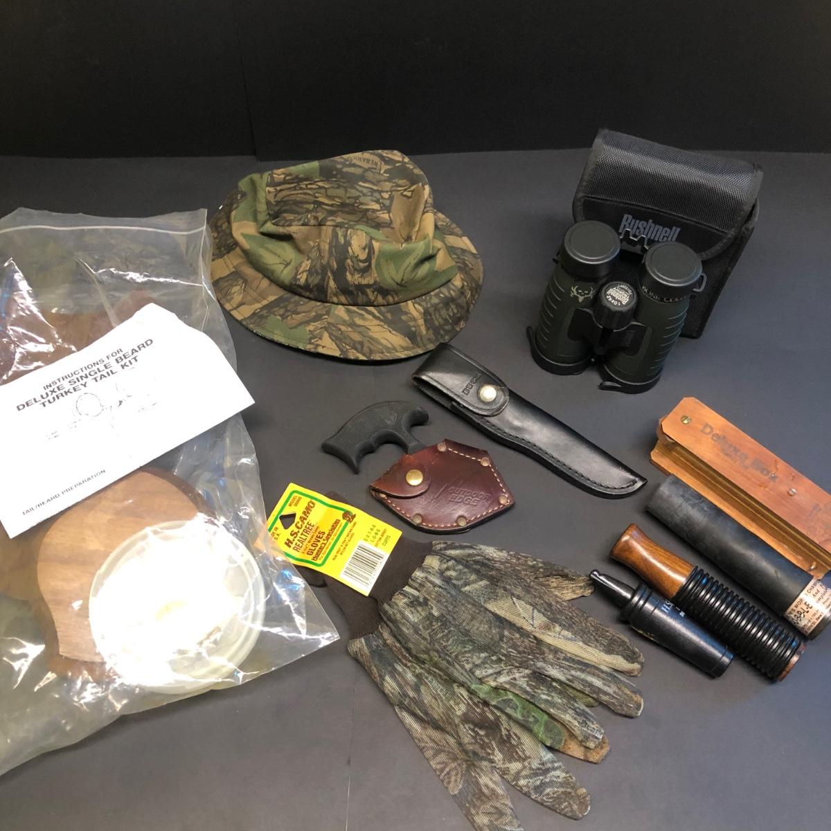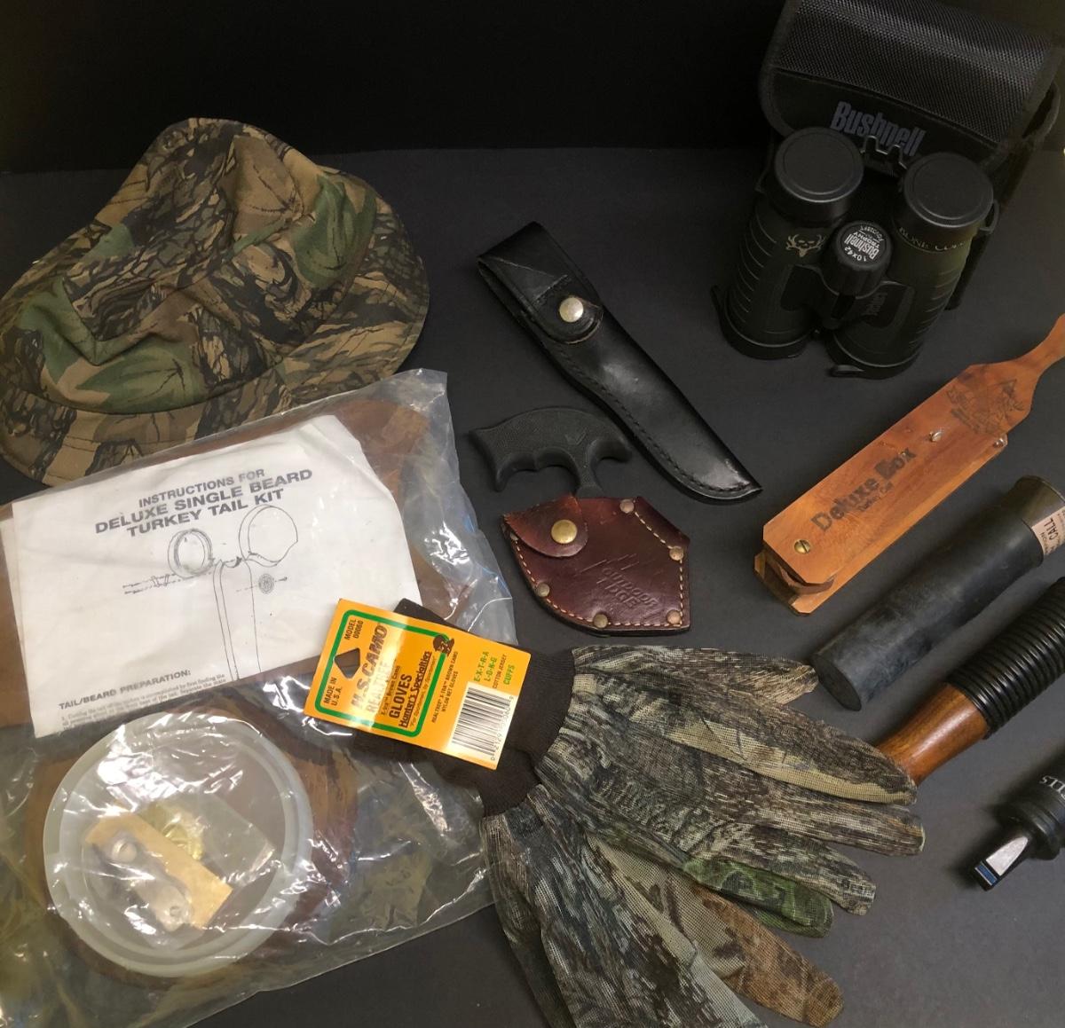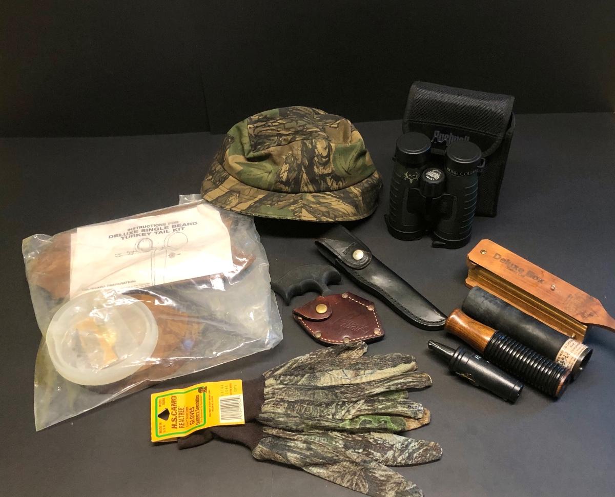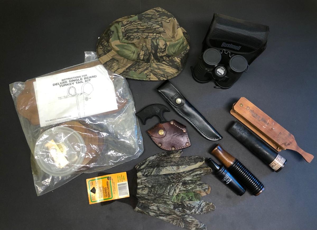 This collection of hunting accessories includes a Game Skinner knife by Outdoor Edge, a Buck 102 Woodsman Knife, a pair of Bushnell binoculars that say "Bone Collector" on them, camo hat and gloves, animal calls, and a turkey tail kit.