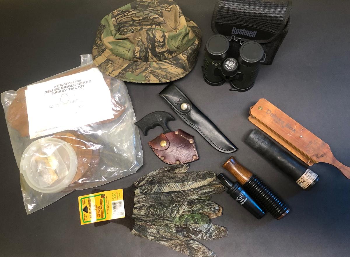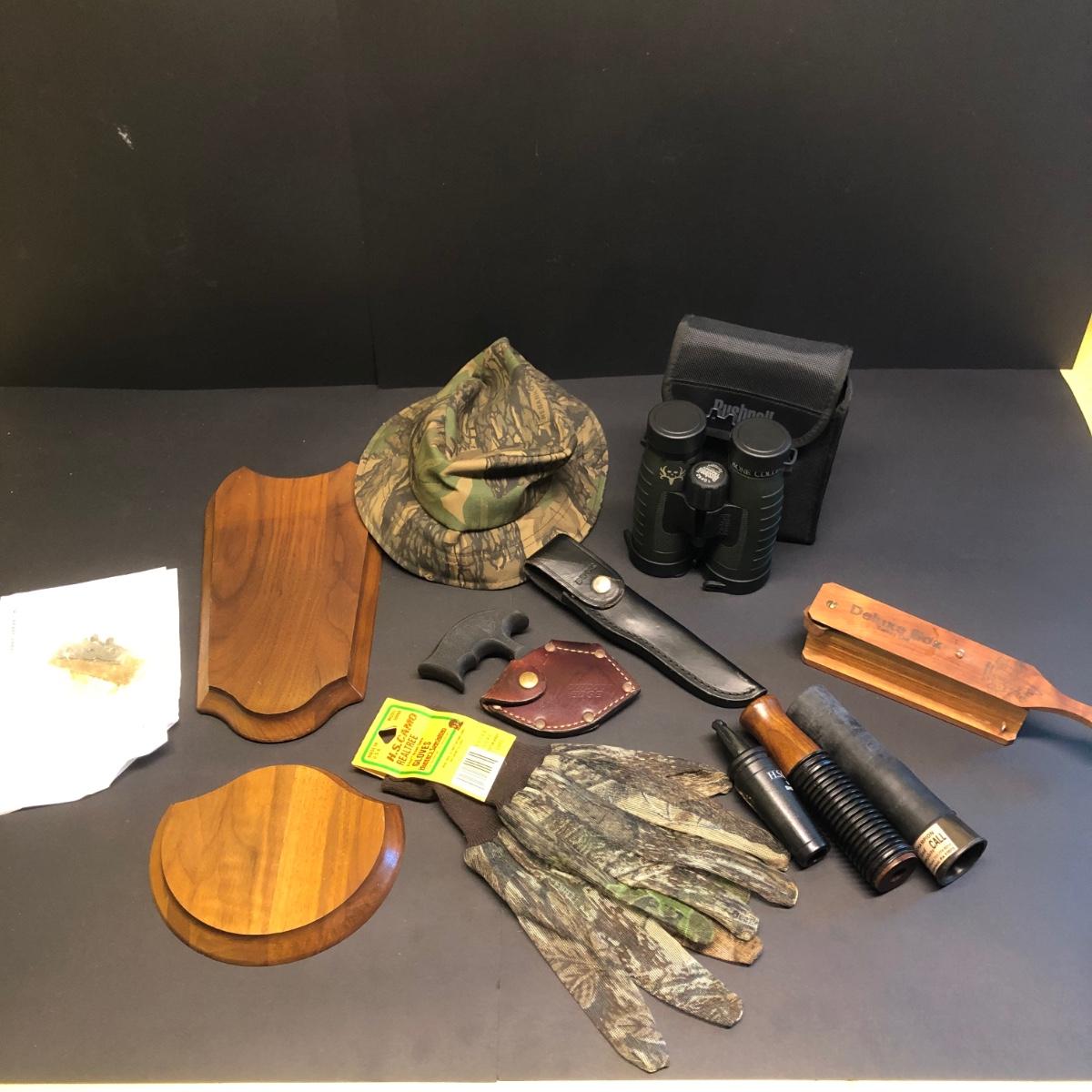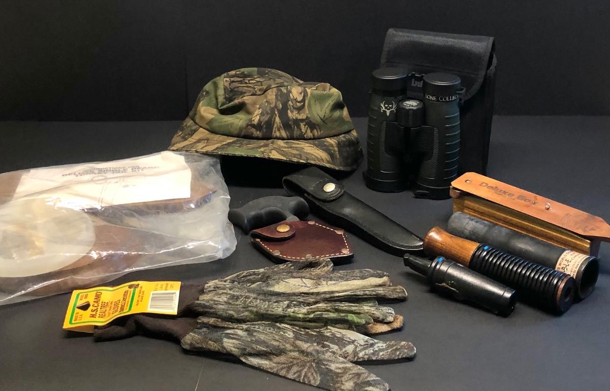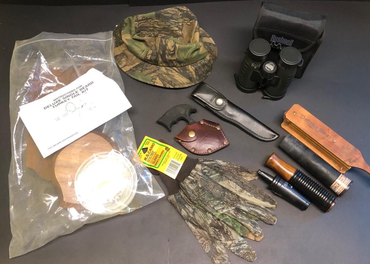 This collection of hunting accessories includes a Game Skinner knife by Outdoor Edge, a Buck 102 Woodsman Knife, a pair of Bushnell binoculars that say "Bone Collector" on them, camo hat and gloves, animal calls, and a turkey tail kit.