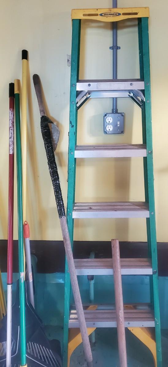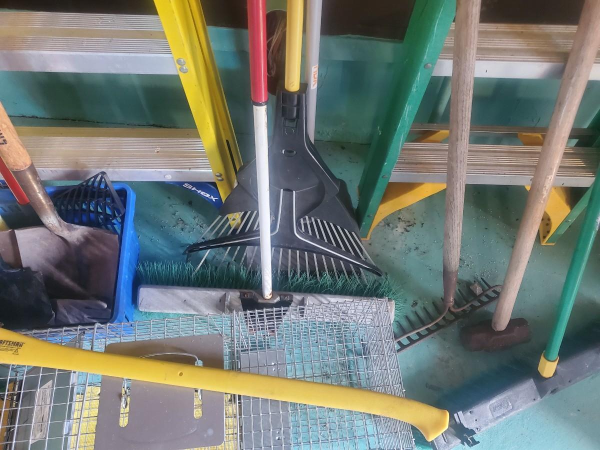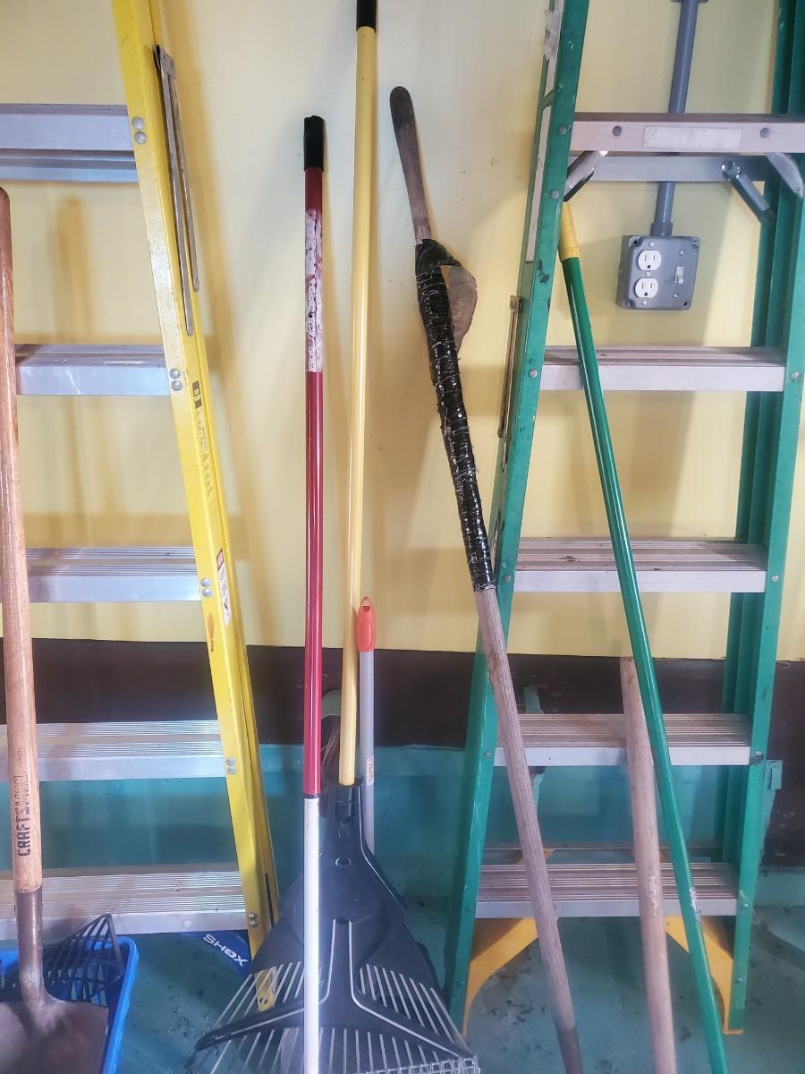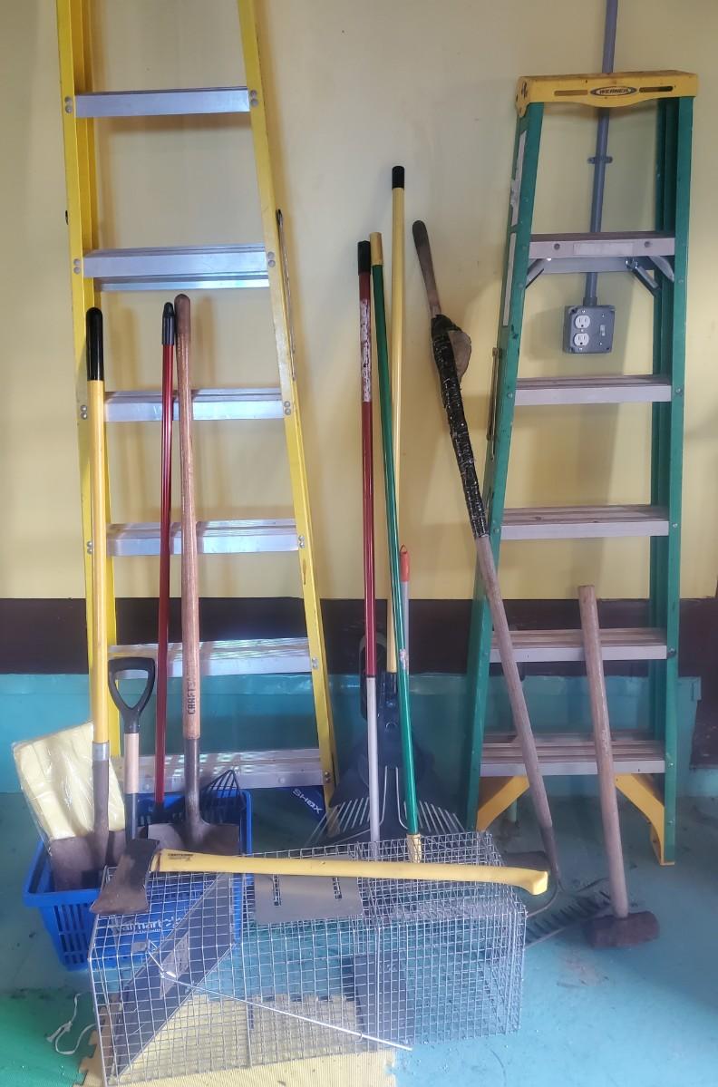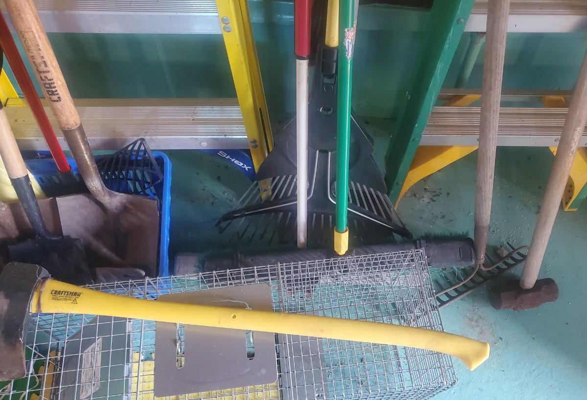 Ladders, garden tools, push brooms, and a animal trap. Axe, sledge hammer, and shovels.