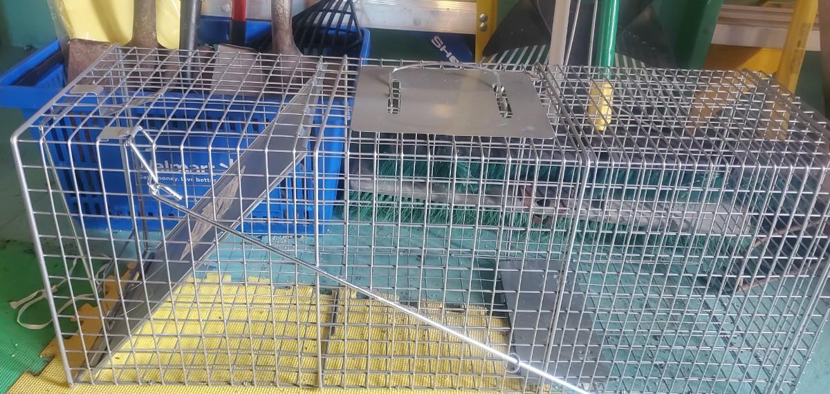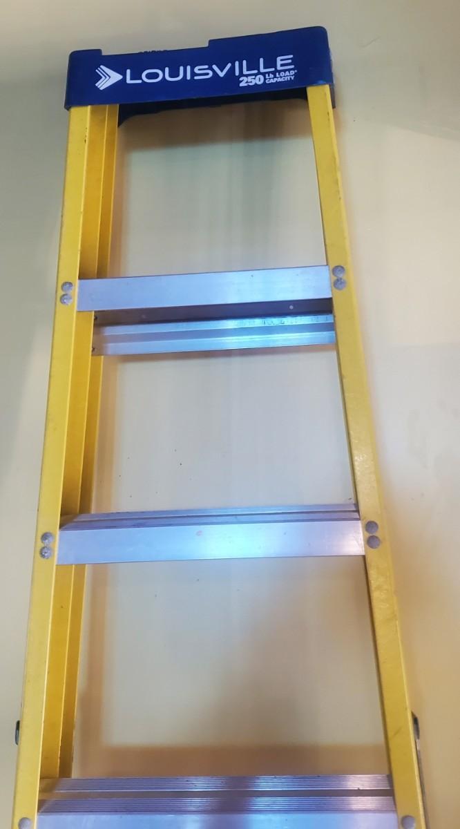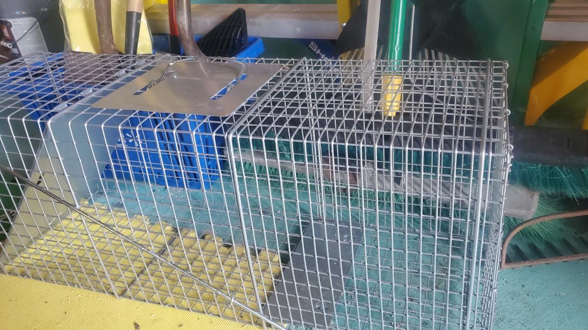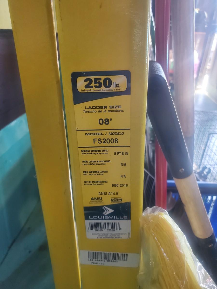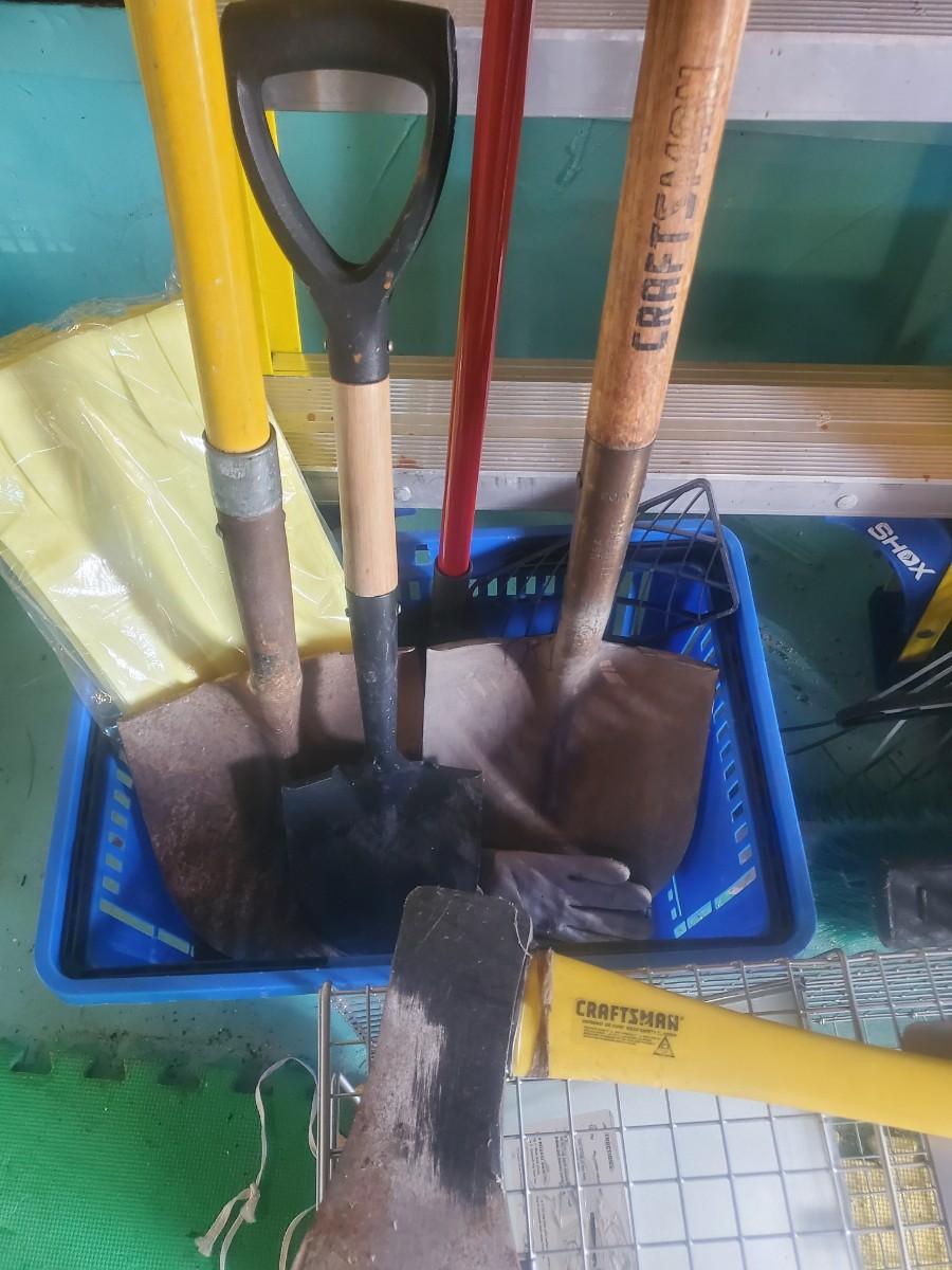 Ladders, garden tools, push brooms, and a animal trap. Axe, sledge hammer, and shovels.
