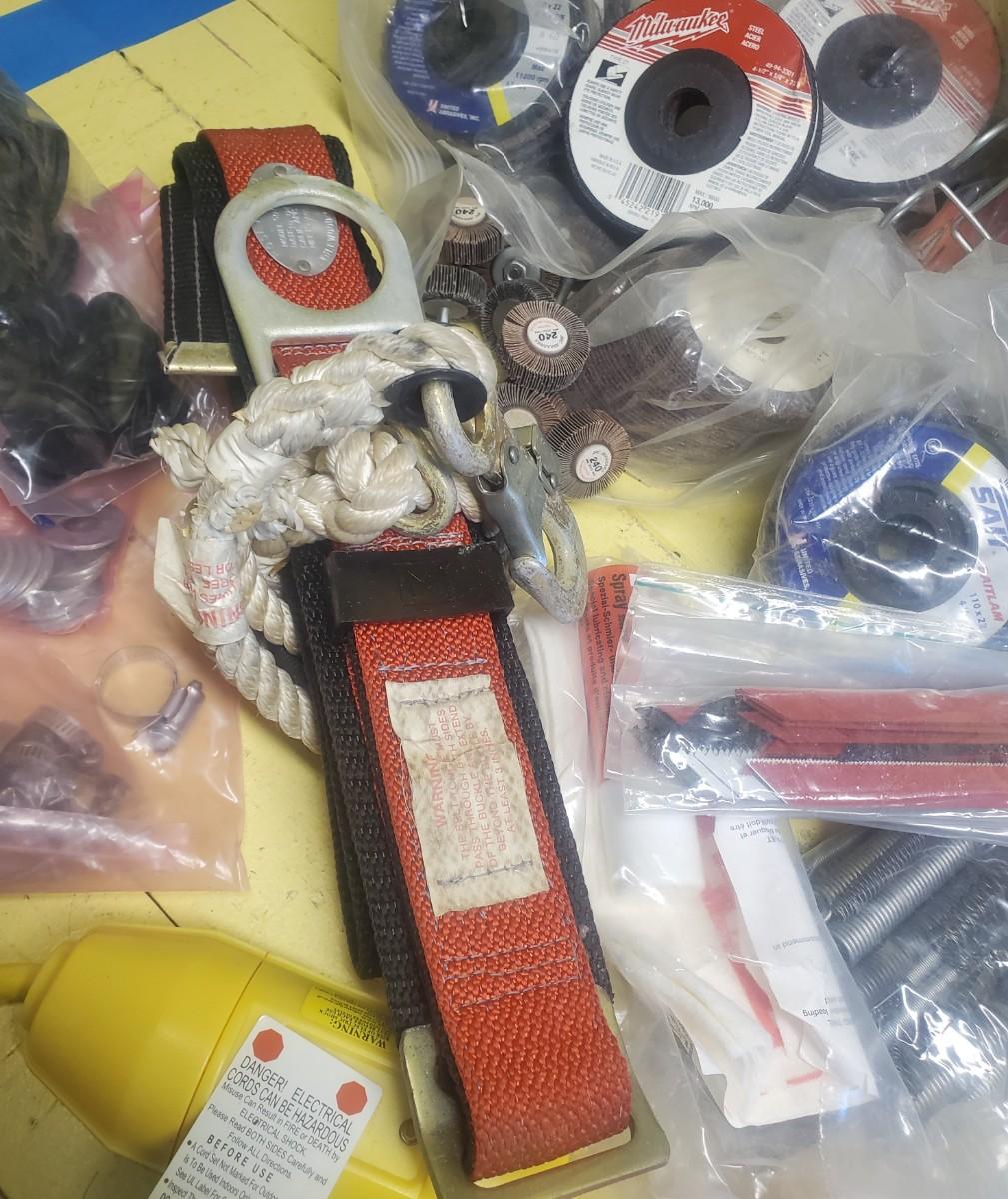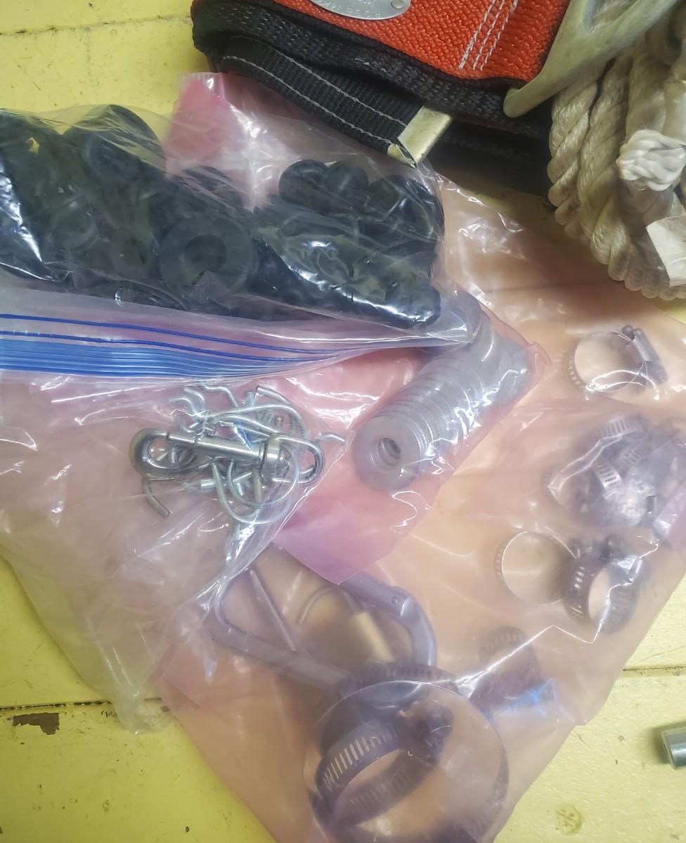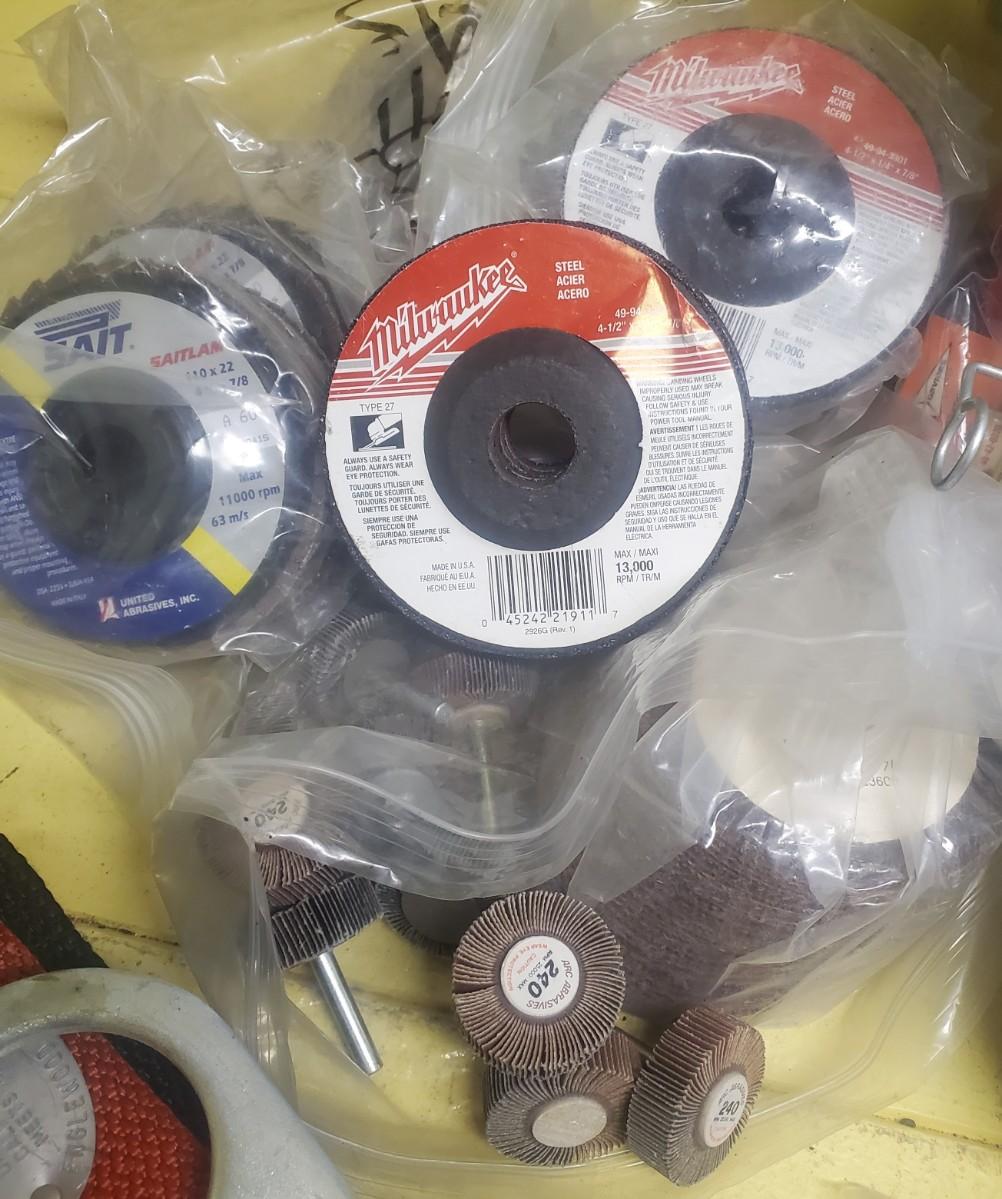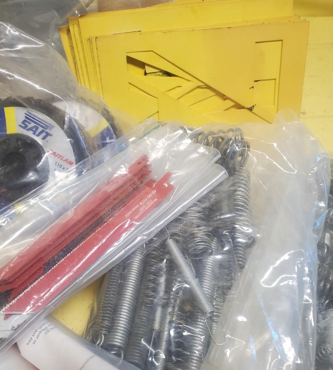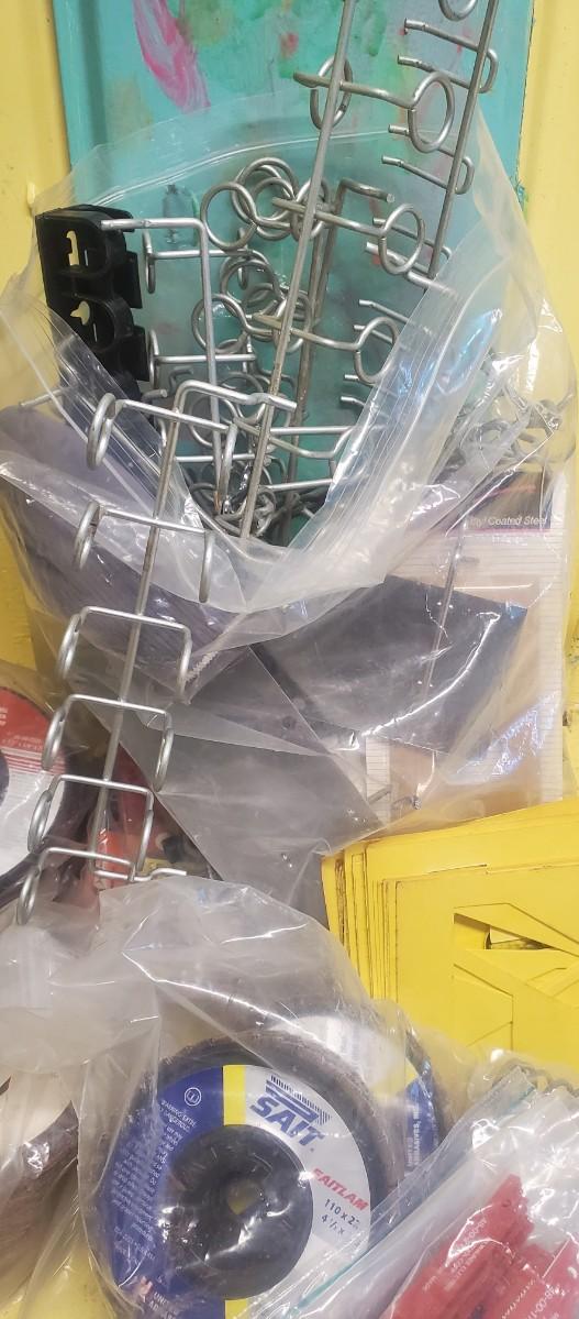 Tote lot! Peg hooks, grinder pads, stencils, and more. Miscellaneous washers, springs, etc.